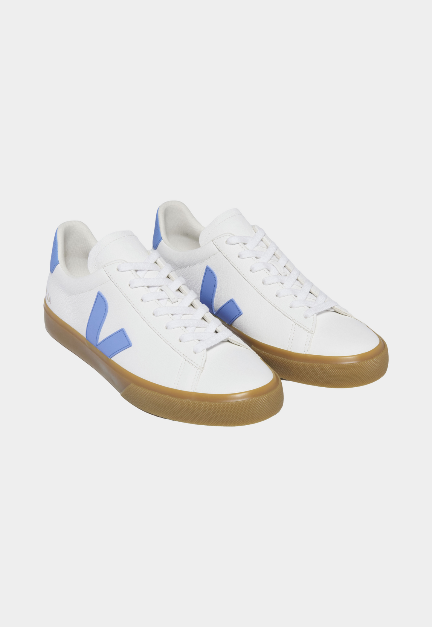 נעלי סניקרס קלאסיות מדגם קמפו של מותג הנעליים וג'ה, עשויות מחומרים אקולוגיים ועמידים. החלק העליון מציג V ממותג והוא עשוי מעור CHROMEFREE, שמעובד בתהליך המפחית את השימוש בכימיקלים, אנרגיה ומים. הסוליה עשויה מגומי ממוחזר מיערות האמזונס.