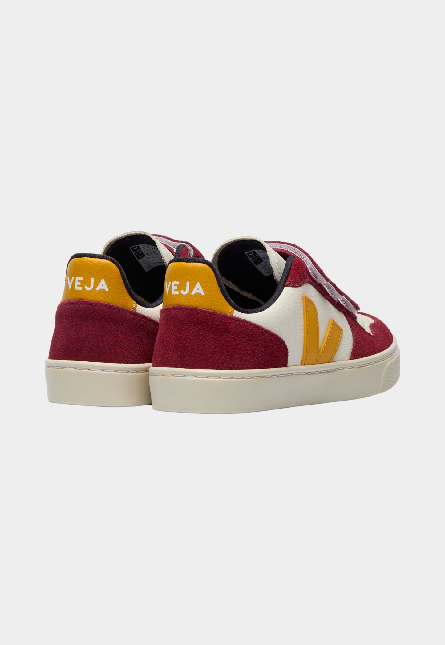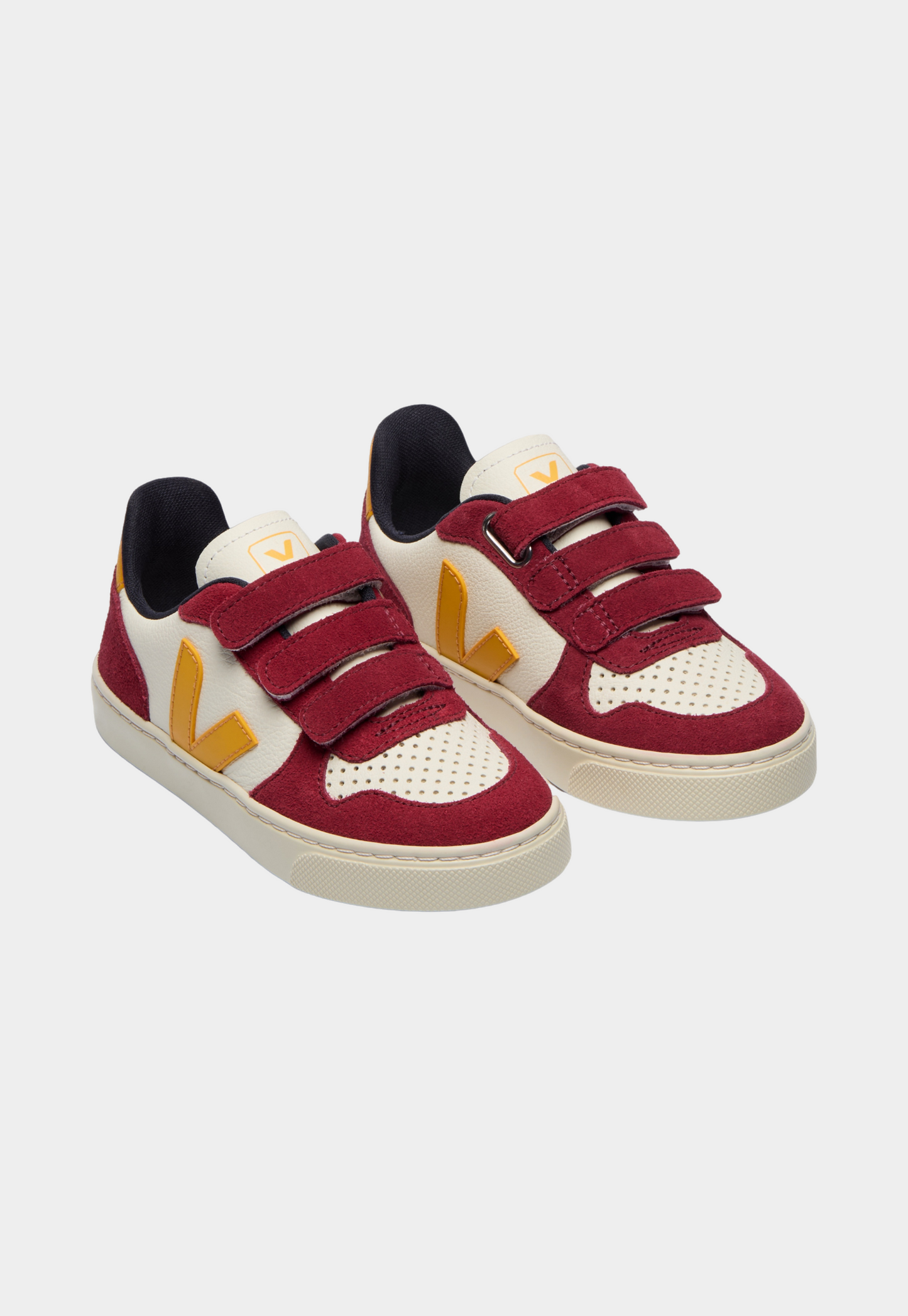 נעלי סניקרס עם סגירת סקוצ'ים לילדים מדגם V-10 של מותג הנעליים וג'ה, עשויות מחומרים אקולוגיים ועמידים. החלק העליון מציג V ממותג והוא עשוי מעור CHROMEFREE, שמעובד בתהליך המפחית את השימוש בכימיקלים, אנרגיה ומים. הסוליה עשויה מגומי ממוחזר מיערות האמזונס.