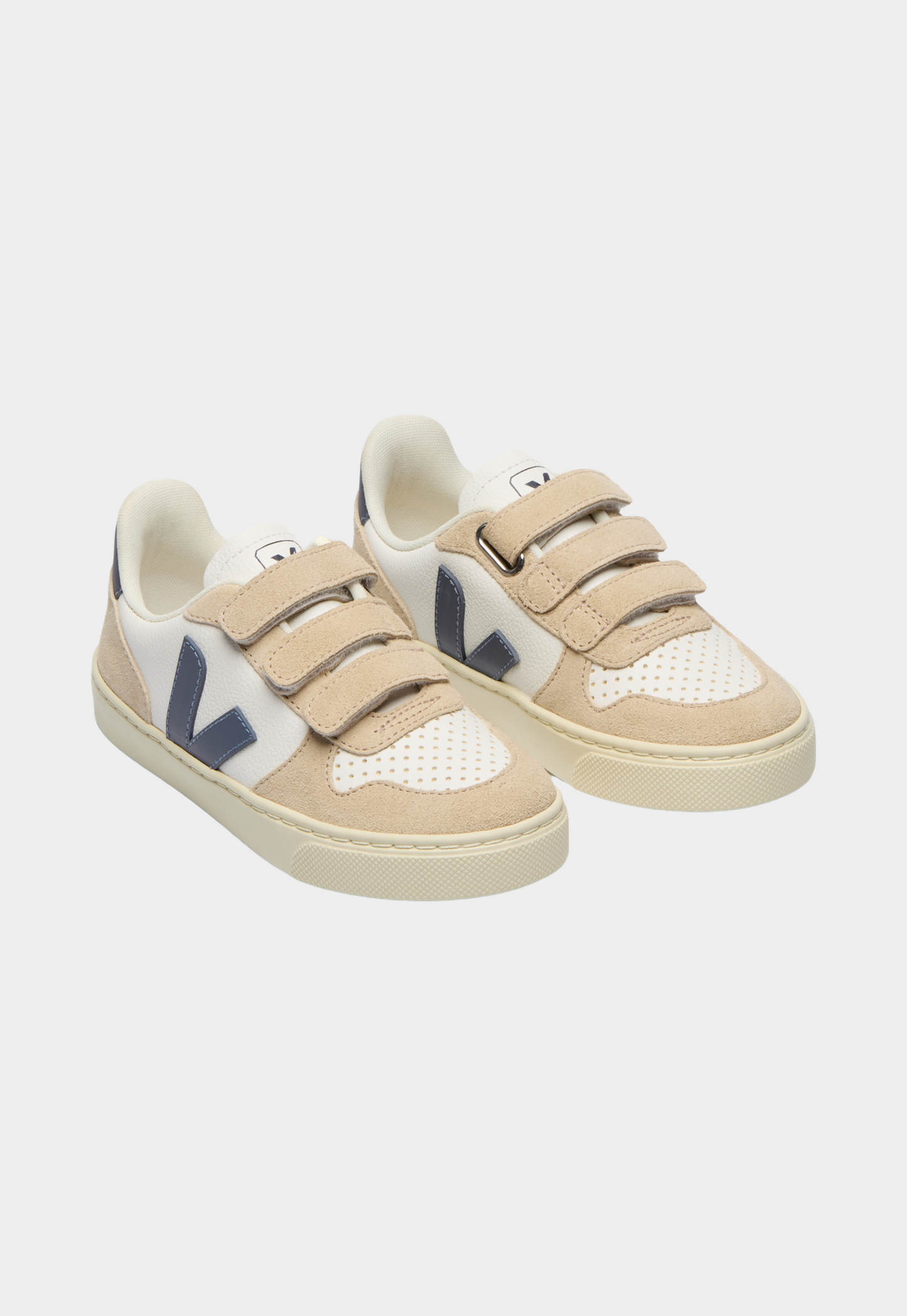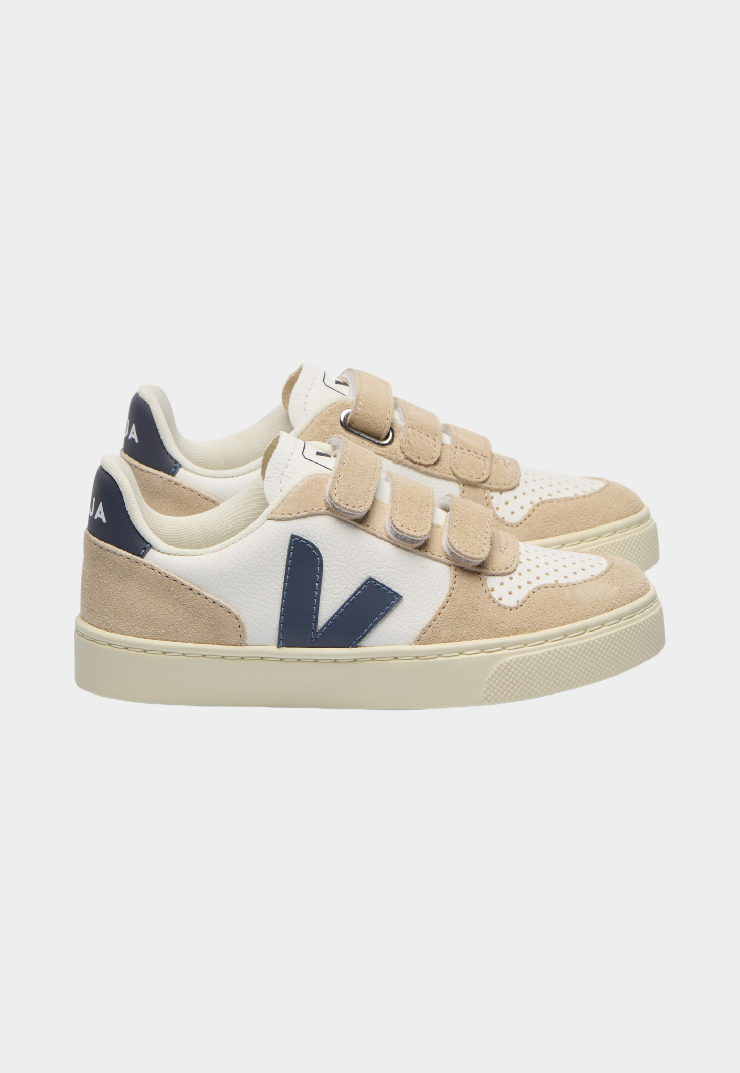 נעלי סניקרס עם סגירת סקוצ'ים לילדים מדגם V-10 של מותג הנעליים וג'ה, עשויות מחומרים אקולוגיים ועמידים. החלק העליון מציג V ממותג והוא עשוי מעור CHROMEFREE, שמעובד בתהליך המפחית את השימוש בכימיקלים, אנרגיה ומים. הסוליה עשויה מגומי ממוחזר מיערות האמזונס.