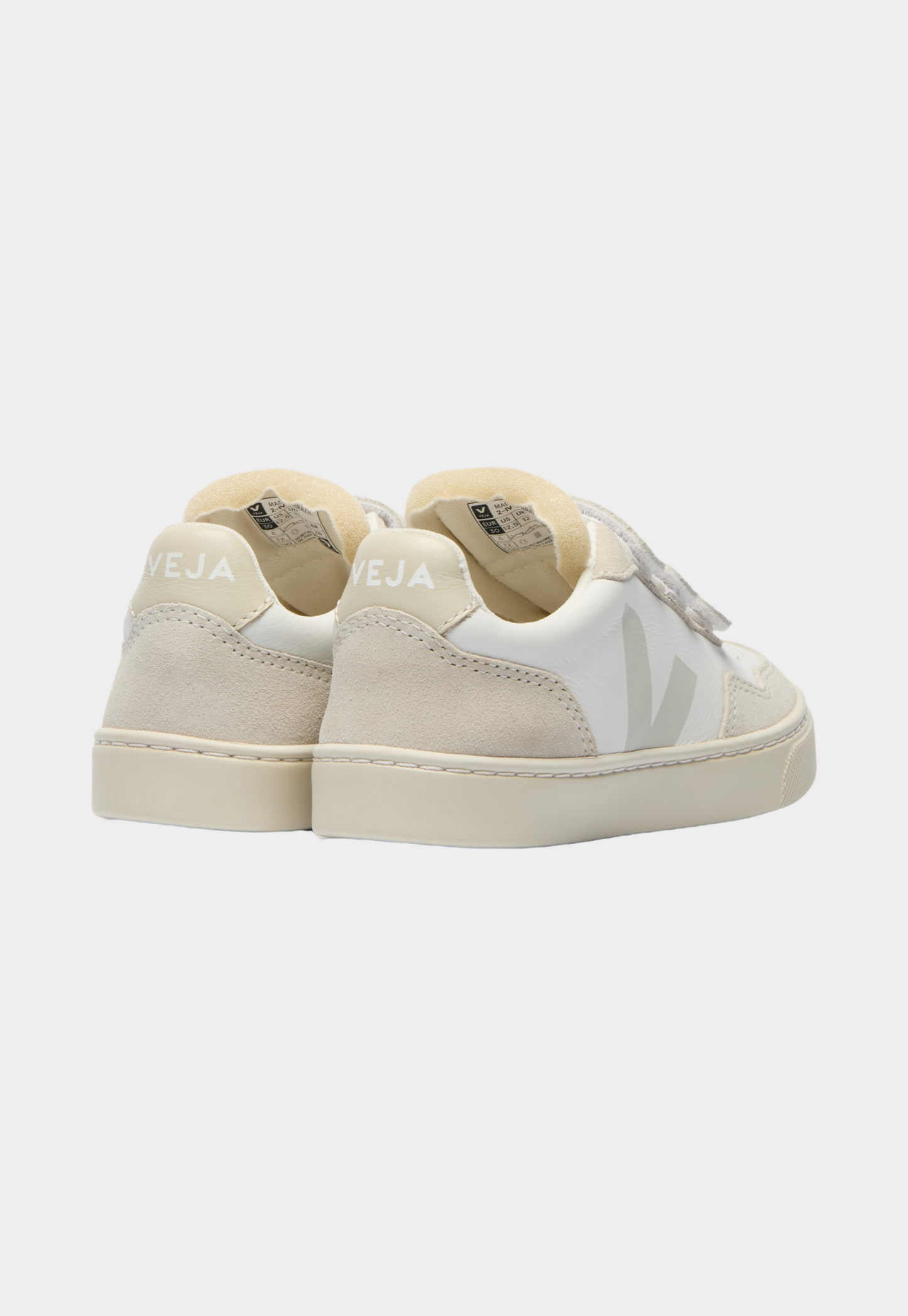 סניקרס קלאסיות לילדים של המותג וג'ה. הנעליים עשויות מחומרים אקולוגיים ועמידים – החלק העליון עשוי מעור והסוליה עשויה מגומי ממוחזר מהאמזונס. לוגו המותג V מופיע בצידי הנעליים.
