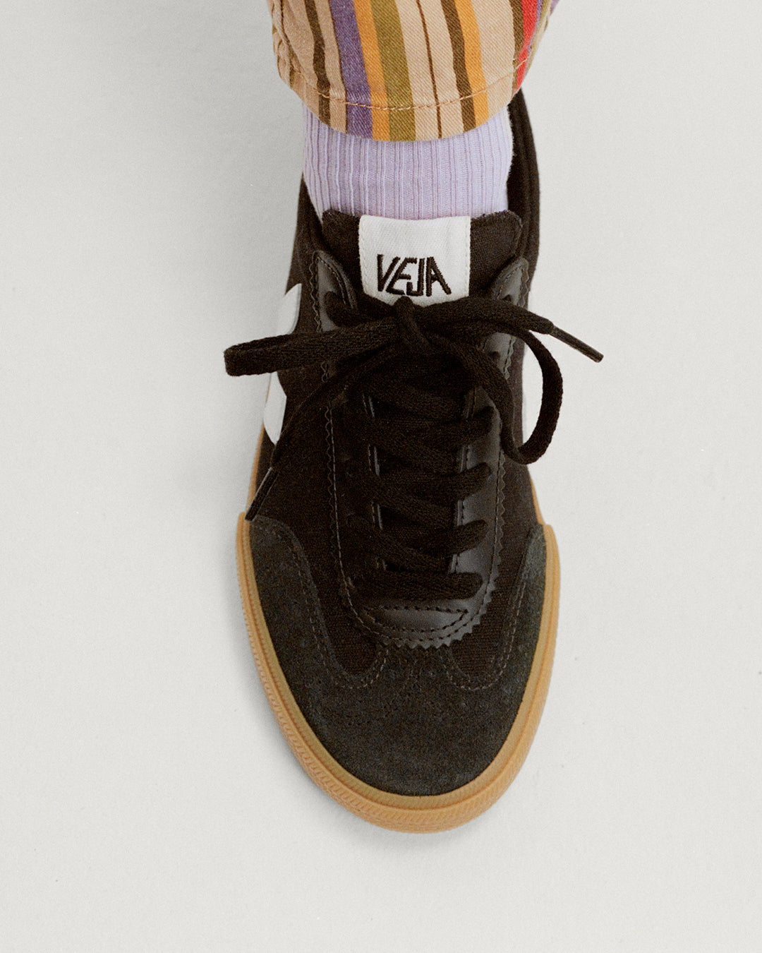 הנעליים עשויות קנבס בשילוב זמש בחלק הקדמי, עם סוליית גומי שטוחה, ולוגו וי עשוי עור בצדדים.