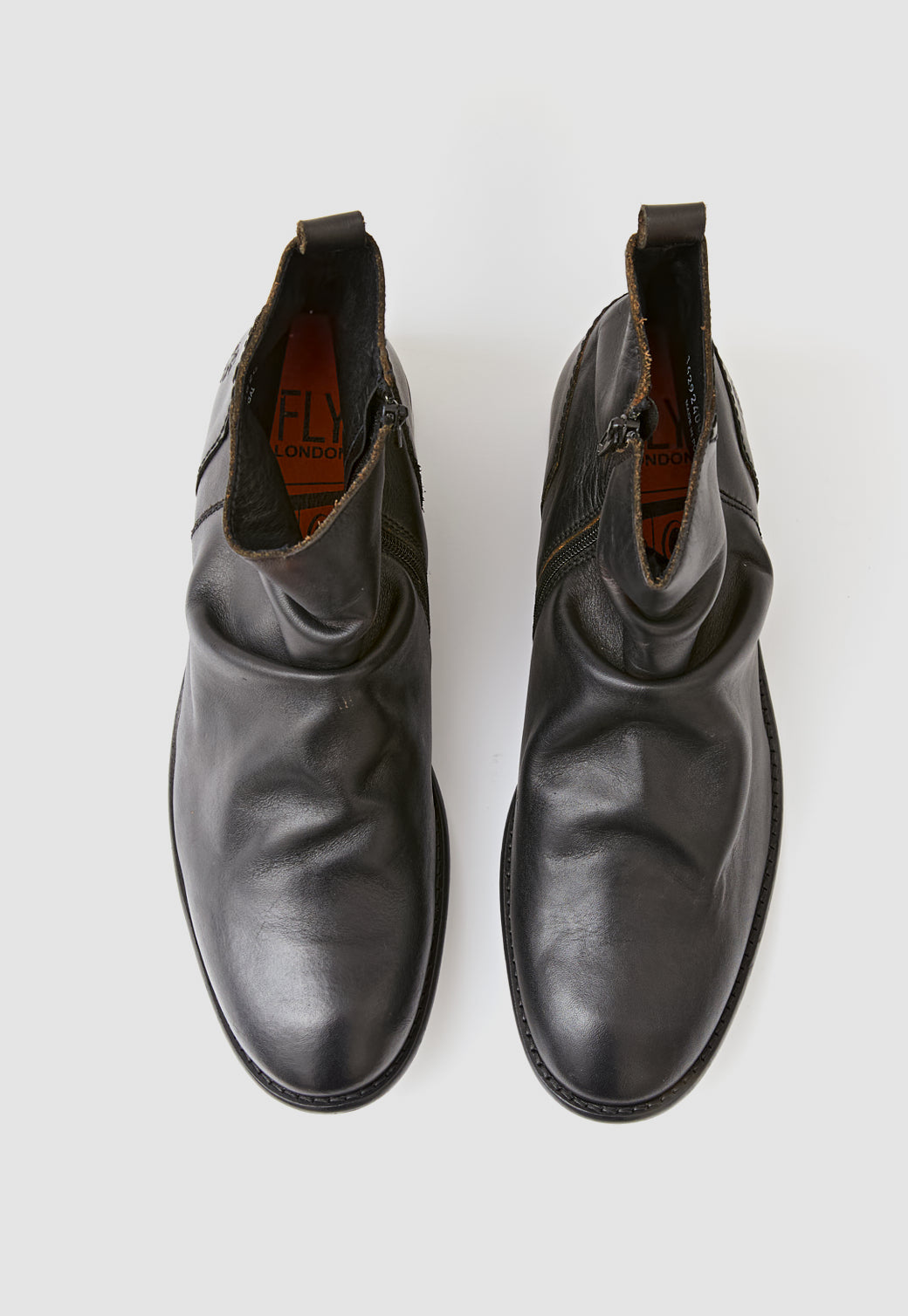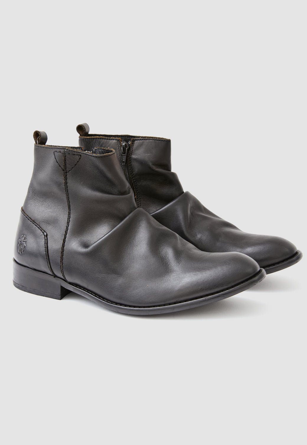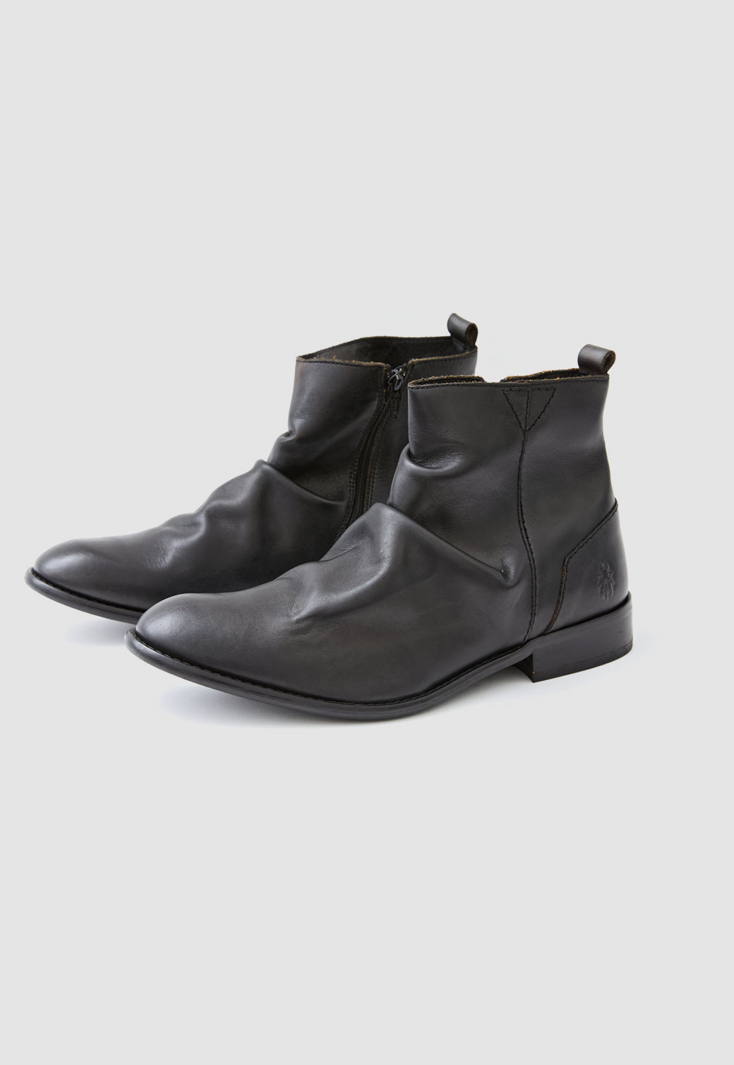 מגפיים של המותג פליי לונדון, עשויים עור במראה מקומט. סוליה בעבודת יד.