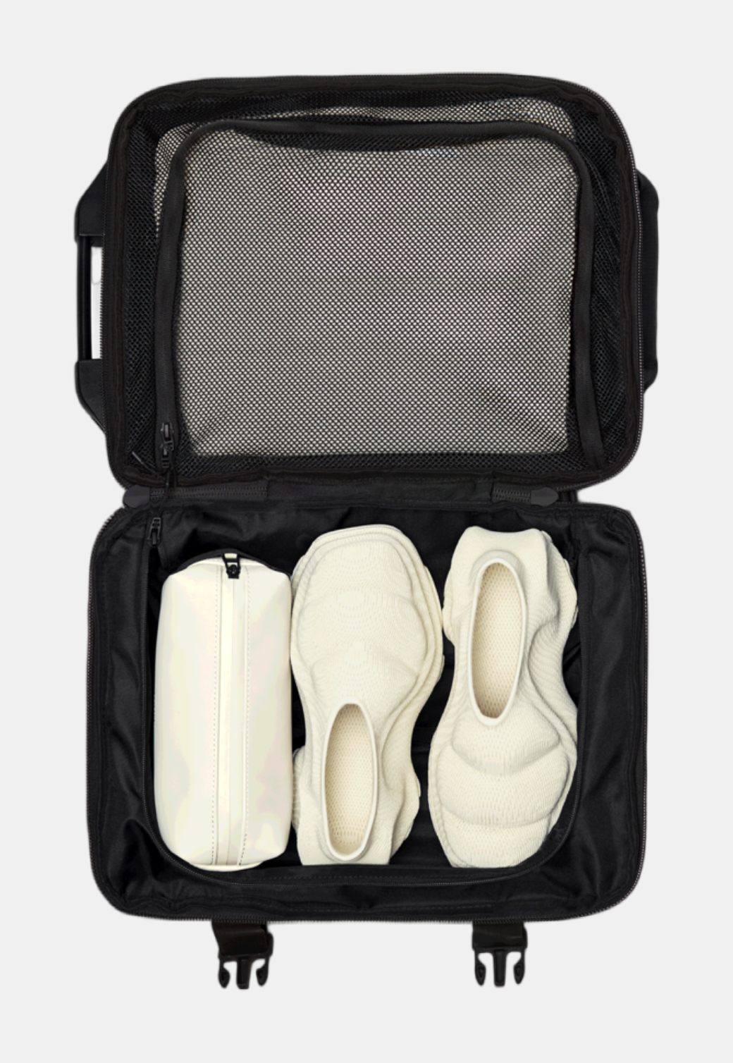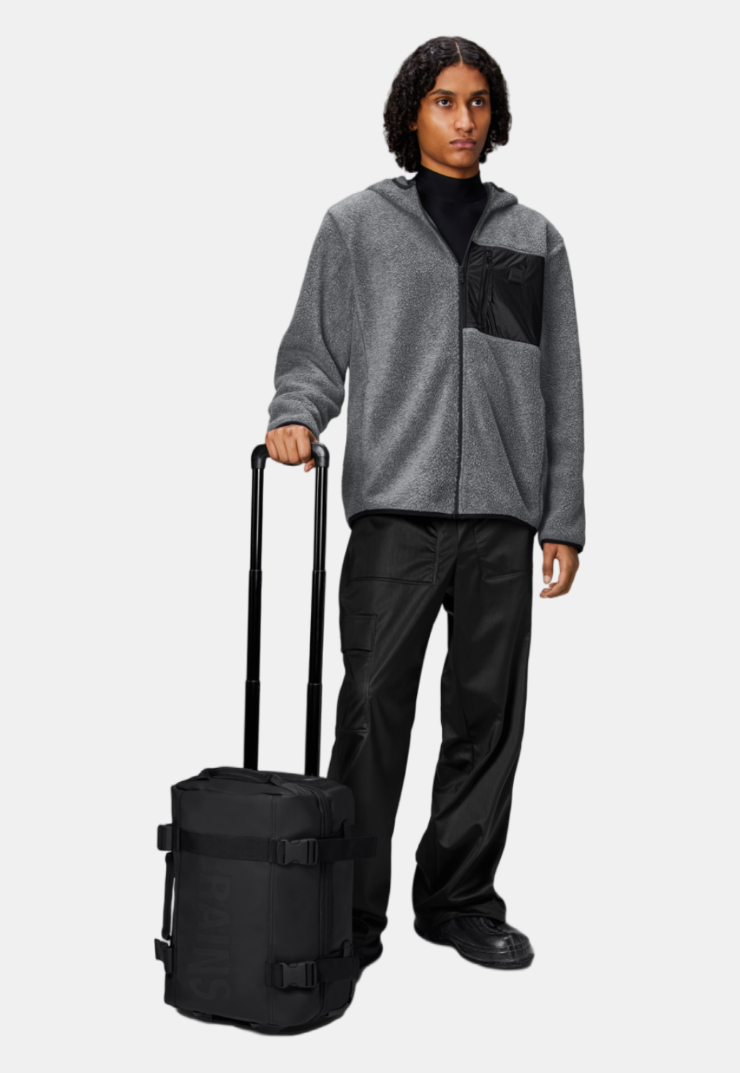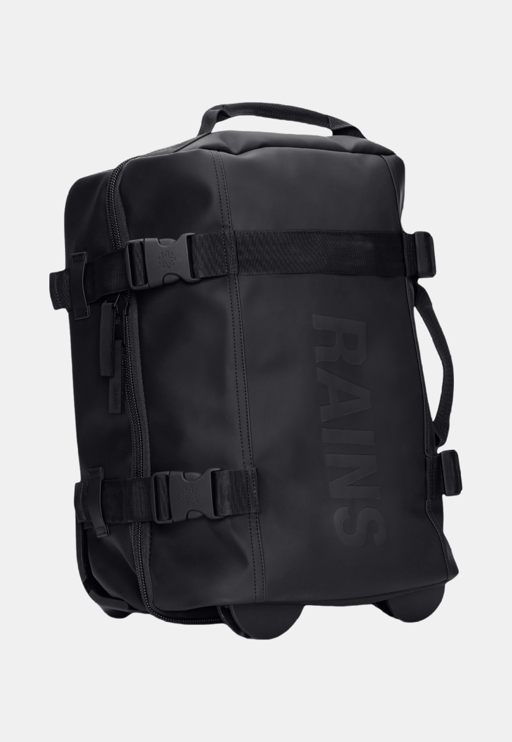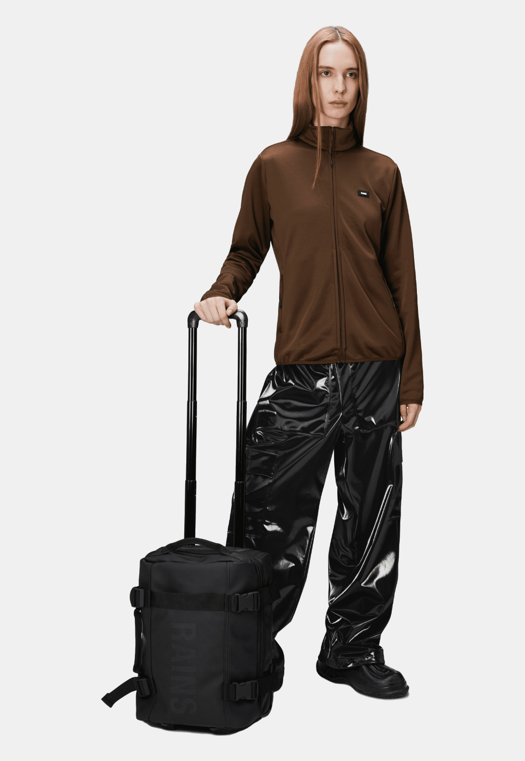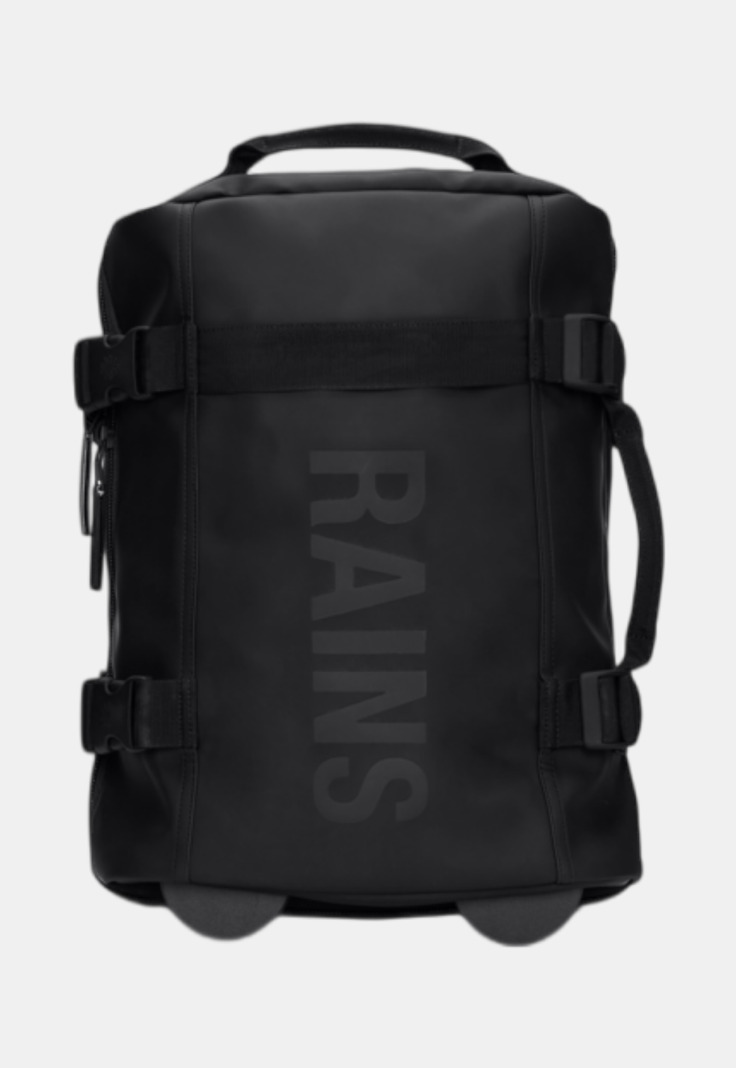 מזוודה מבית המותג ריינס. עשויה מבד עמיד בגשם קל, בגודל מיני מושלם לנסיעות. למזוודה שני תאים מרכזיים, ידית אחיזה וגלגלים. בשילוב לוגו של המותג בפרונט.