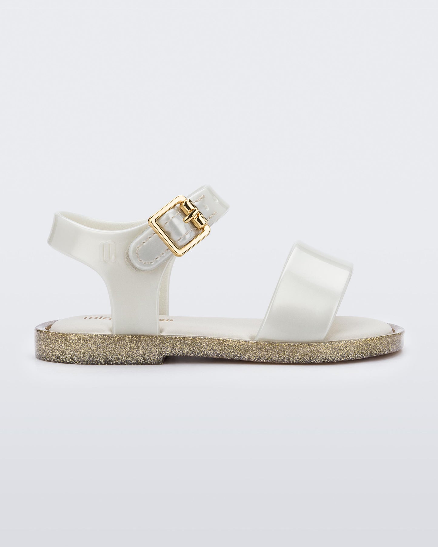 סנדלים לתינוקות מבית המותג מליסה. עם סוליה שטוחה ורצועה קדמית, בסגירת אבזם. בצבע סגלגל מעט שקוף.