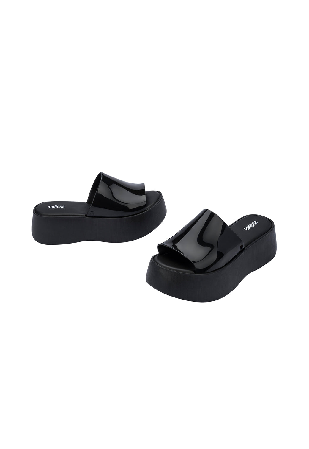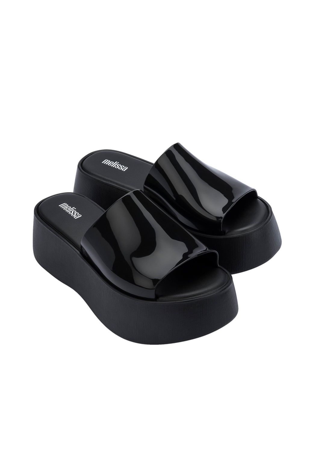 כפכפי פלטפורמה של המותג מליסה עם רצועה עבה בחזית. עשויות מהגומי הממוחזר המפורסם של מליסה עם הריח המתוק האופייני למותג.