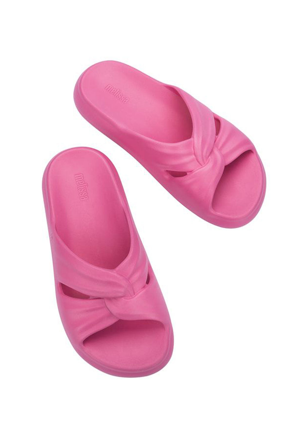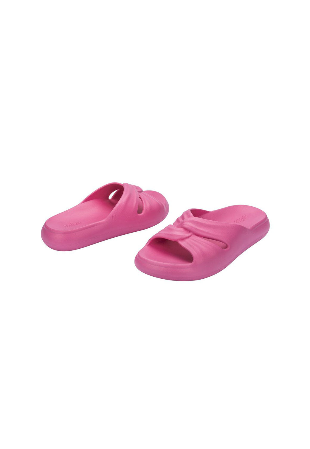 כפכפי סלייד של מליסה עם דוגמת קשר מלפנים. הכפכפים עשויים מהגומי הממוחזר של מליסה, בתוספת הריח המתוק האופייני למותג.