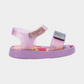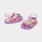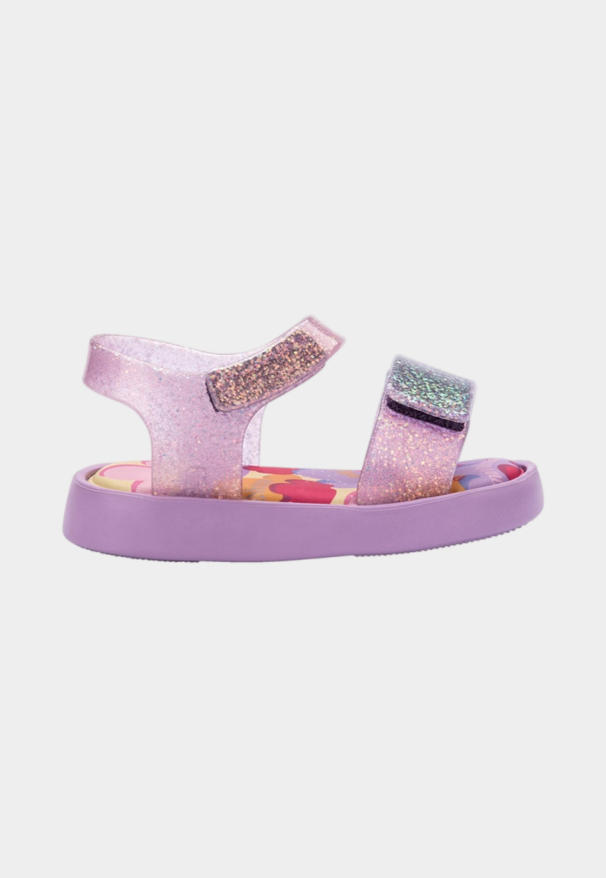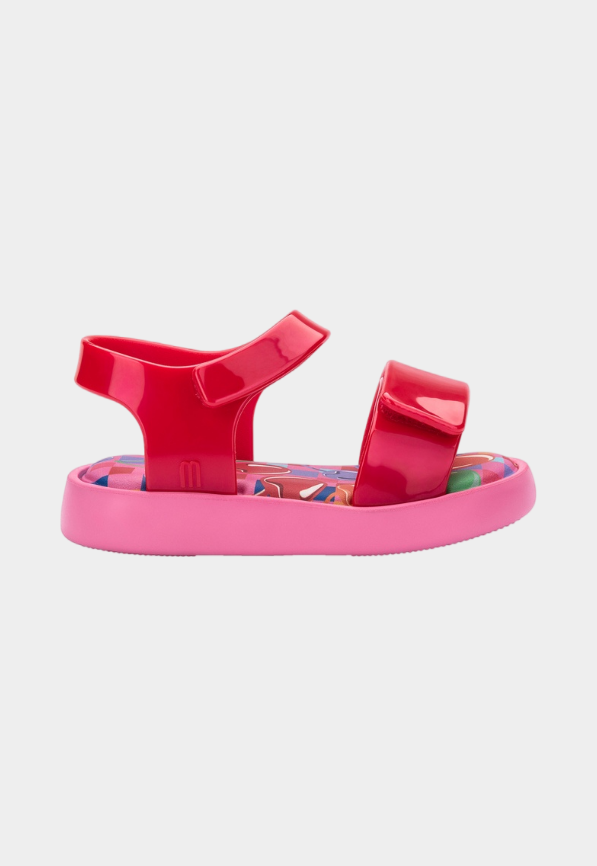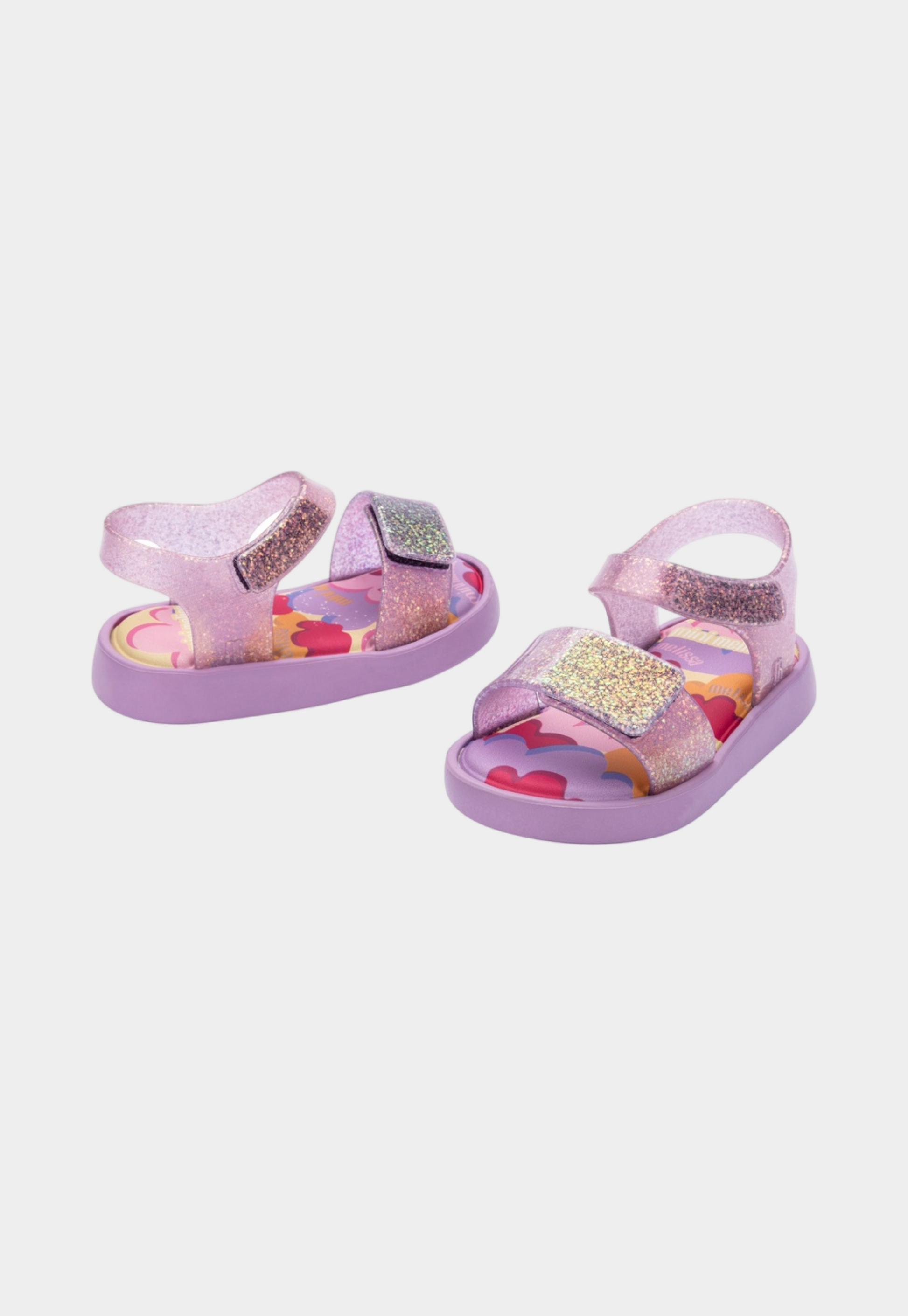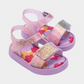 סנדלים לילדים של מיני מליסה. עם איורי לבבות הסנדלים עשויים מהגומי הממוחזר המפורסם של מליסה, בעלי רצועה קדמית ואחורית בגימור מבריק שנסגרות בסקוץ', בתוספת הריח המתוק האופייני למותג.