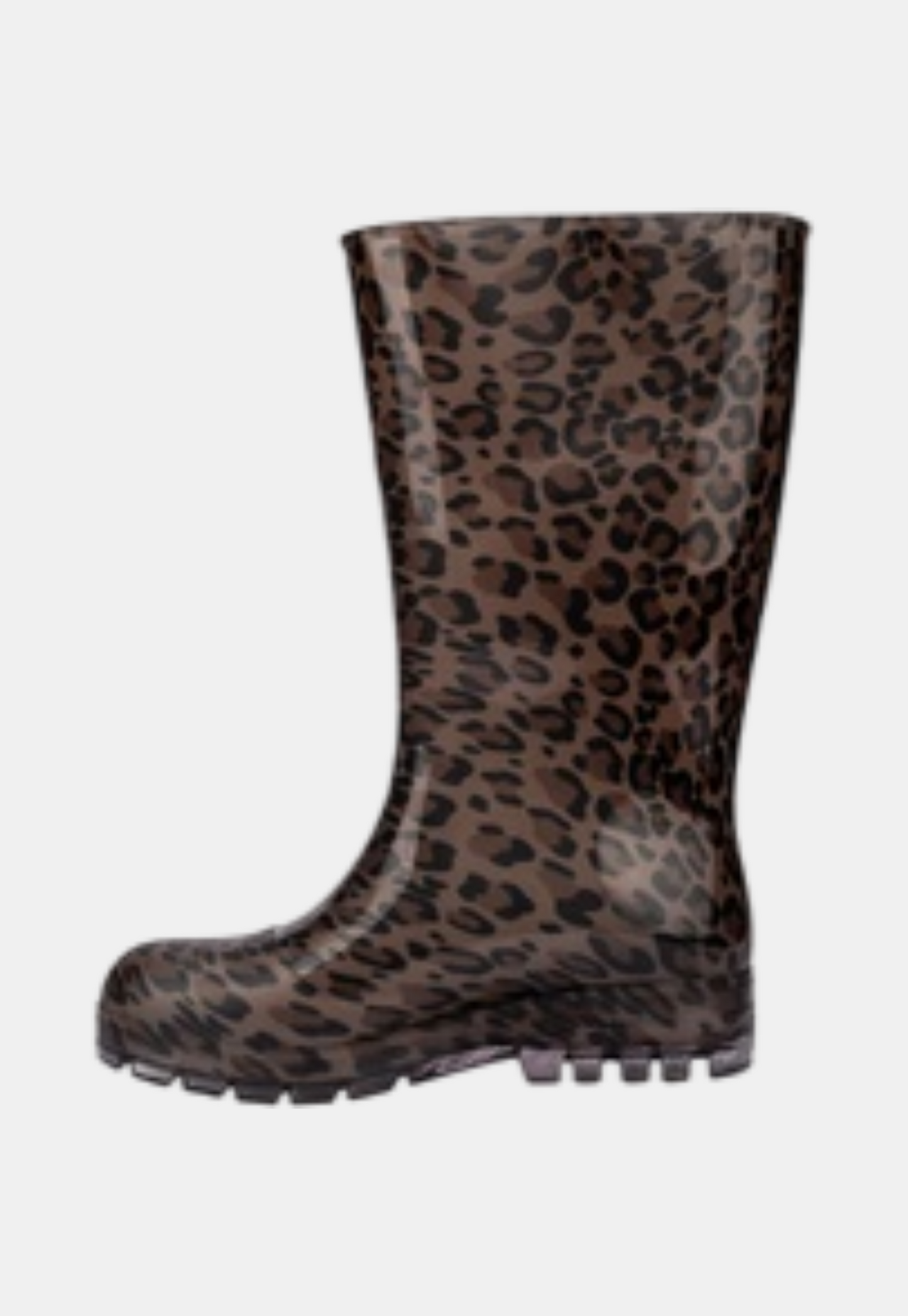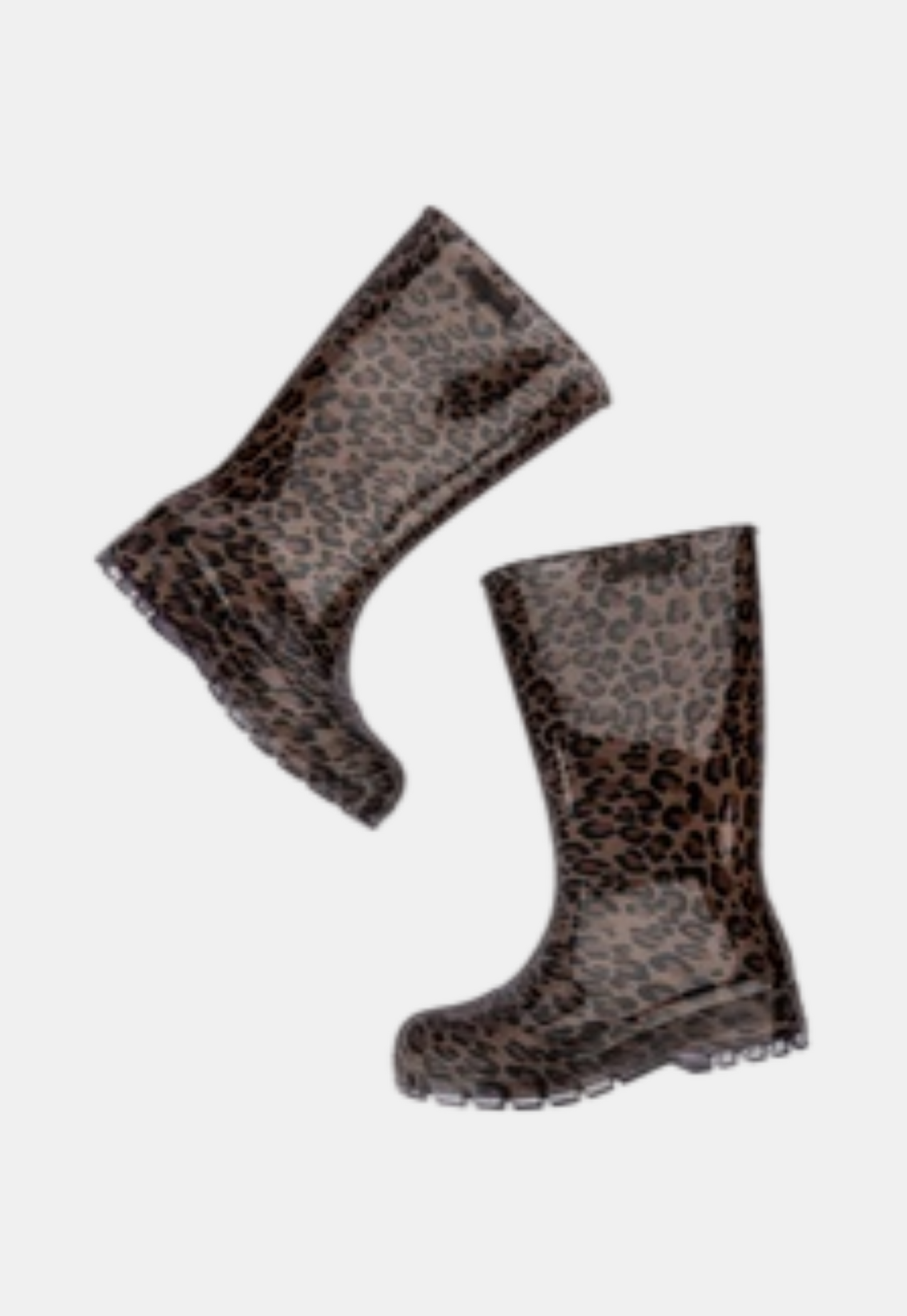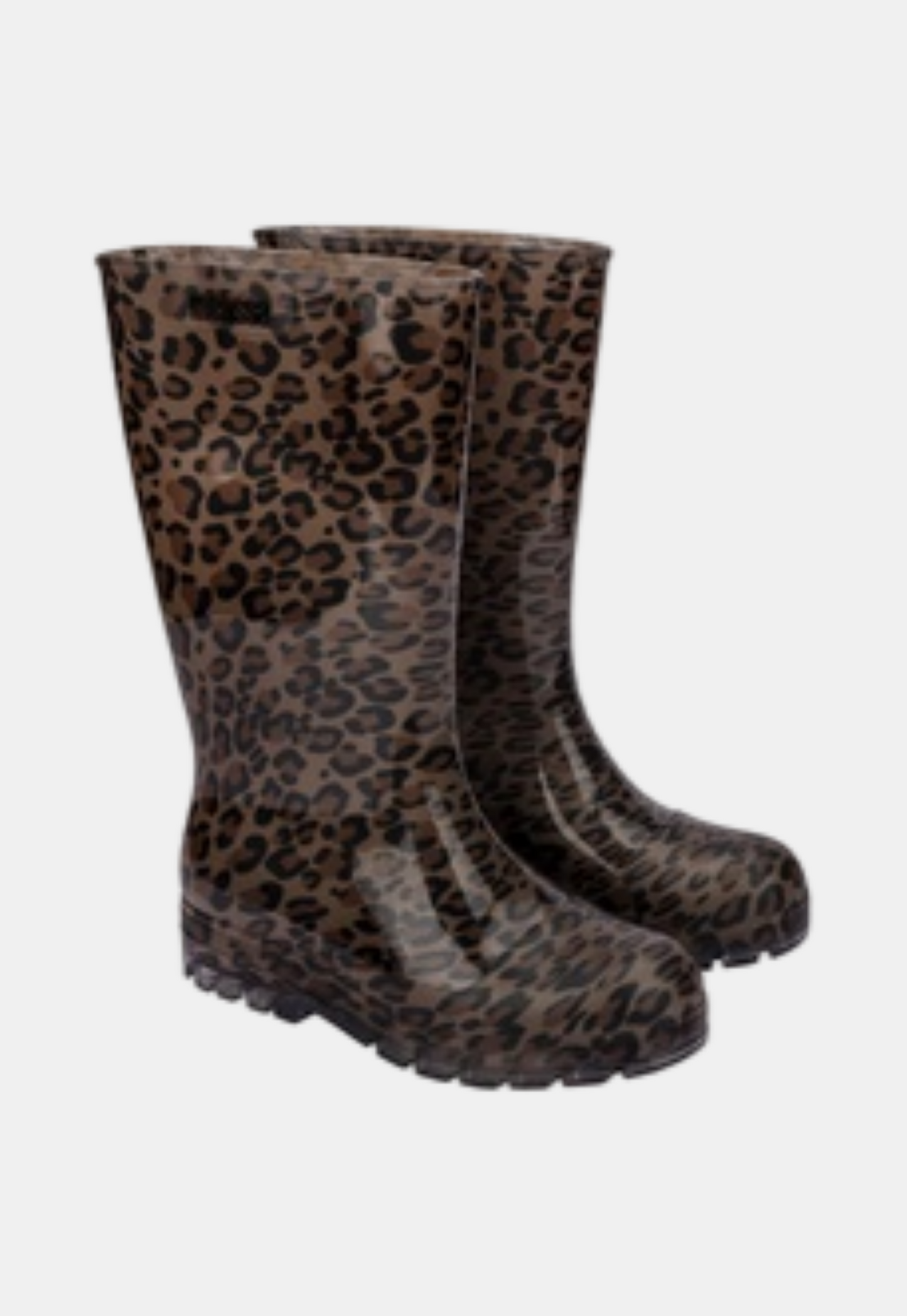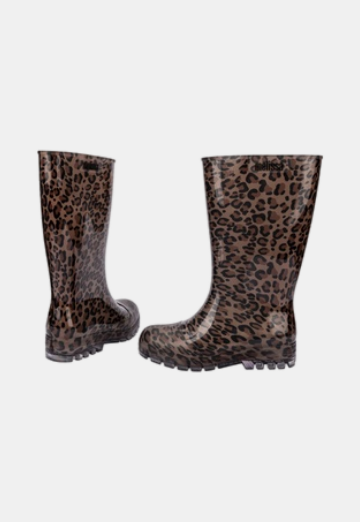 מגפי גשם לנשים מבית המותג מליסה. בגזרה גבוהה עם לוגו של המותג בצדדים החיצוניים, הדפס מנומר אול אובר, וסוליה משוננת.