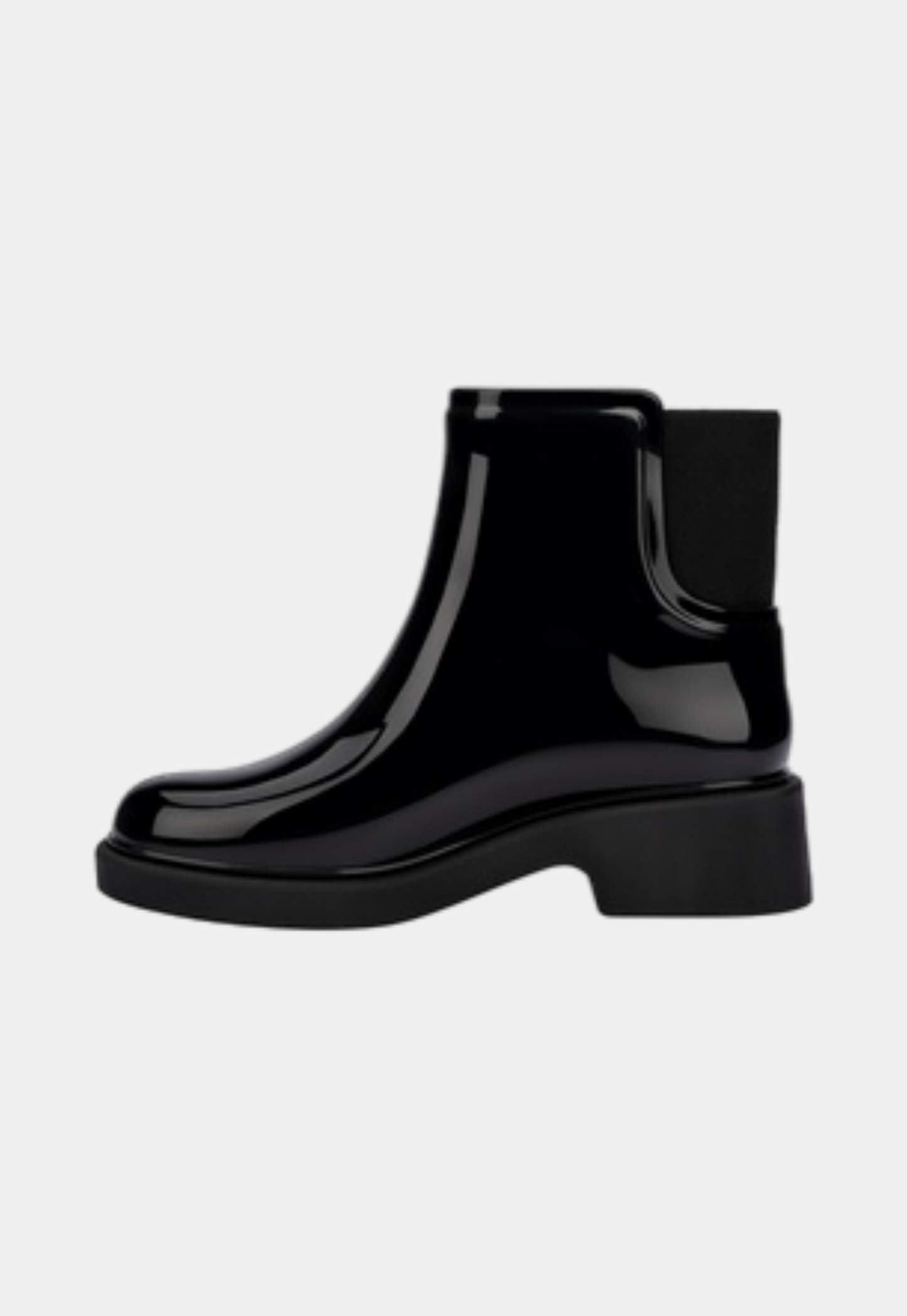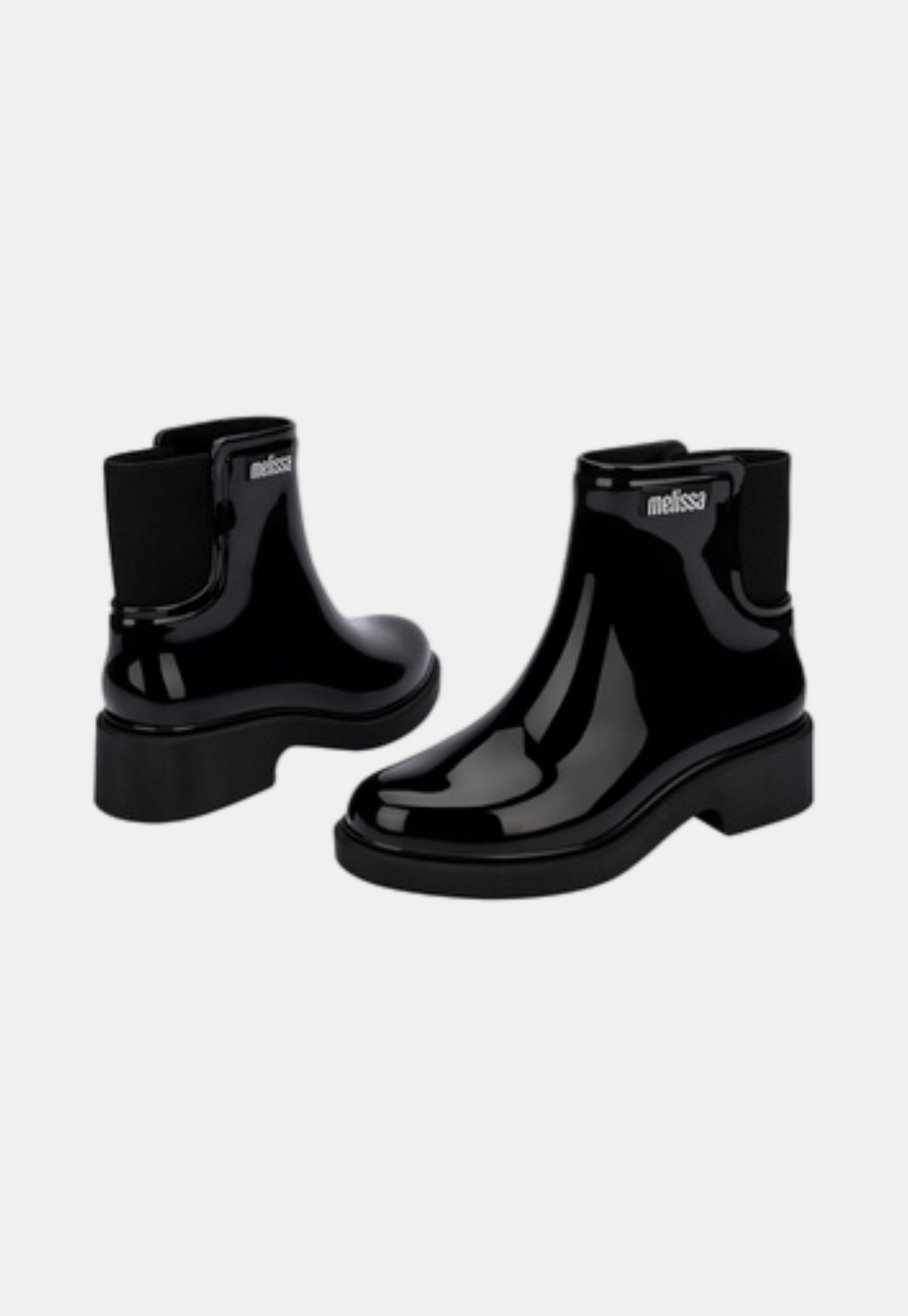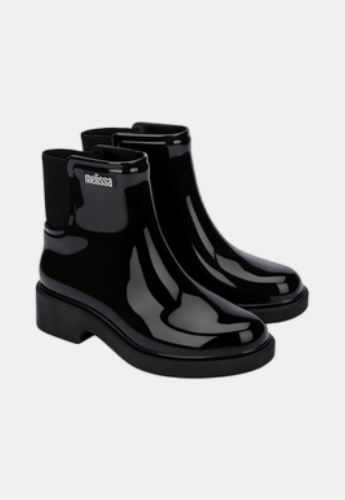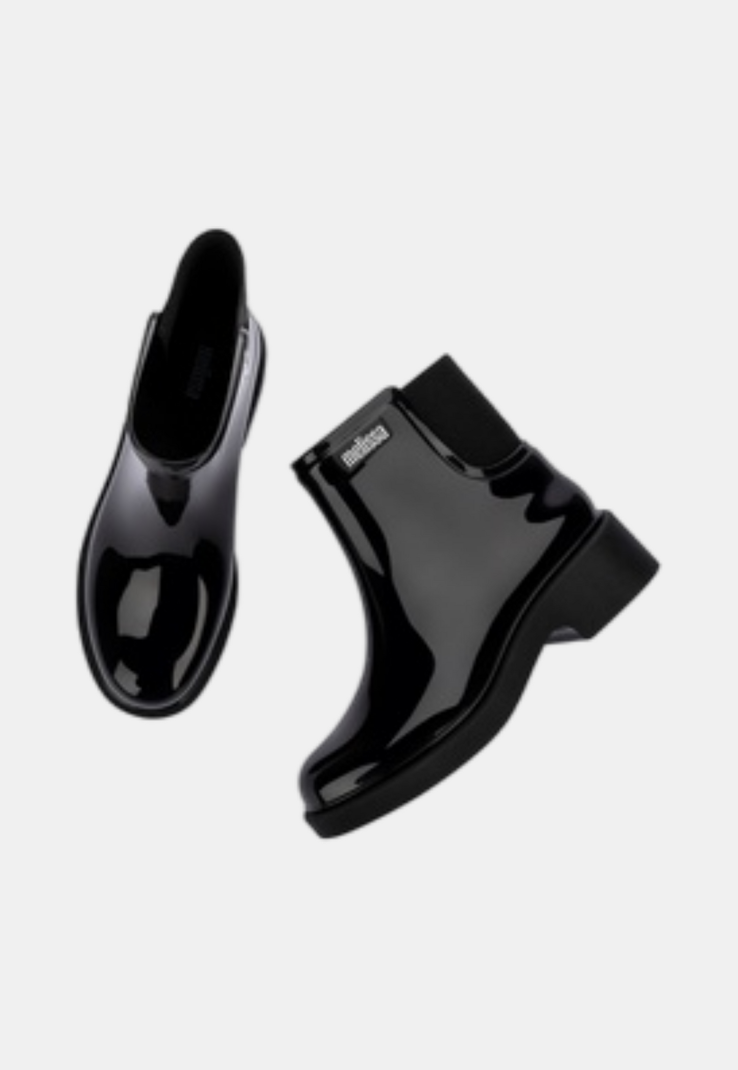מגפי גשם לנשים מבית המותג מליסה, בגזרה נמוכה עם עקב קטן. עשויות גומי עמיד למים בגימור מבריק, עם לוגו של המותג בצד החיצוני.