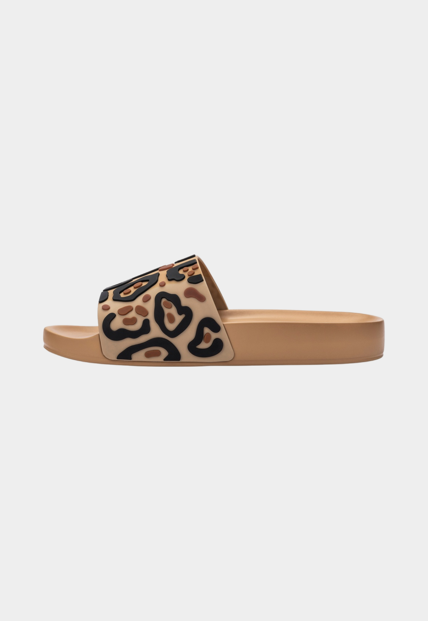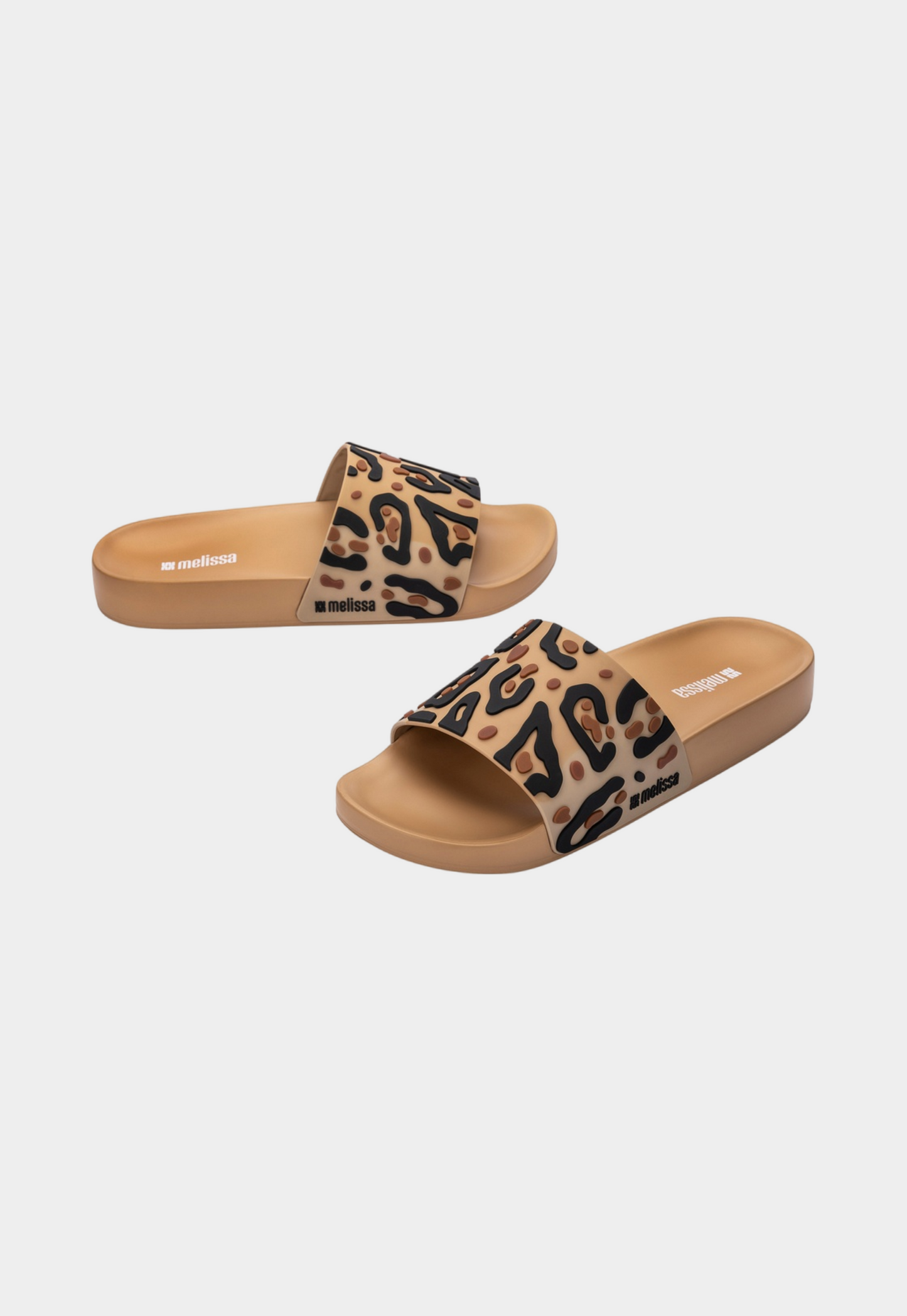 כפכפי סלייד לנשים מבית המותג מליסה. מעוצבים עם רצועה קדמית רחבה מלפנים בהדפס מנומר. הכפכפים עשויים מהגומי הממוחזר של מליסה עם הריח המתוק האופייני למותג.