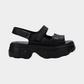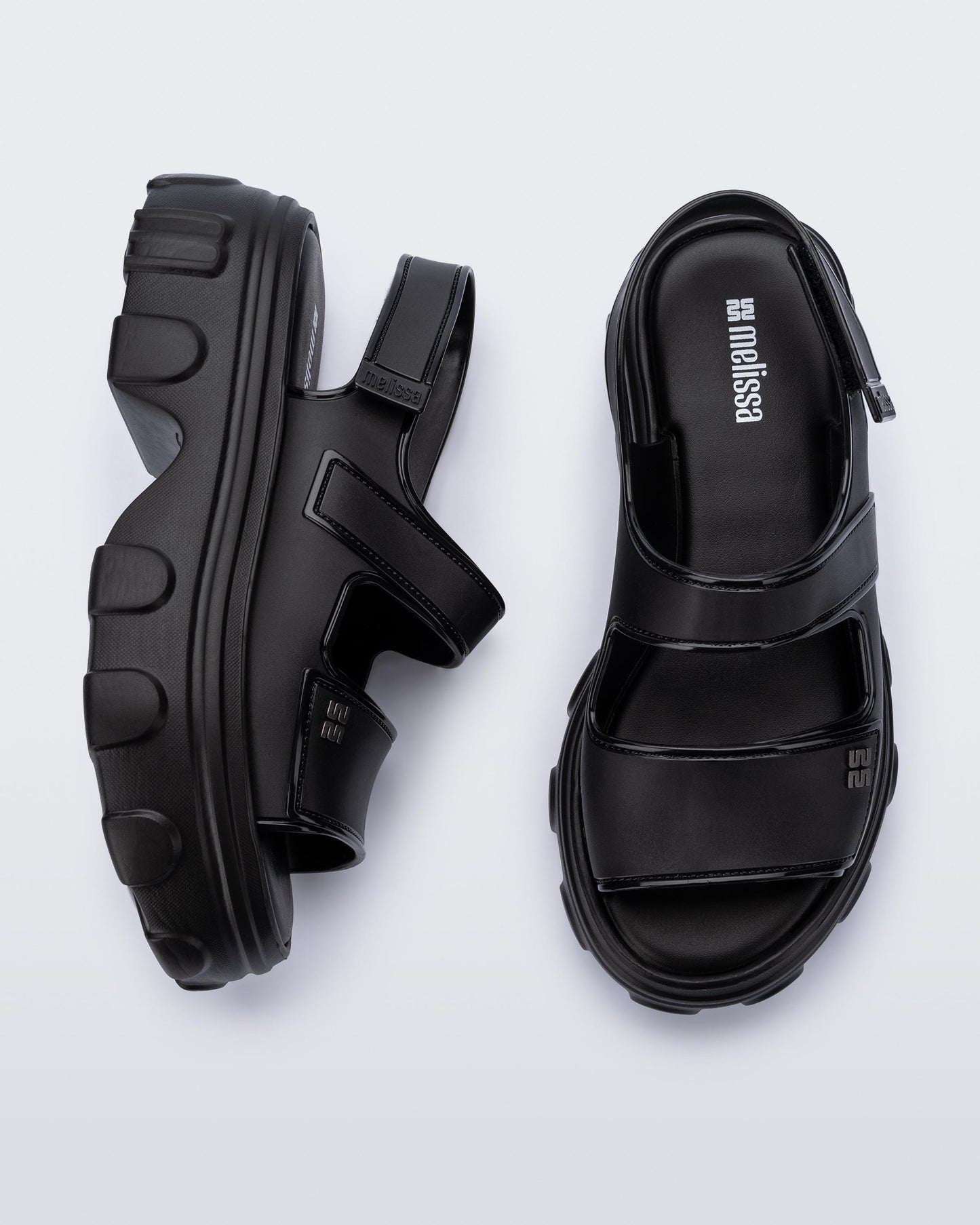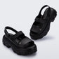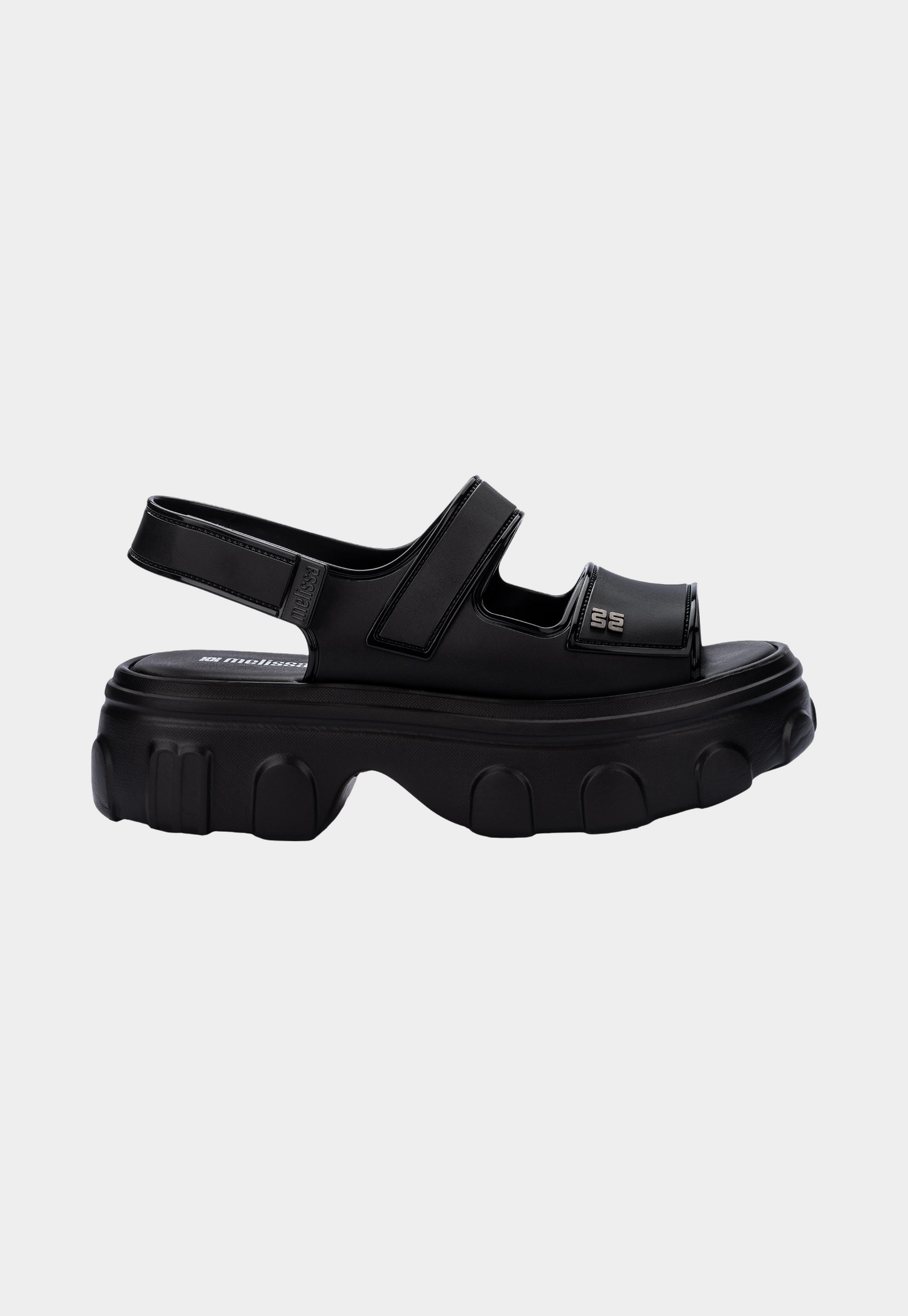 סנדלי פלטפורמה לנשים מבית המותג מליסה, עשויות גומי. החלק העליון מציג שתי רצועות עבות,, עם רצועה אחורית בסגירת סקוץ'. עם סוליית גומי בשילוב עקב צ'אנקי.