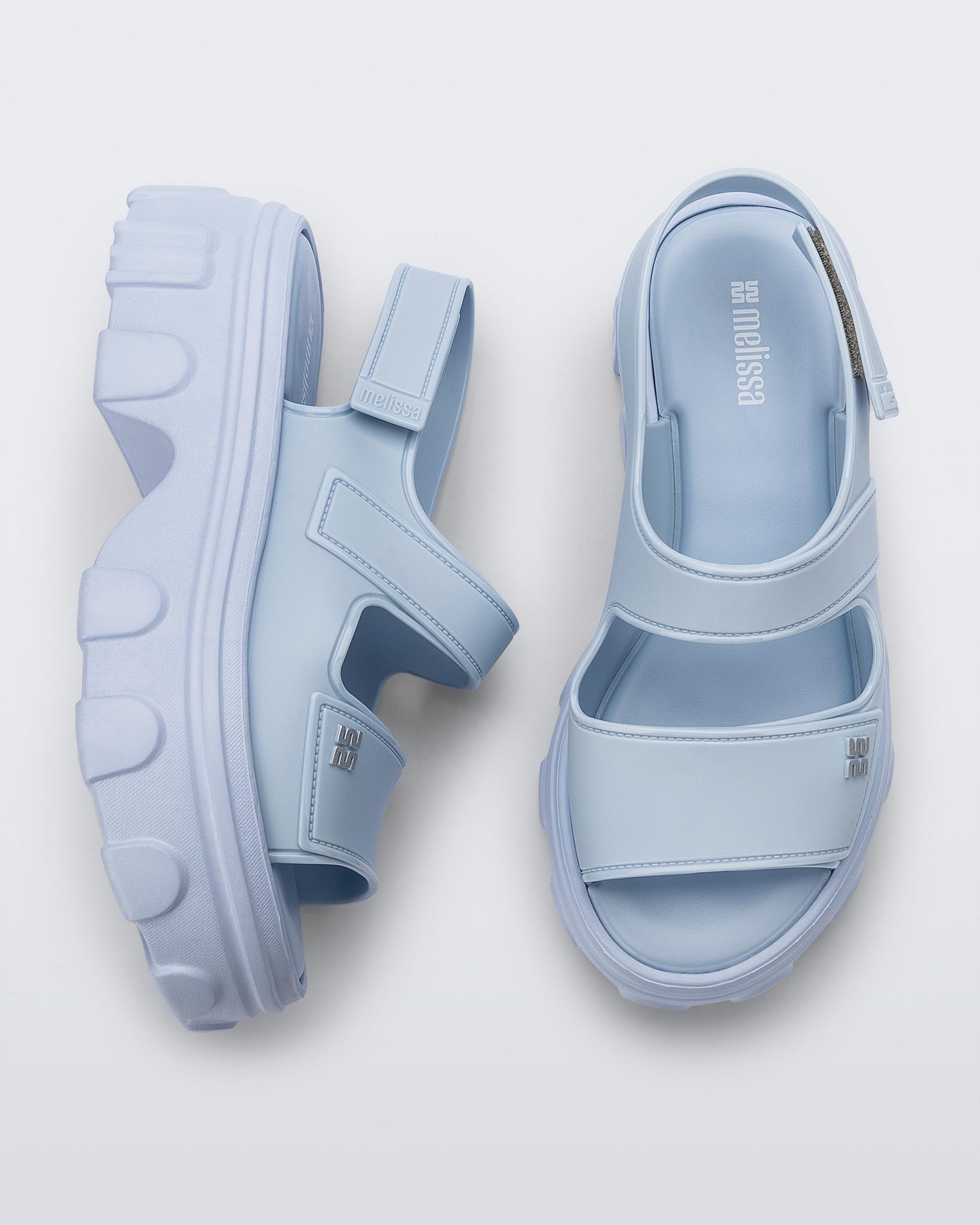 סנדלי פלטפורמה לנשים מבית המותג מליסה, עשויות גומי. החלק העליון מציג שתי רצועות עבות,, עם רצועה אחורית בסגירת סקוץ'. עם סוליית גומי בשילוב עקב צ'אנקי.