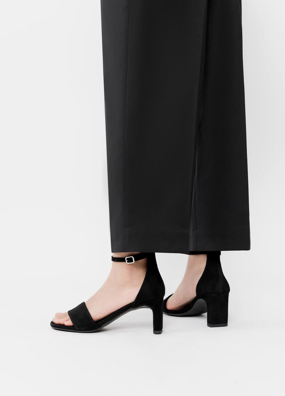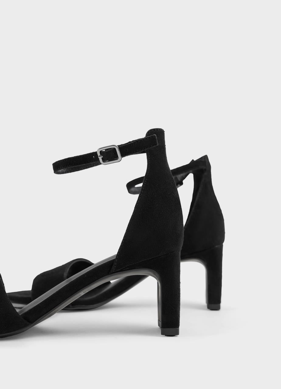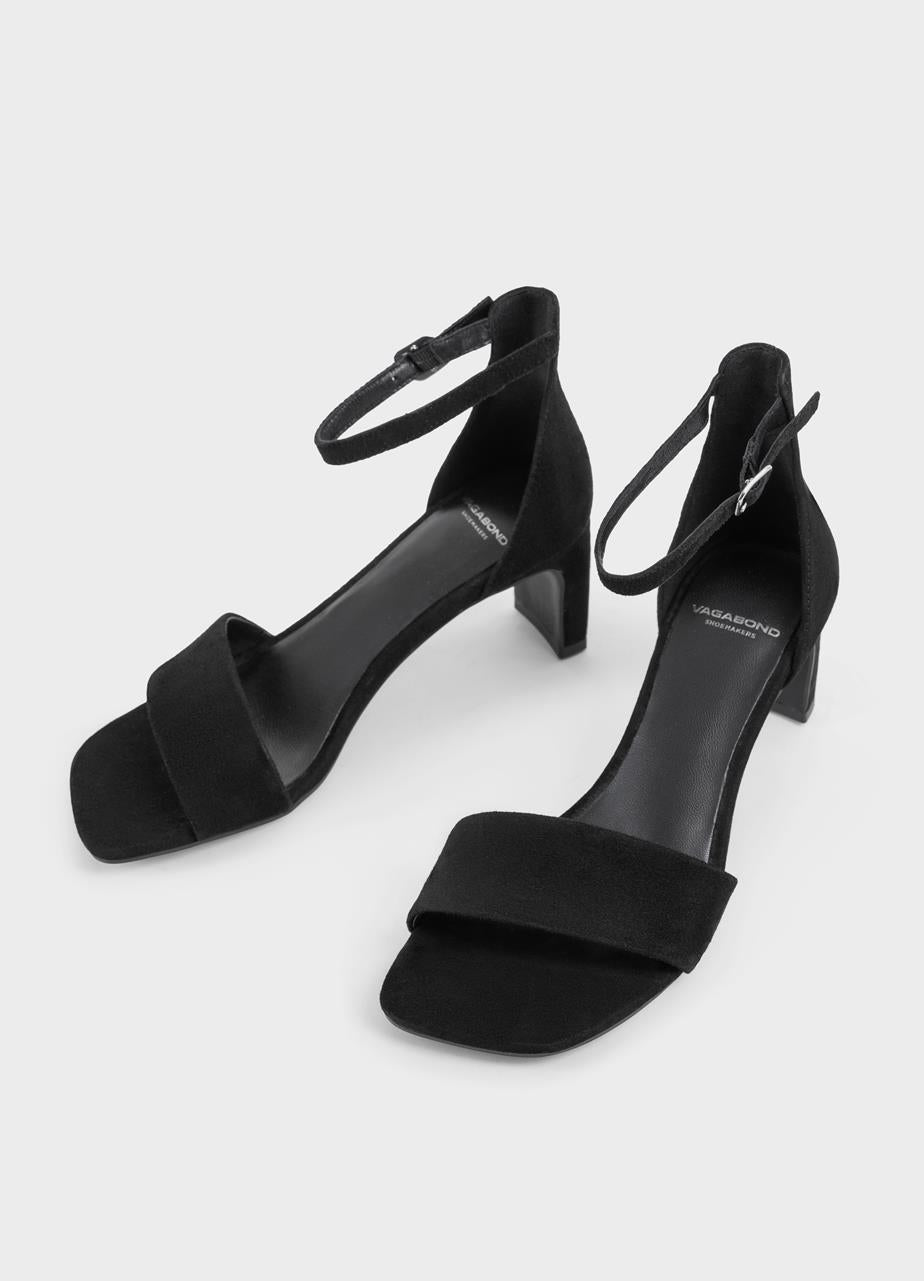 סנדלי עקב לנשים מבית המותג ואגבונד. עשויים מזמש, בלוק קלאסי ונשי עם רצועה דקה, סגירת אבזם ועקב דק בגובה 7.6 ס"מ.
