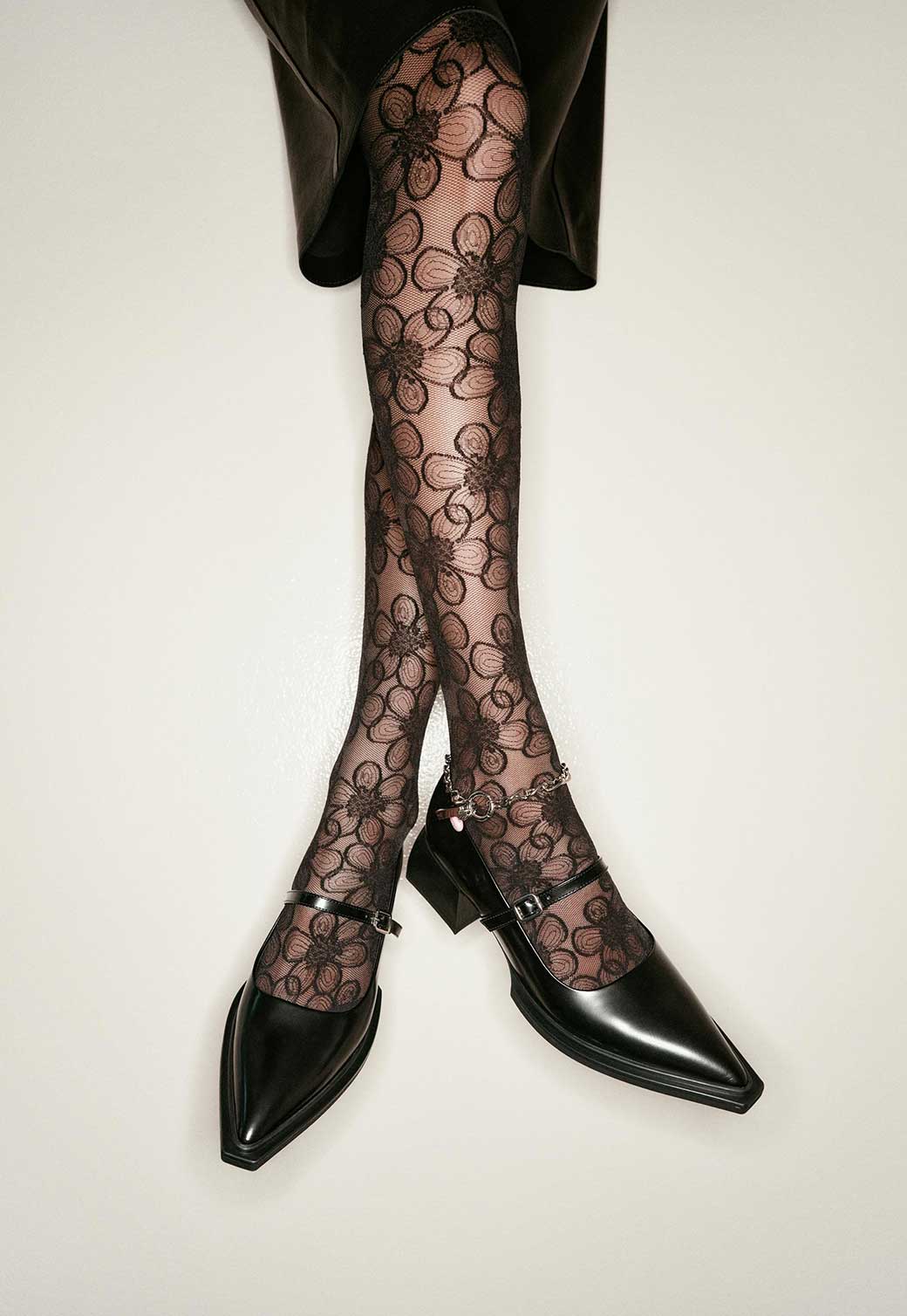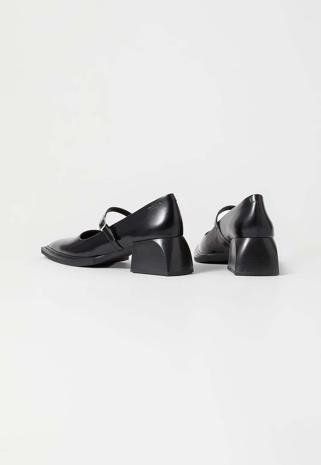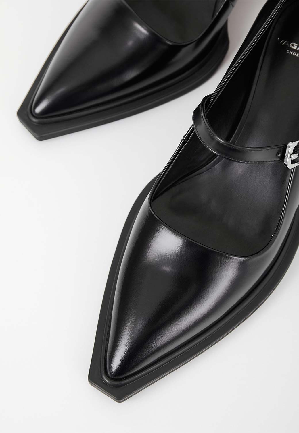 נעלי עקב לנשים מבית המותג הוגבונד, בגזרת מרי ג'יין עם סיומת שפיץ. לנעליים רצועה קדמית דקה בסגירת אבזם כסוף, ועקב צ'אנקי מרובע.