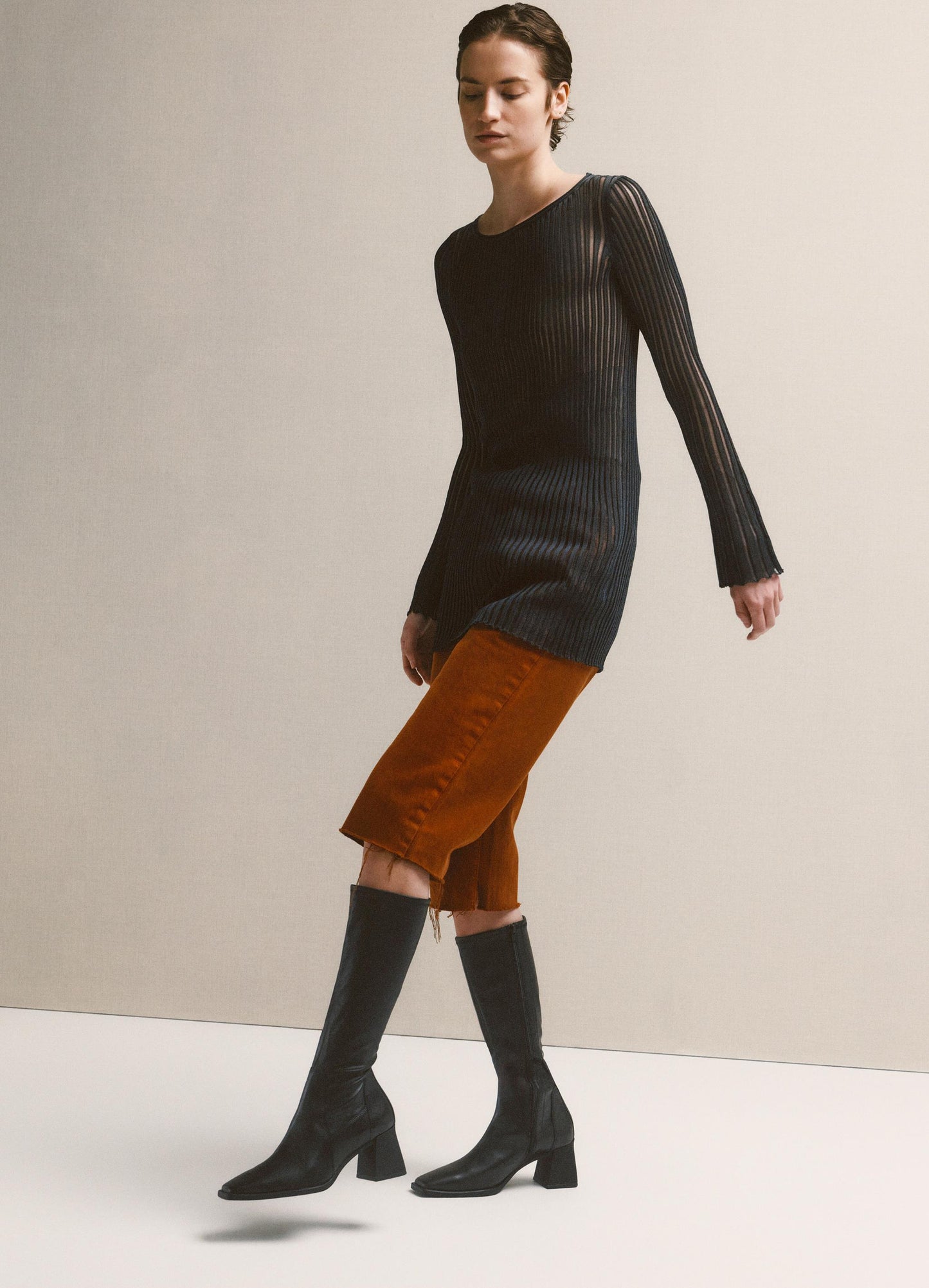 מגף גבוה וקלאסי מבית המותג וגהבונד. עשוי מעור רך ונמתח, ועם סיומת מרובעת. גובה העקב 7 ס"מ.