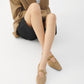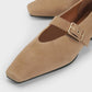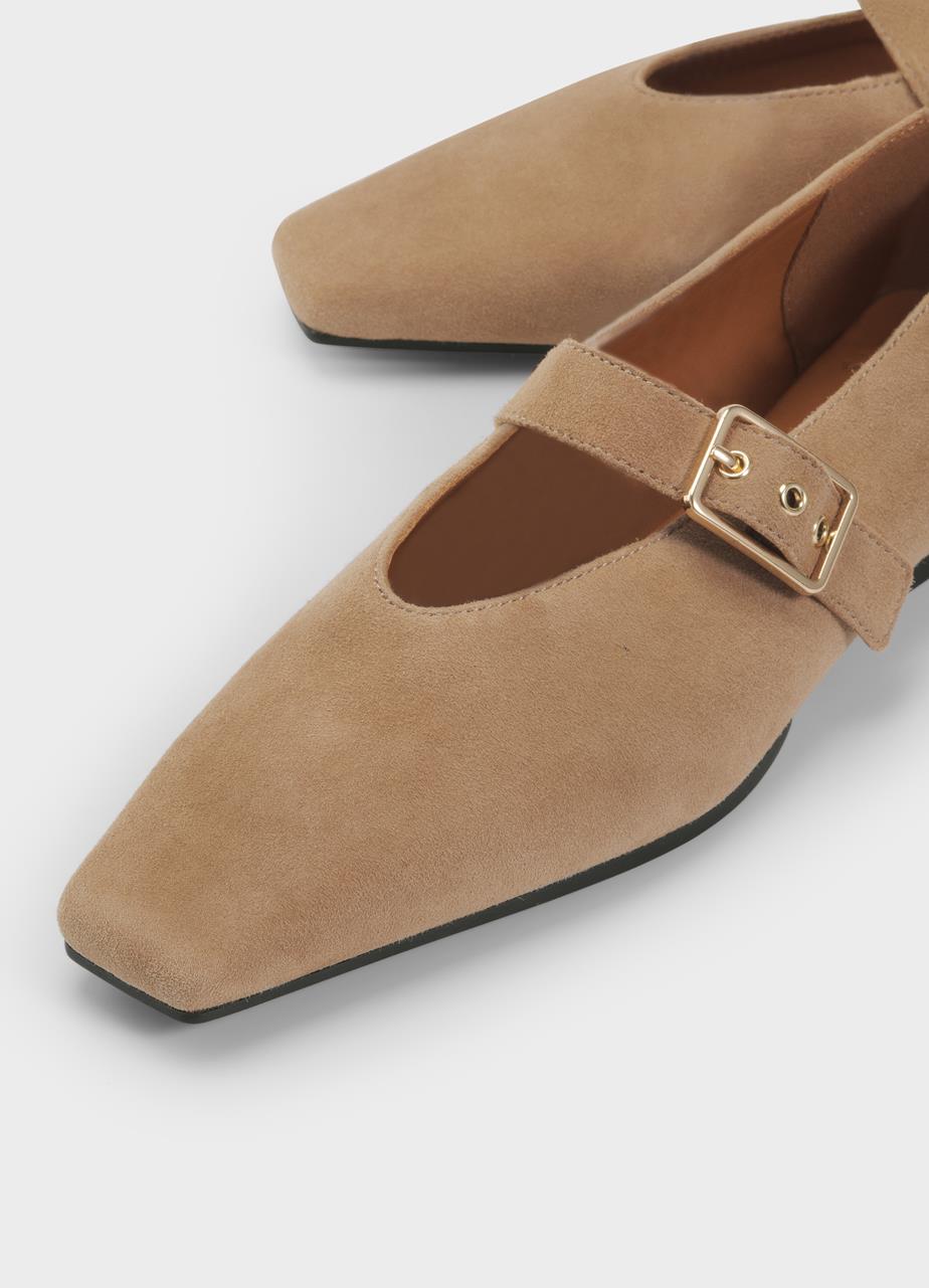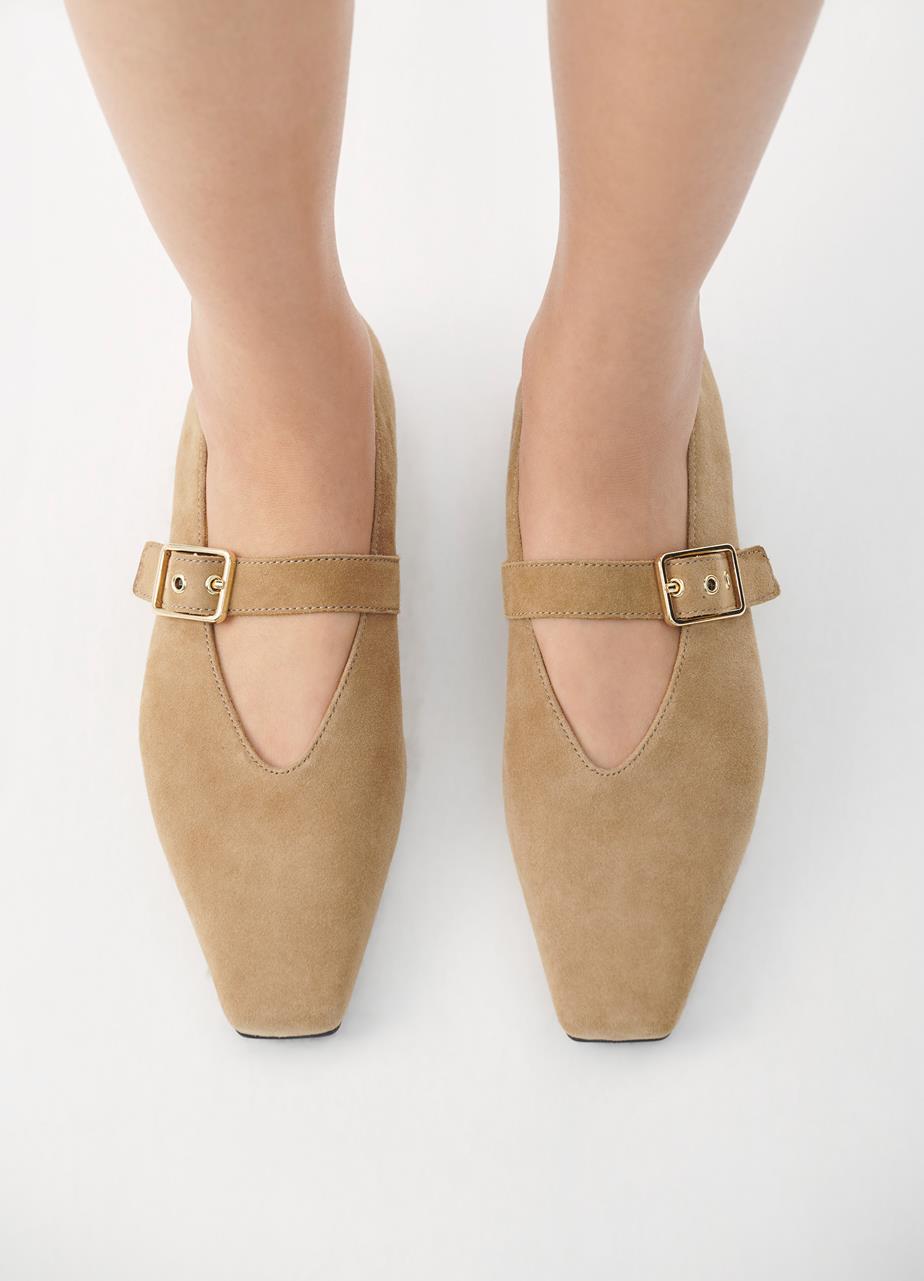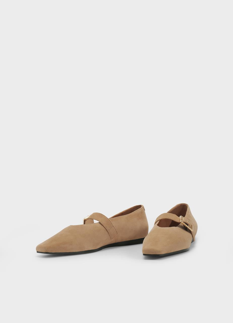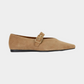 נעלי בובה לנשים מבית המותג וגהבונד. בגזרה שטוחה עם סיומת שפיץ חתוכה, עשויות מזמש, בשילוב רצועה מתכווננת ואבזם זהב.