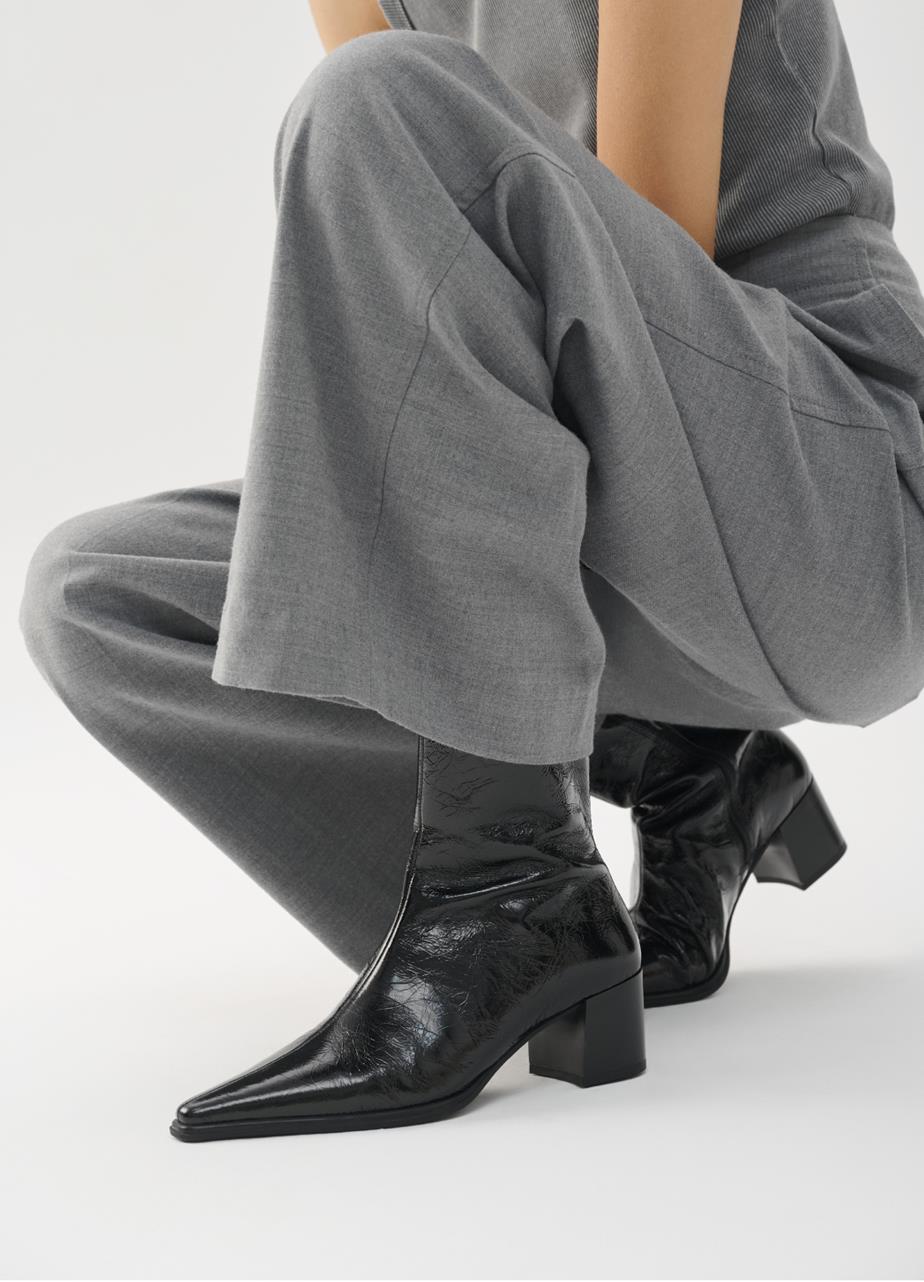 מגפיים לנשים מבית המותג וגהבונד. בגזרה נשית עשויים מעור, עם סיומת שפיץ וחלק עליון צמוד בסגירת רוכסן. בגימור מבריק