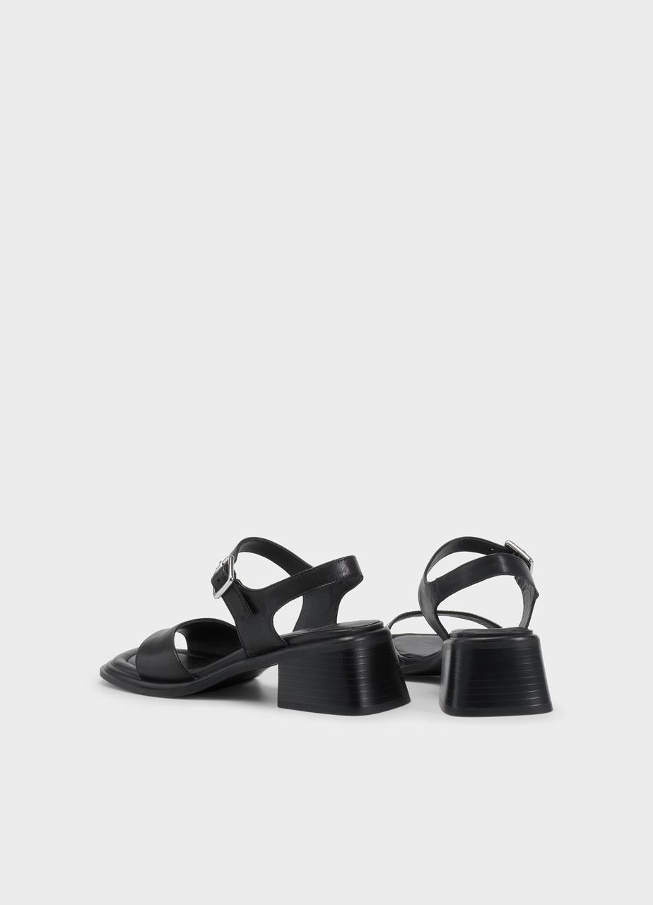 סנדלי עקב לנשים עם רצועות בעובי בינוני, בשילוב עקב צ'אנקי ומודרני. רצועת הקרסול מתכווננת עם אבזם מרובע וכסוף.