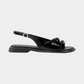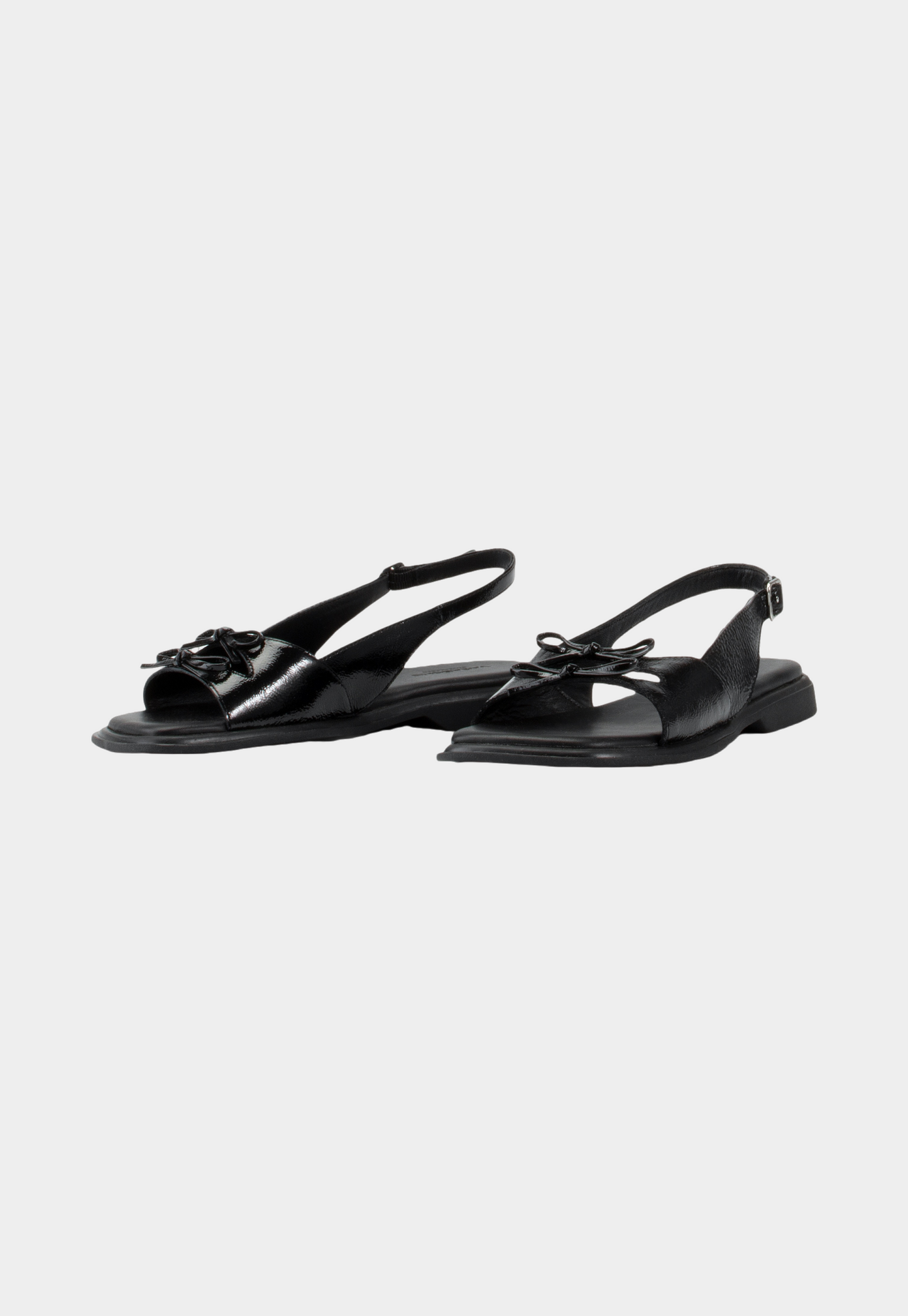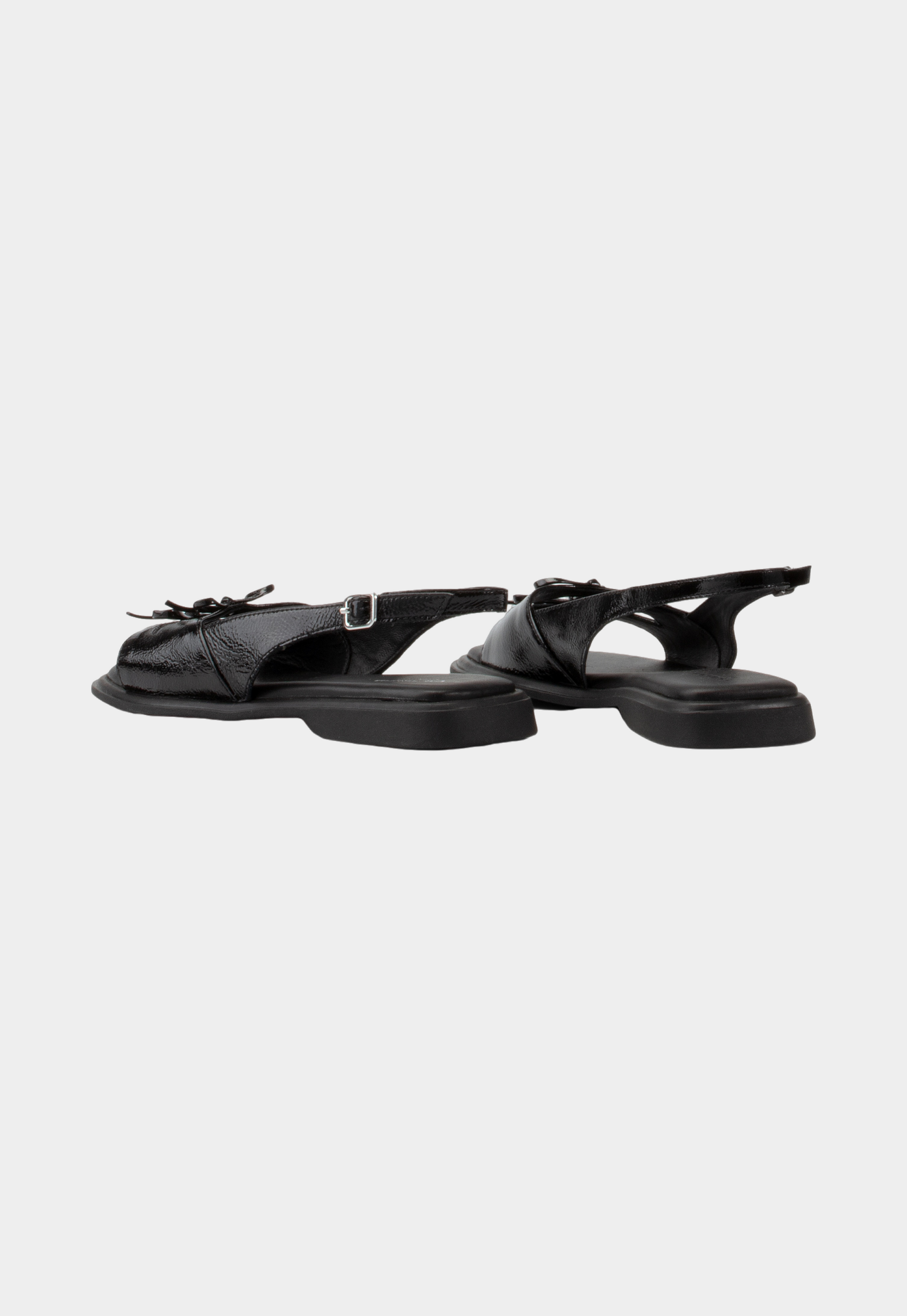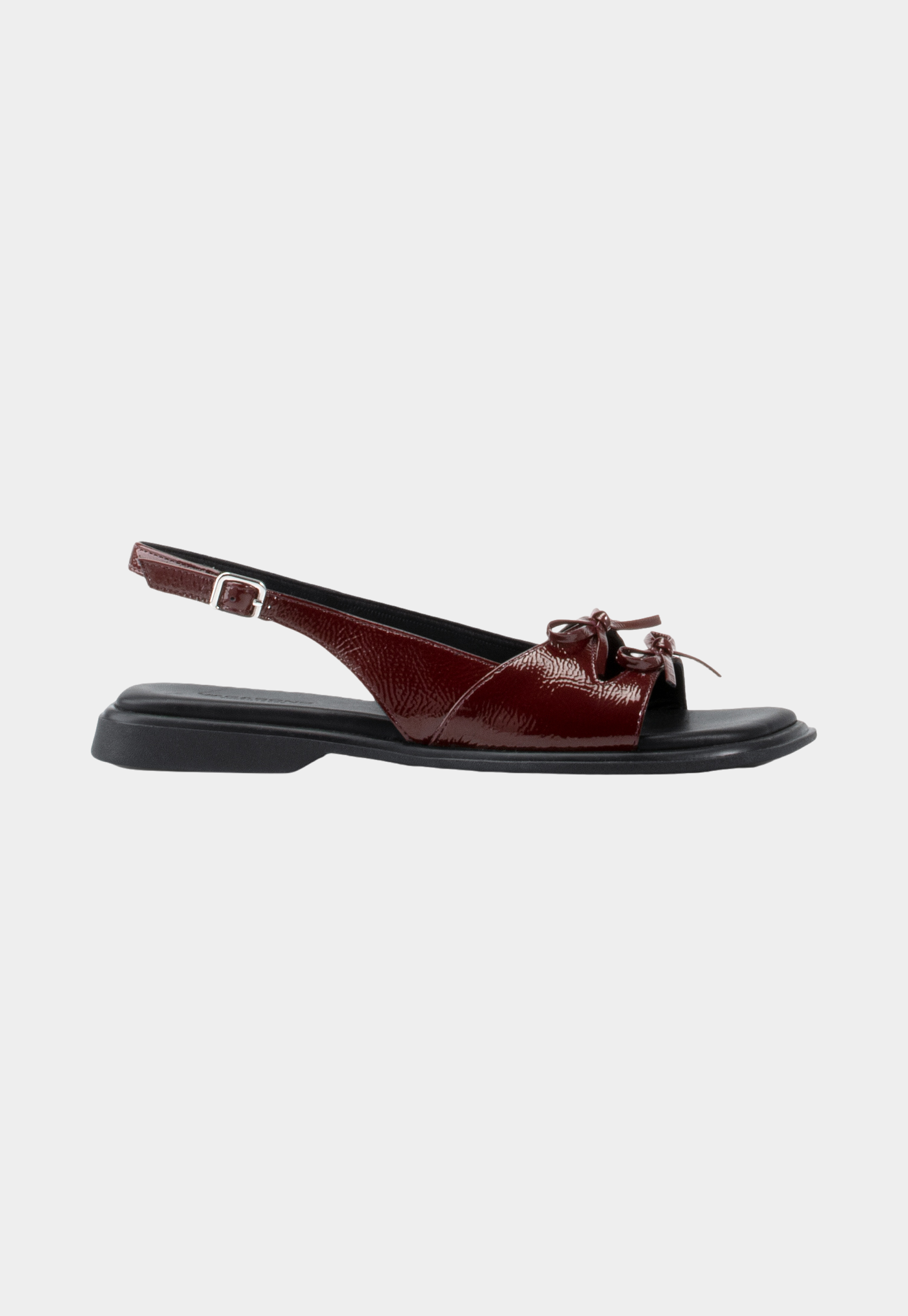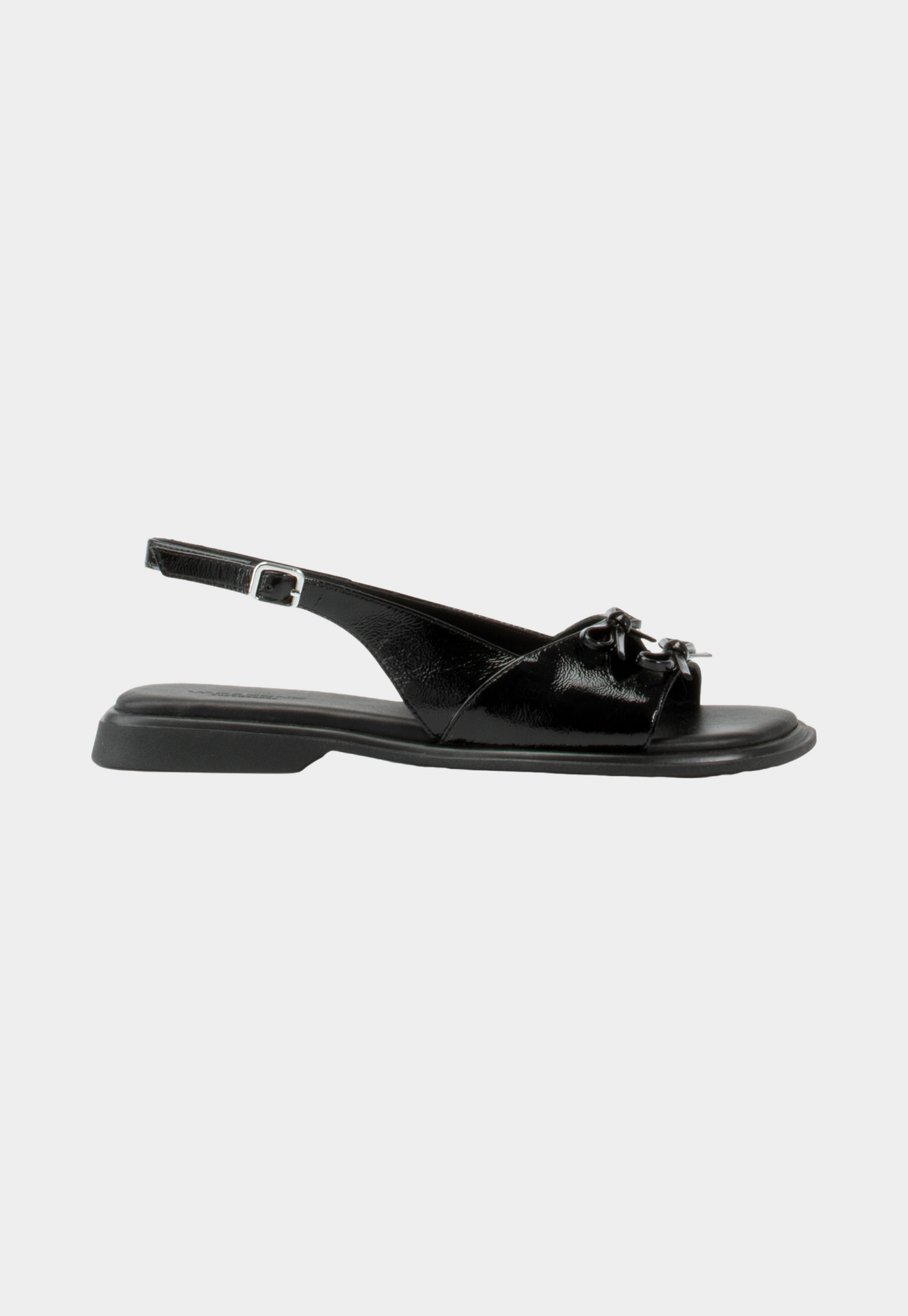 סנדלים לנשים מבית המותג ואגבונד. עשויים מעור, בגימור מבריק, עם רצועה עליונה מיוחדת עם מרווח מרכזי וקשירות פפיון, הסנדלים בעלי רצועת קרסול מתכווננת עם אבזם כסף קטן