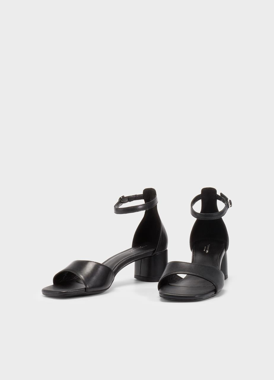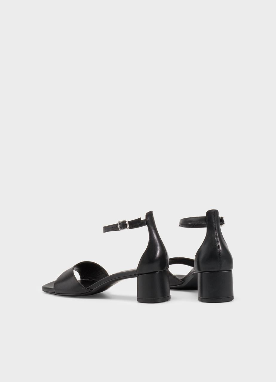 סנדלי עקב לנשים עם רצועות בעובי בינוני, בשילוב עקב צ'אנקי ומודרני. רצועת הקרסול מתכווננת עם אבזם מרובע וכסוף.