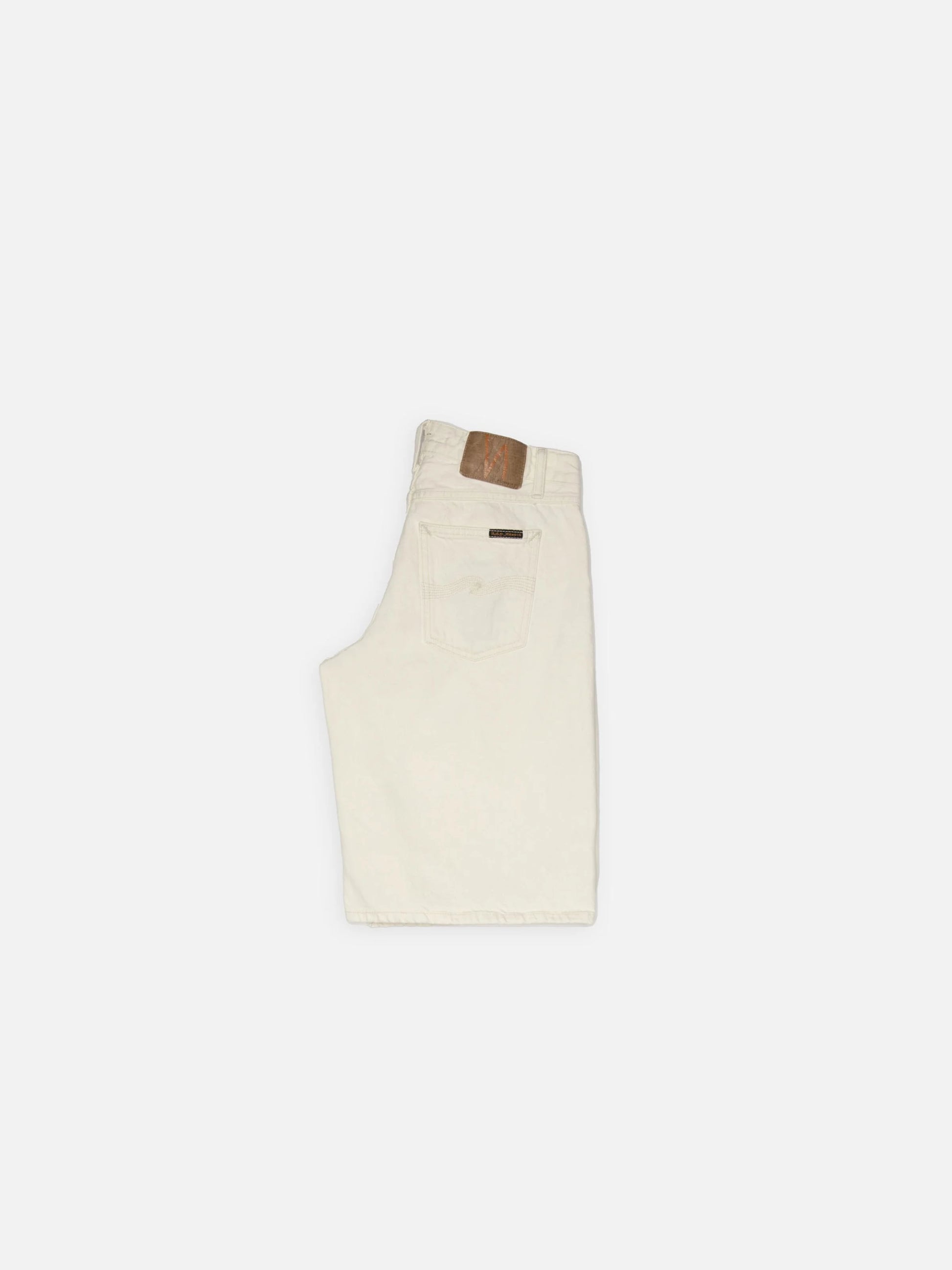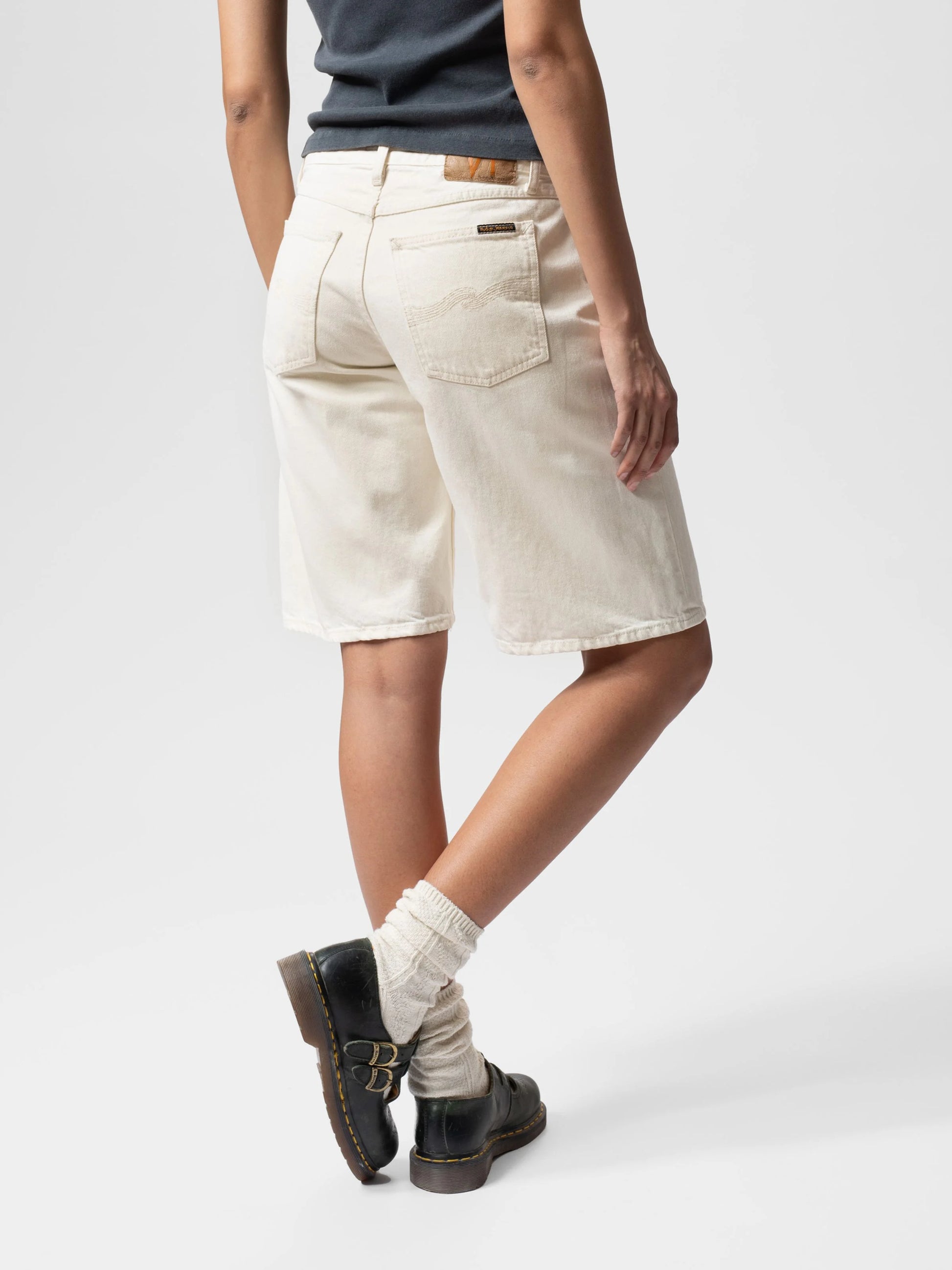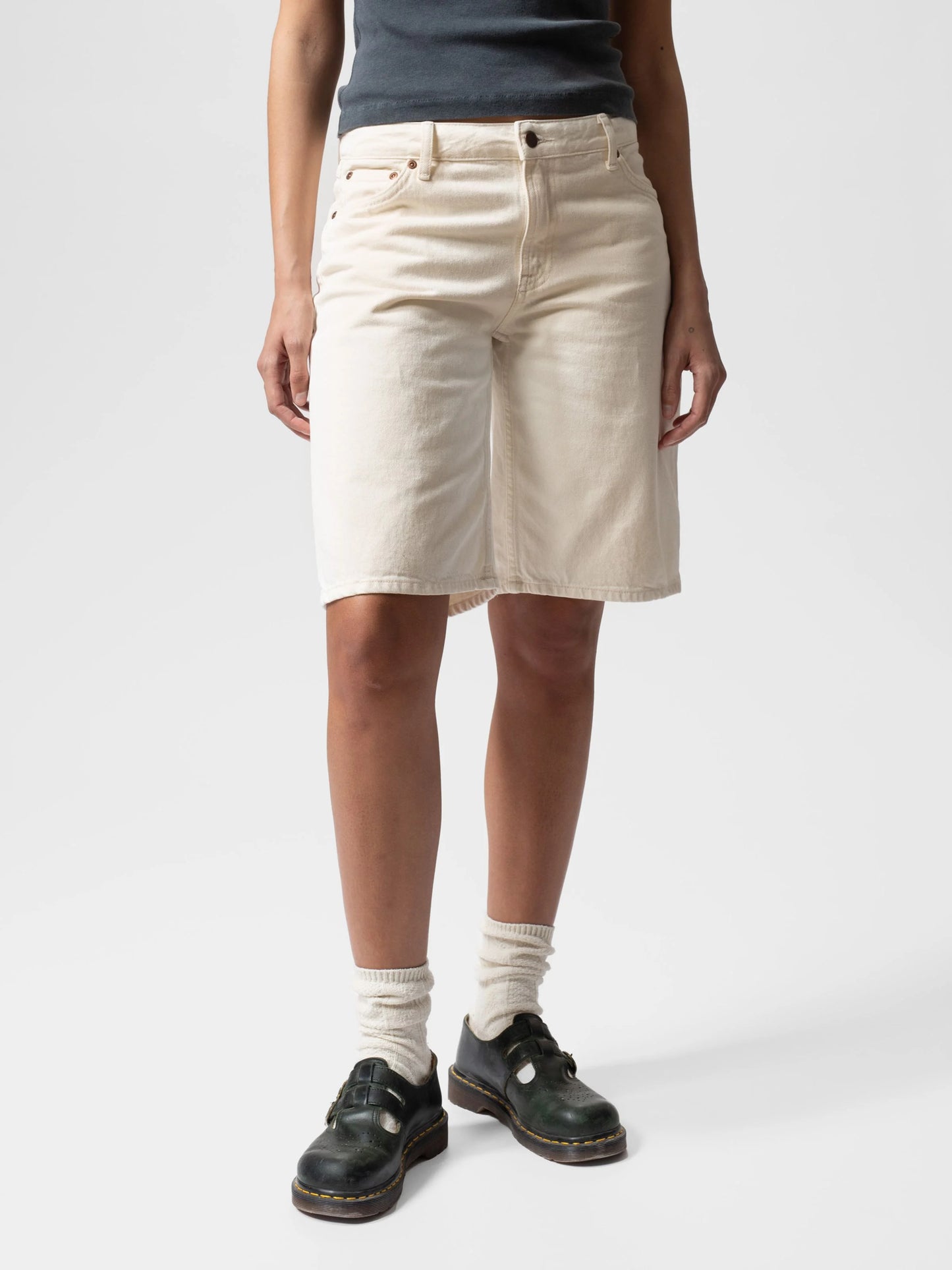 ג'ינס קצר לנשים מבית המותג נודי, בגזרה משוחררת ונמוכה ורגל רחבה, עם רוכסן וכפתור סגירה ושני כיסים קדמיים ואחוריים.