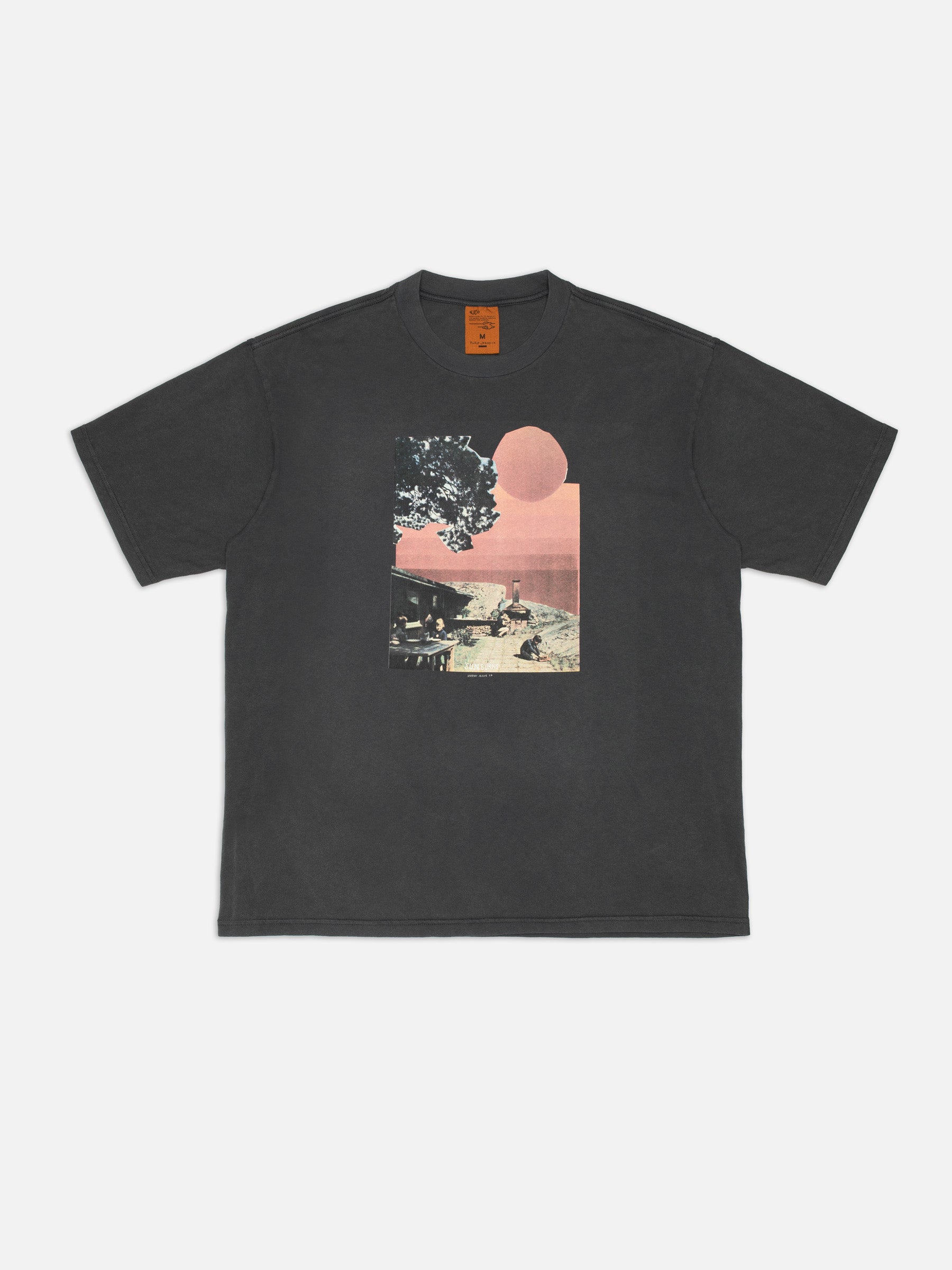חולצת כותנה קצרה בצבע שחור דהוי עם הדפס גרפי צבעוני בחזית. גזרה קלאסית ונוחה לשימוש יומיומי.