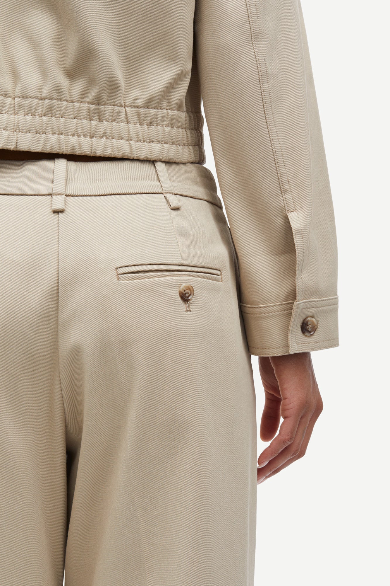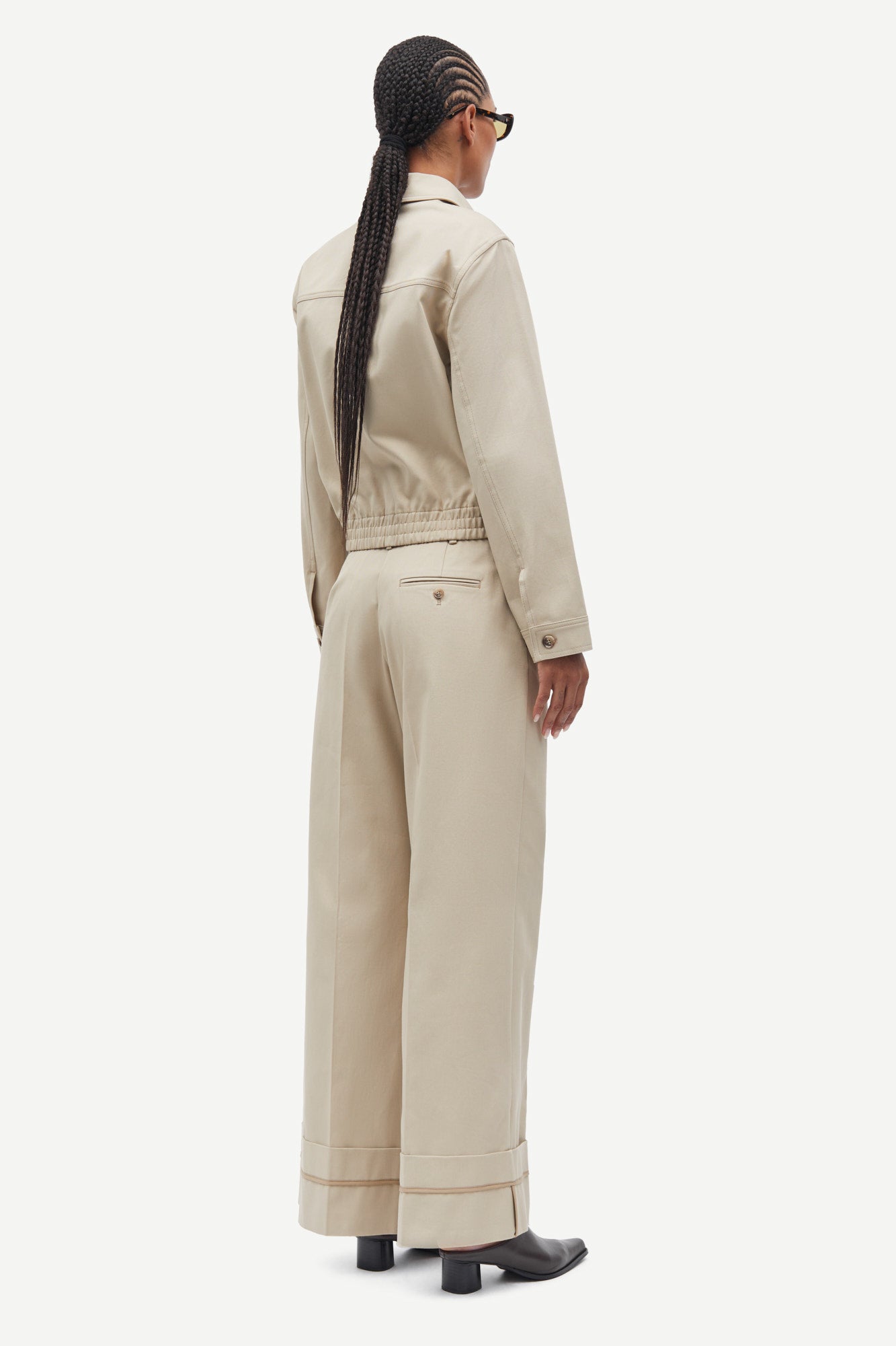 מכנסיים ארוכים מחויטים לנשים מבית המותג סמסו סמסו. בגזרה מתרחבת, עם רוכסן סגירה, שני כיסים קדמיים וסיומת עם מכפלת עבה.