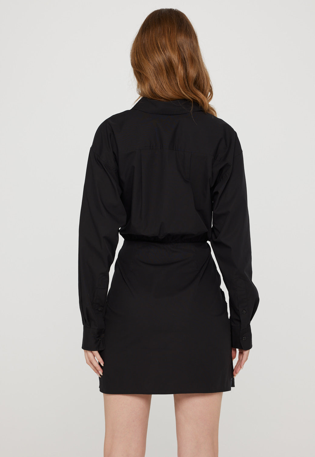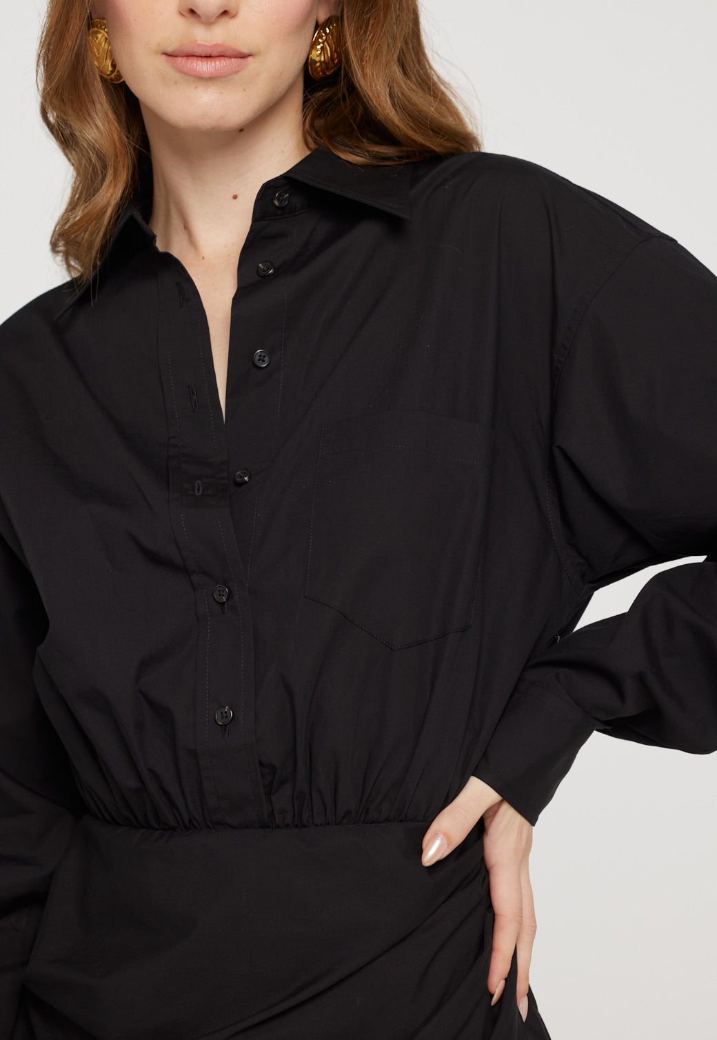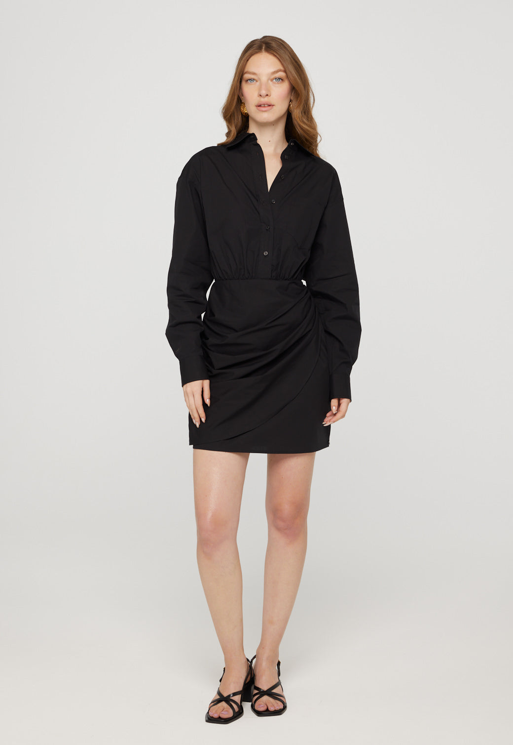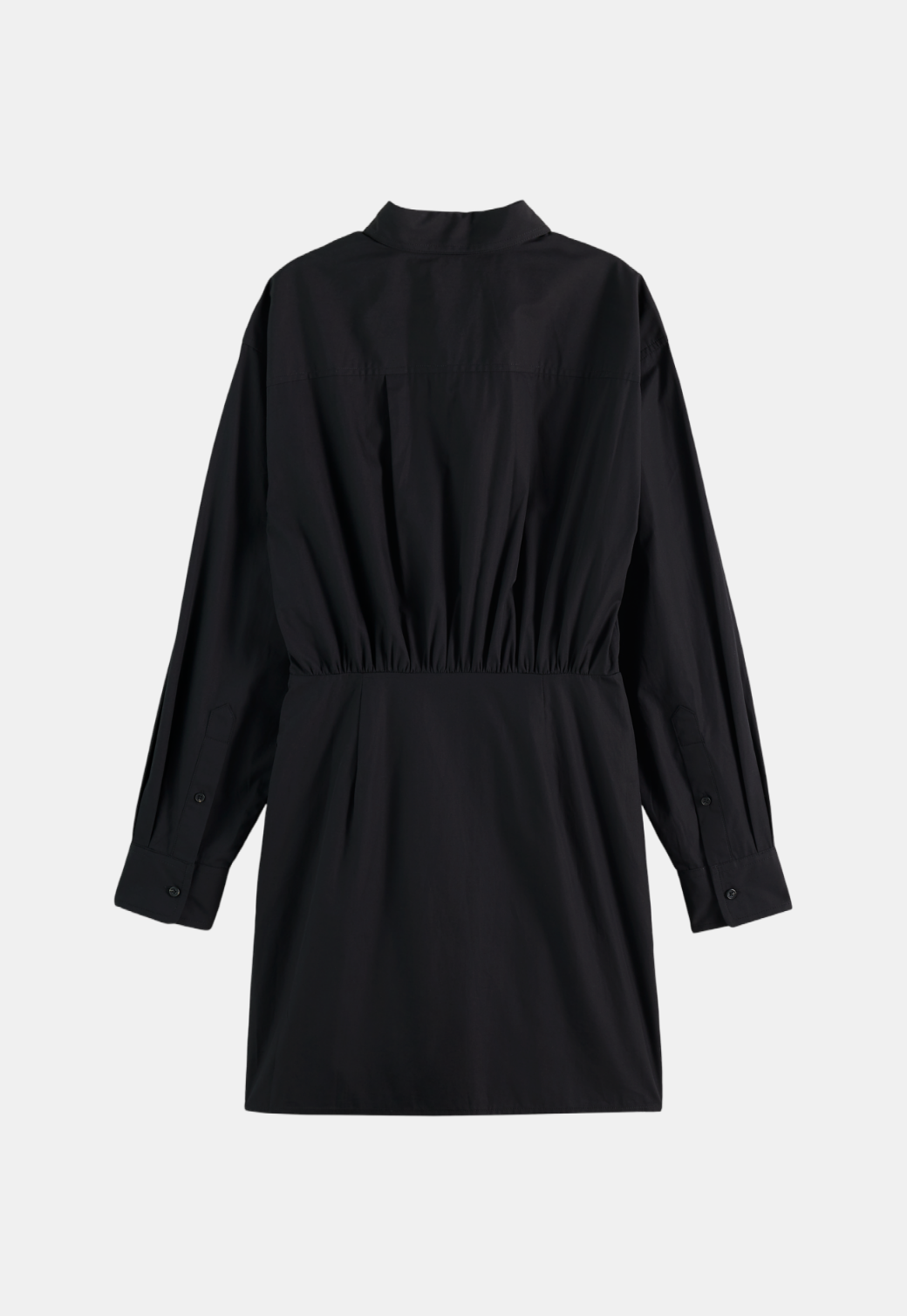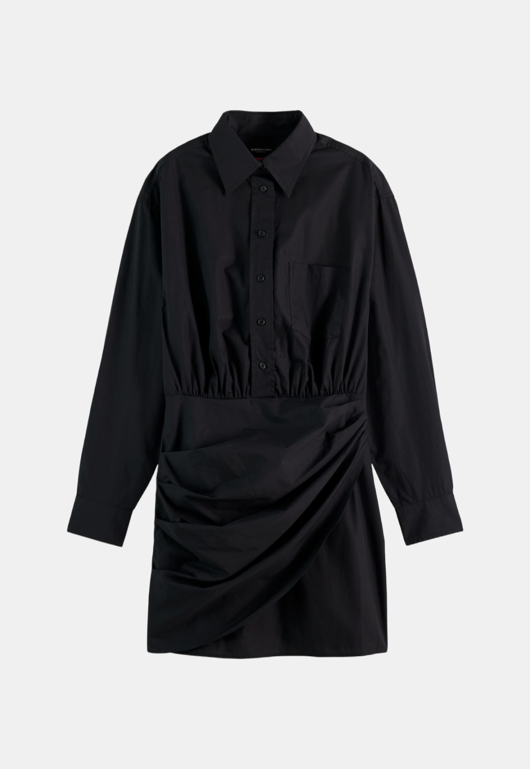 שמלת מיני לנשים מבית המותג סקוצ' אנד סודה. החלק עליון מעוצב בסגנון חולצה מכופתרת עם צווארון קלאסי, שרוולים ארוכים וסגירת כפתורים בחזית. החלק התחתון מציג גזרה צמודה עם כיווצים.