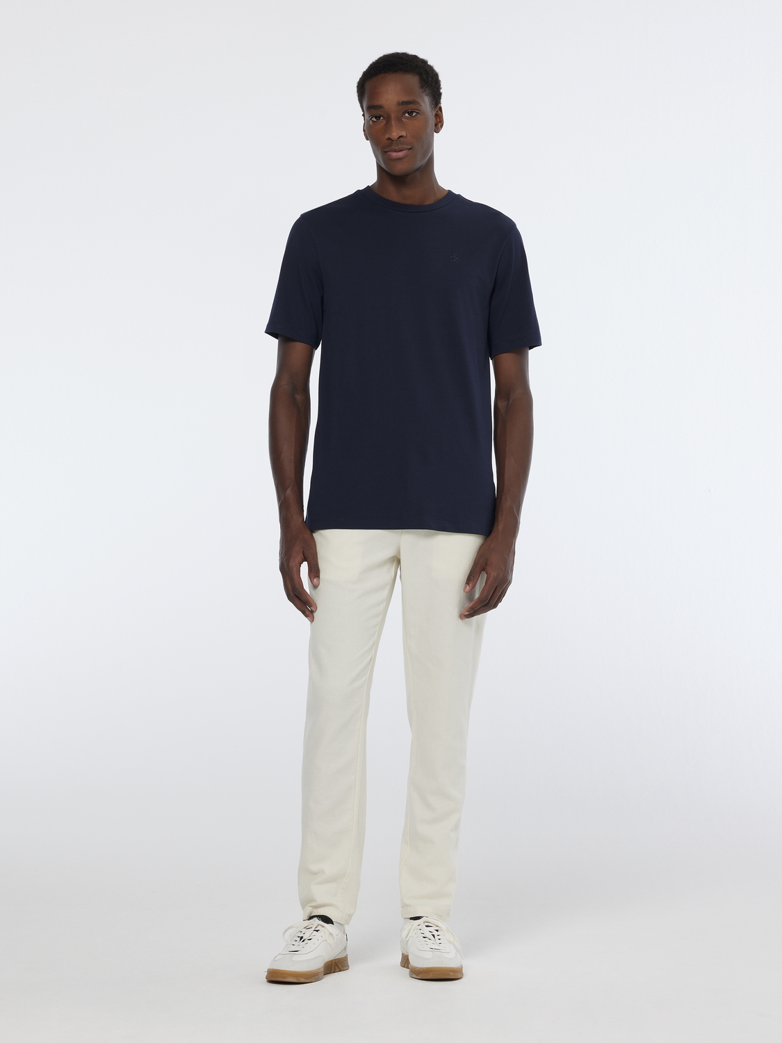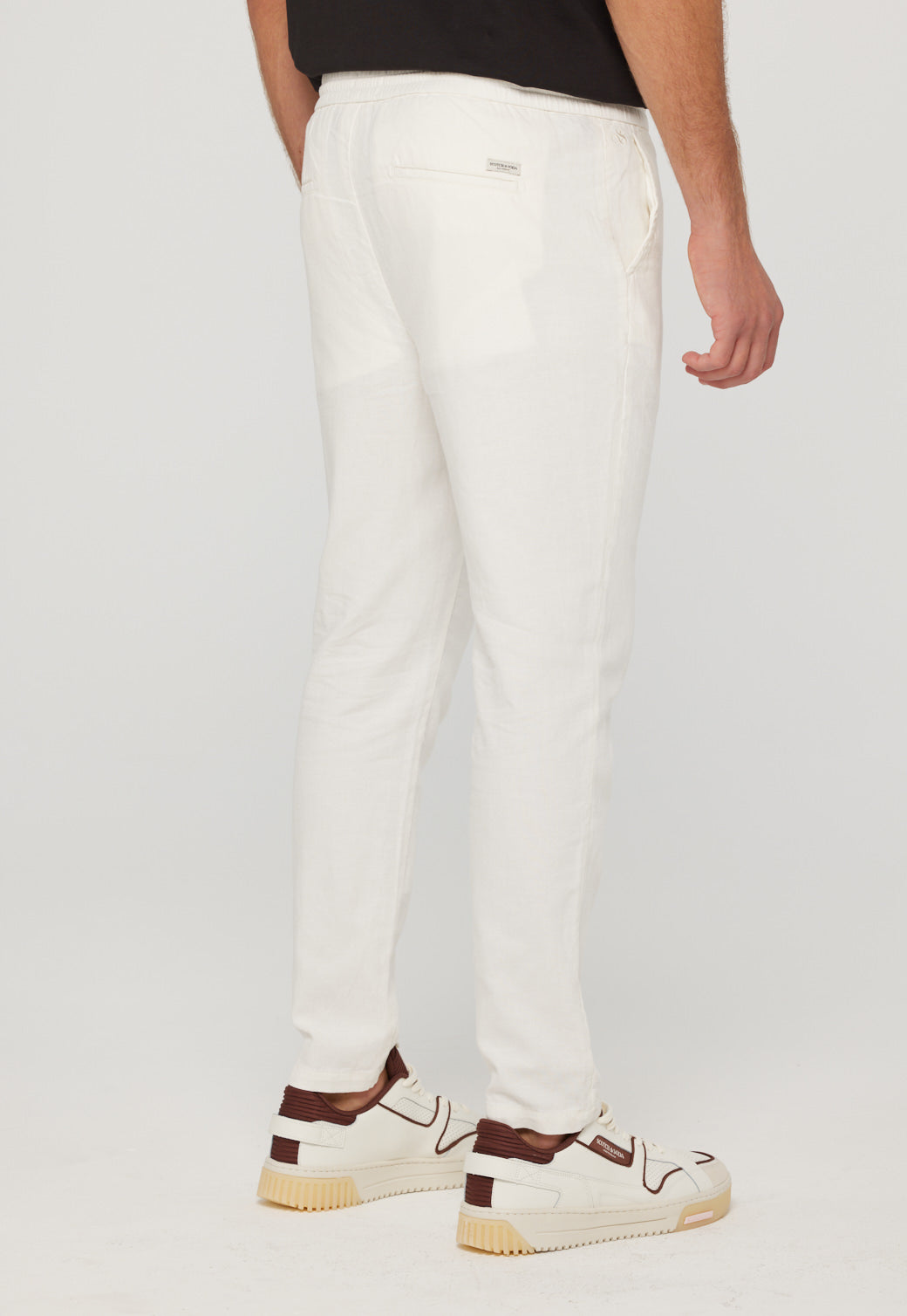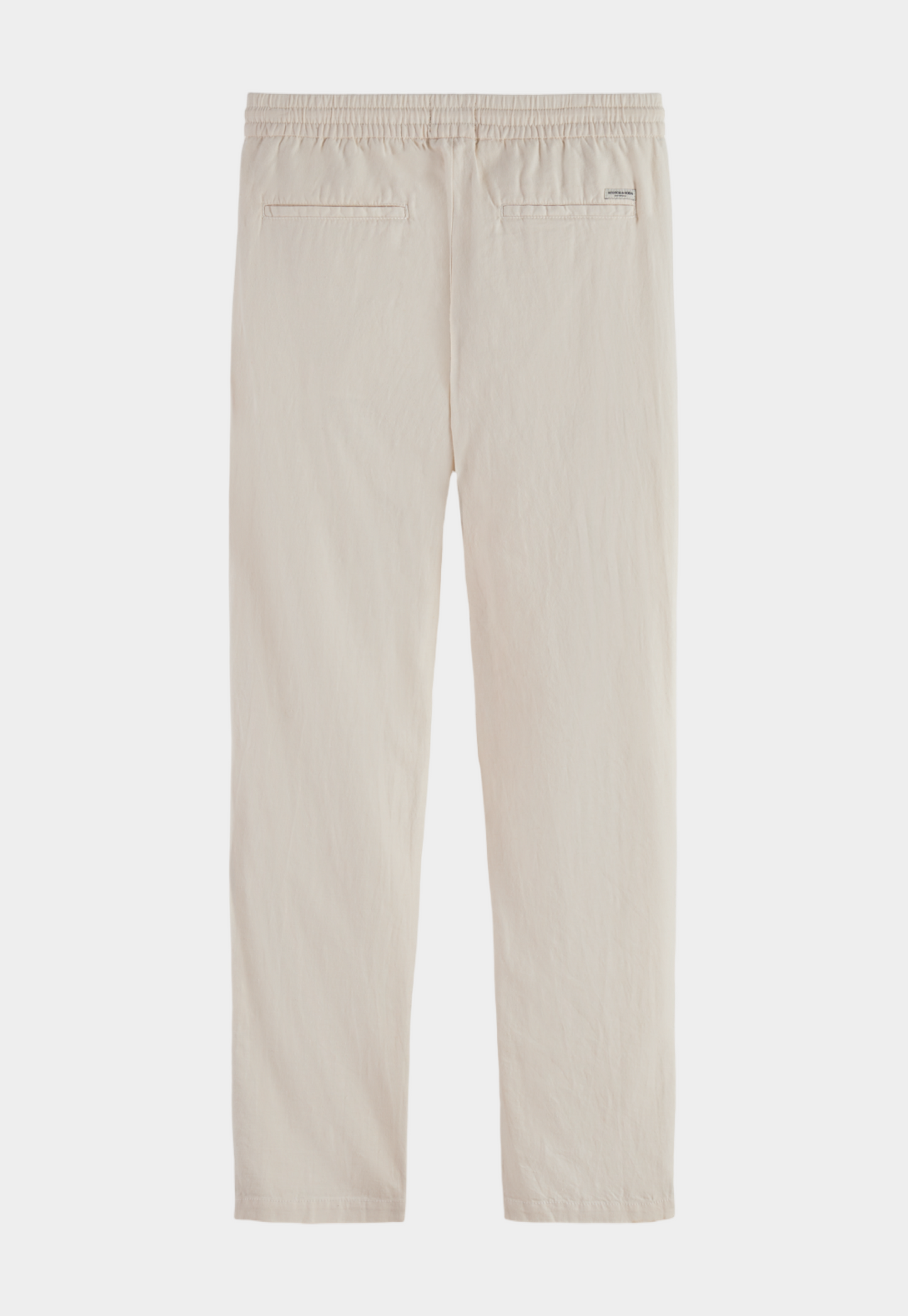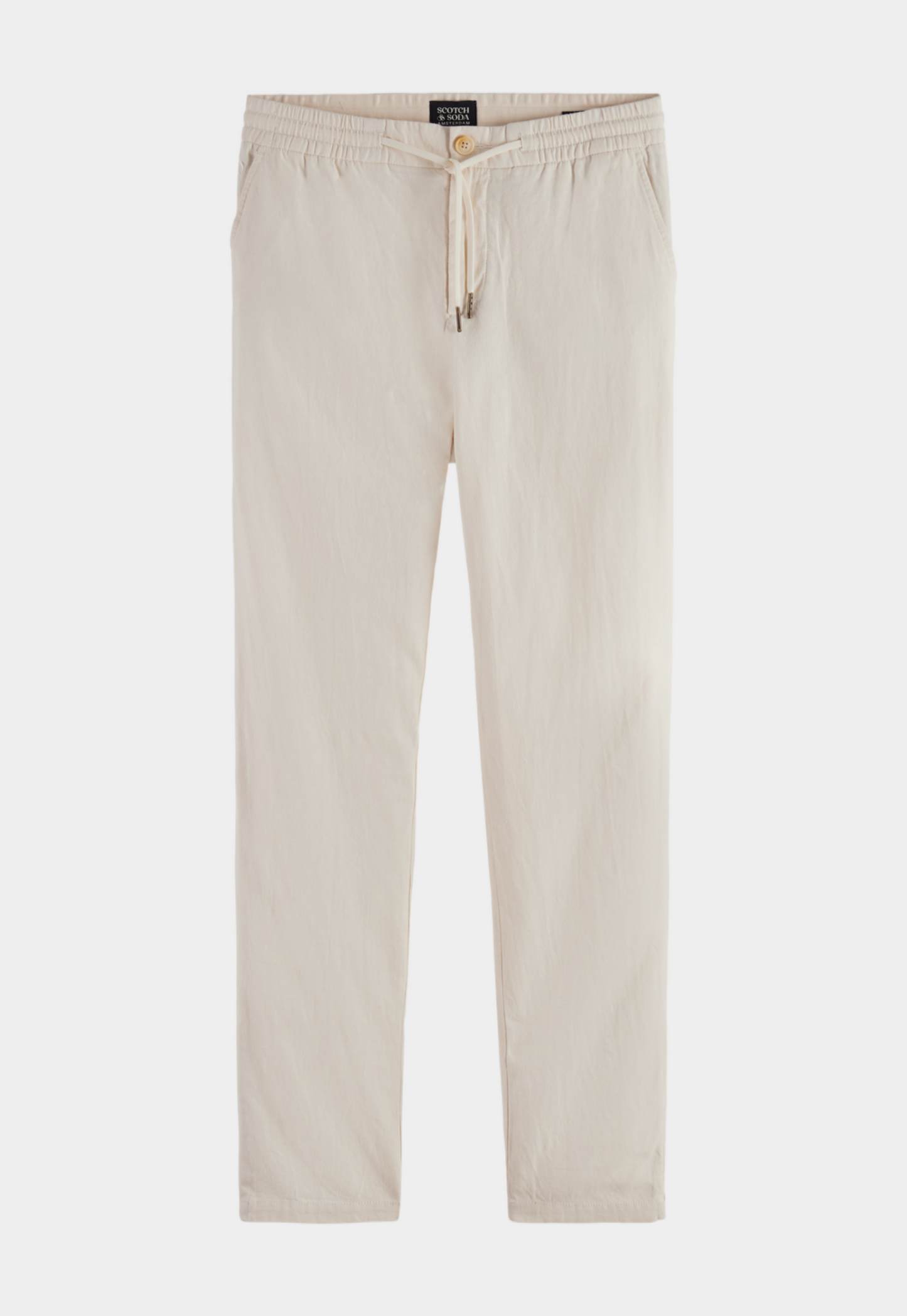 מכנסיים ארוכים לגברים מבית המותג סקוצ' אנד סודה. עשויים משילוב של פשתן וכותנה, בגזרה ישרה עם גומי במותן וקשירת שרוכים.