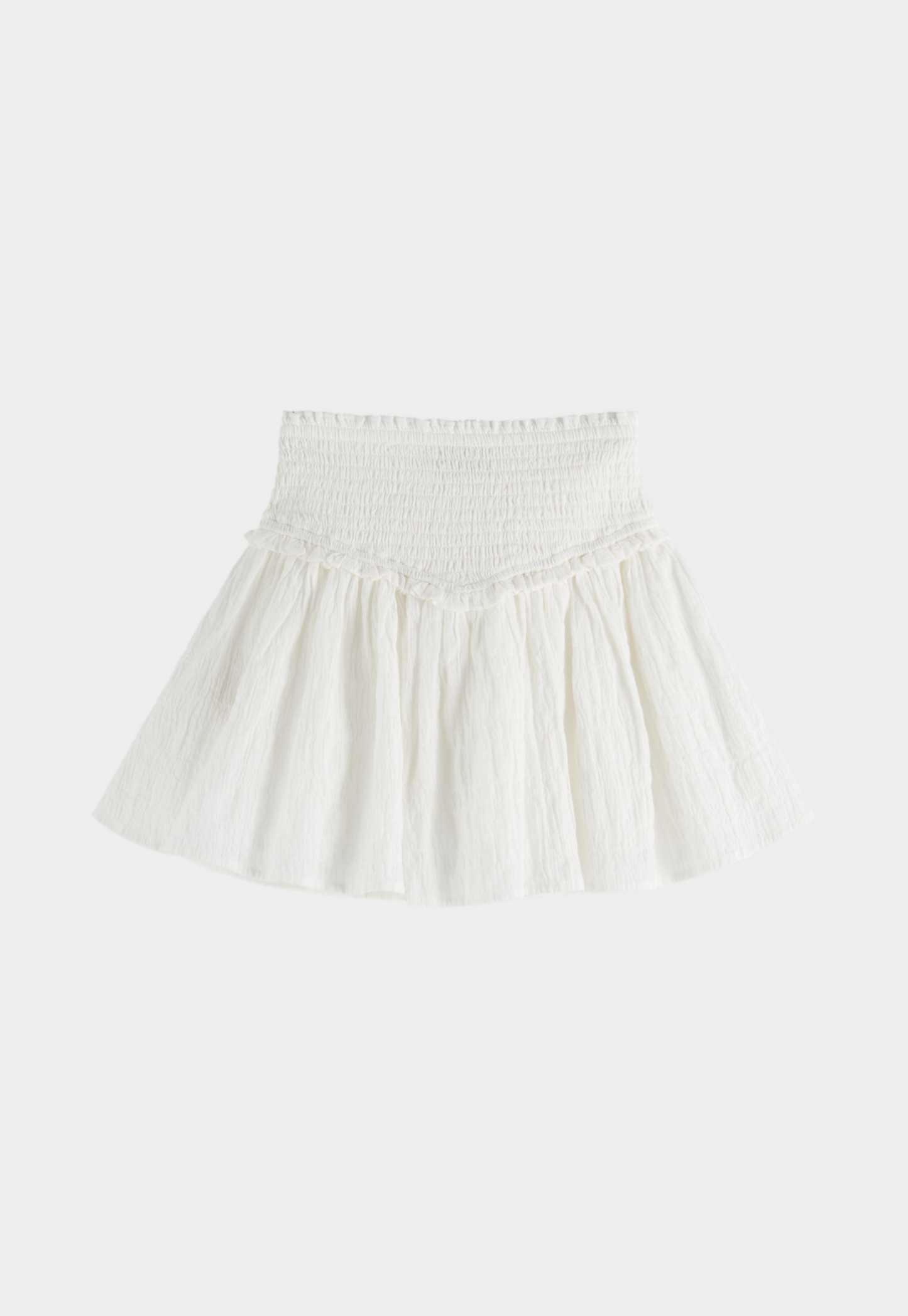 חצאית מיני לילדות מבית המותג סקוצ' אנד סודה. בגזרה משוחררת עם גומי רחב בבטן ובד משוחרר בקצה.