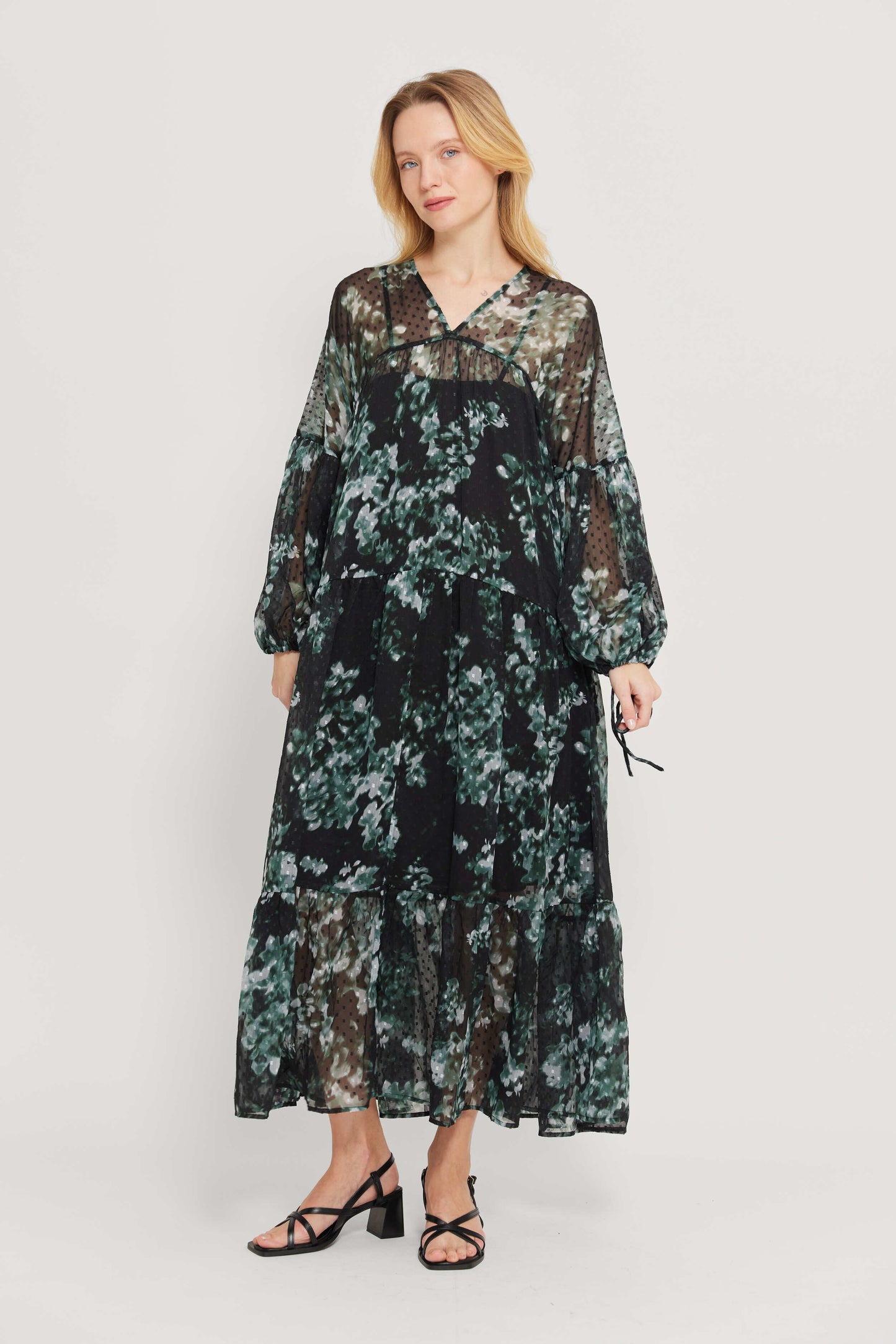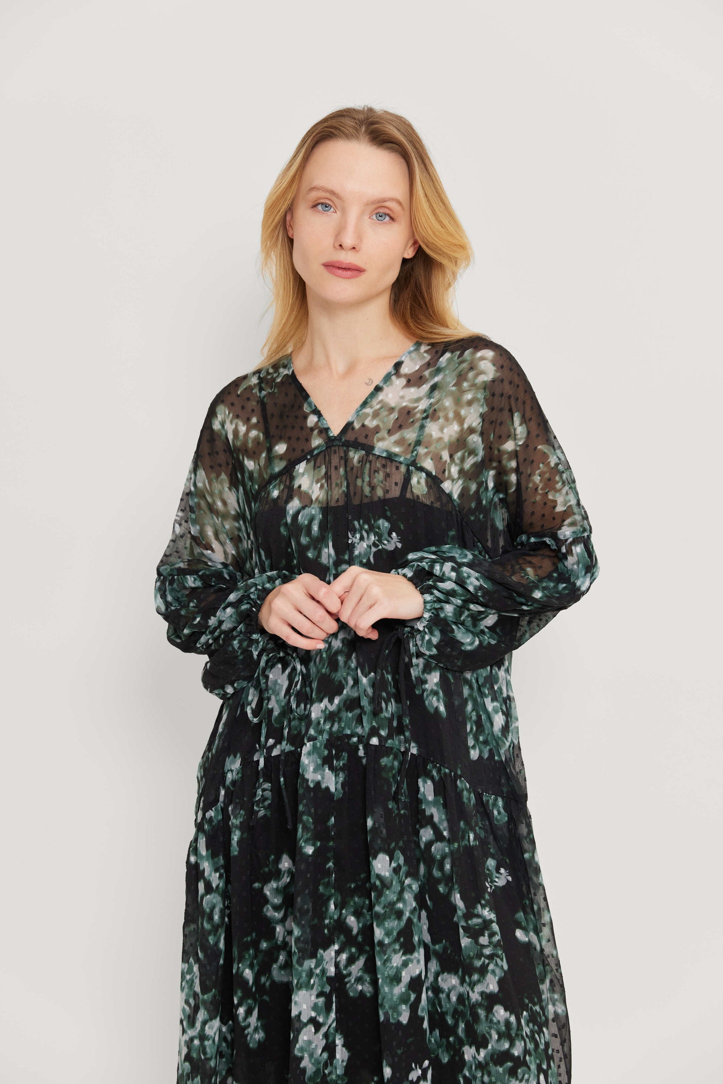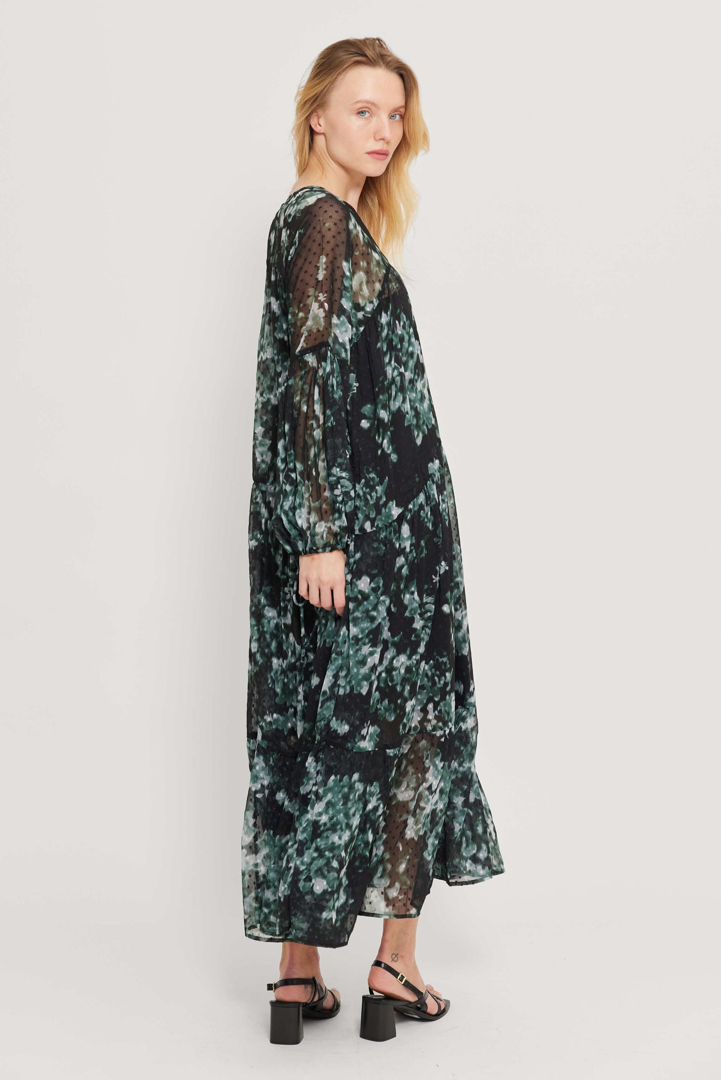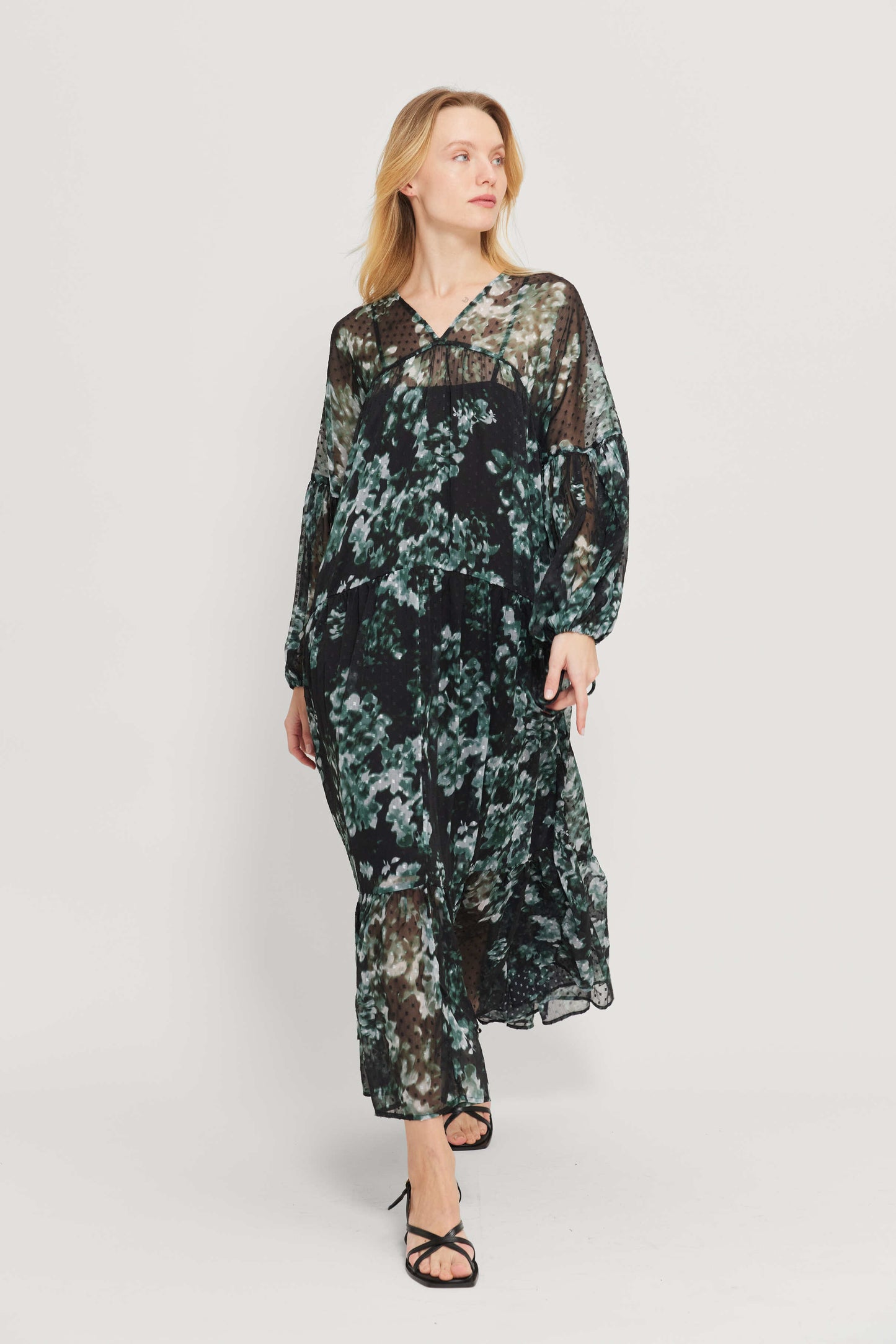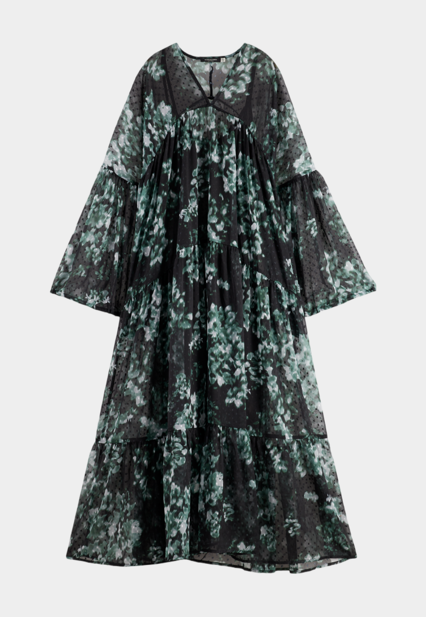 שמלת מקסי שקפקפה עם פרינט לנשים לבית המותג סקוצ' אנד סודה. בגזרה משוחררת במראה אלגנטי.
