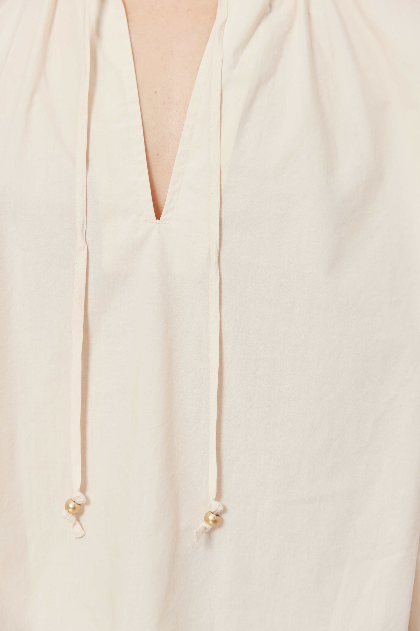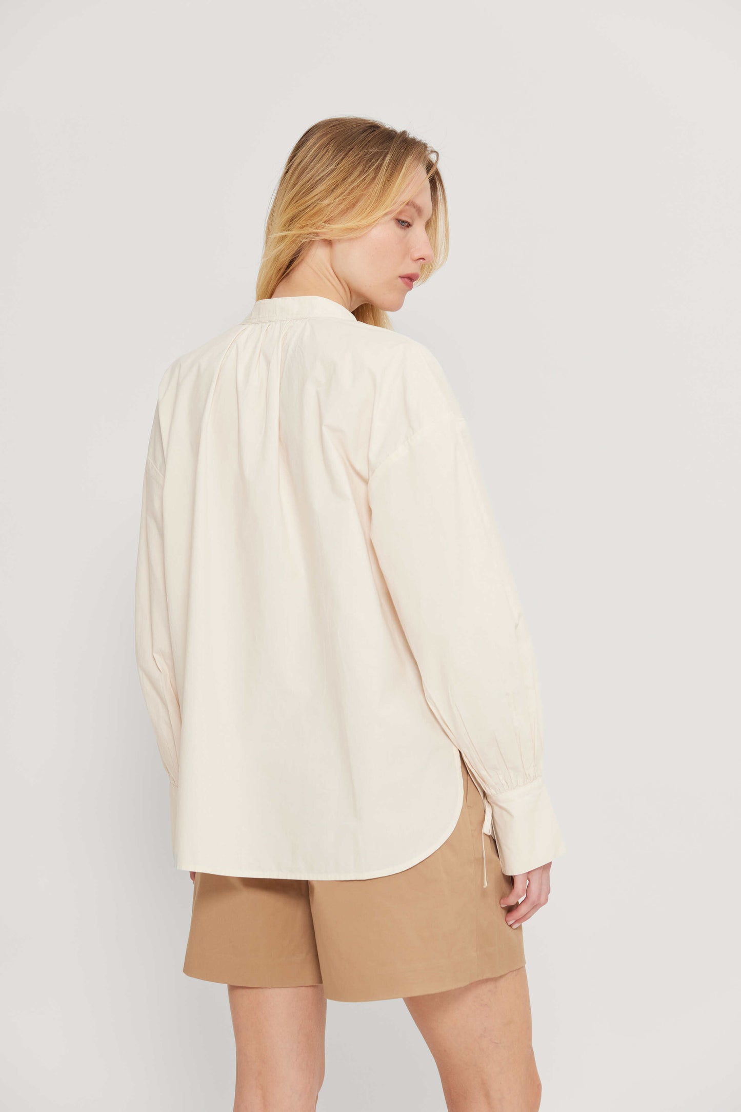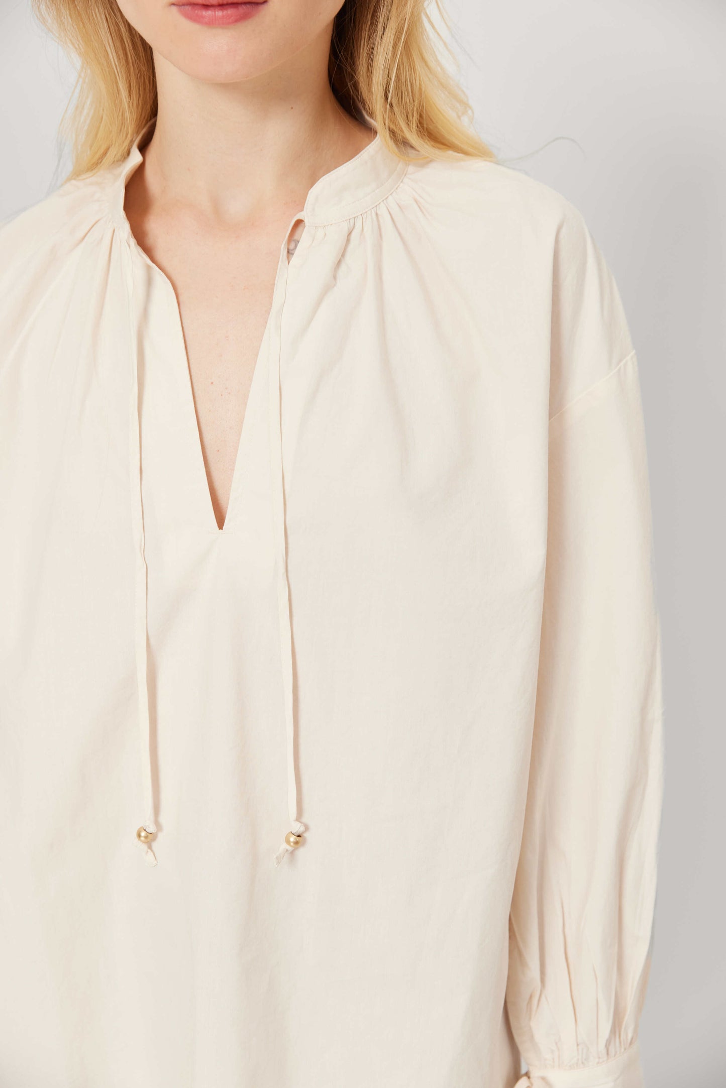 חולצה ארוכה עם כיווצים לנשים מבית המותג סקוצ' אנד סודה. בגזרה משוחררת, עם צווארון קטן וקשירה שיוצרת כיווצים, בשילוב שרוולים ארוכים בעלי סיומת קשירה.