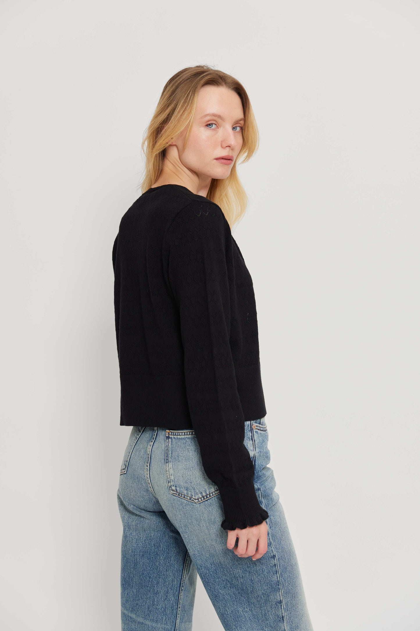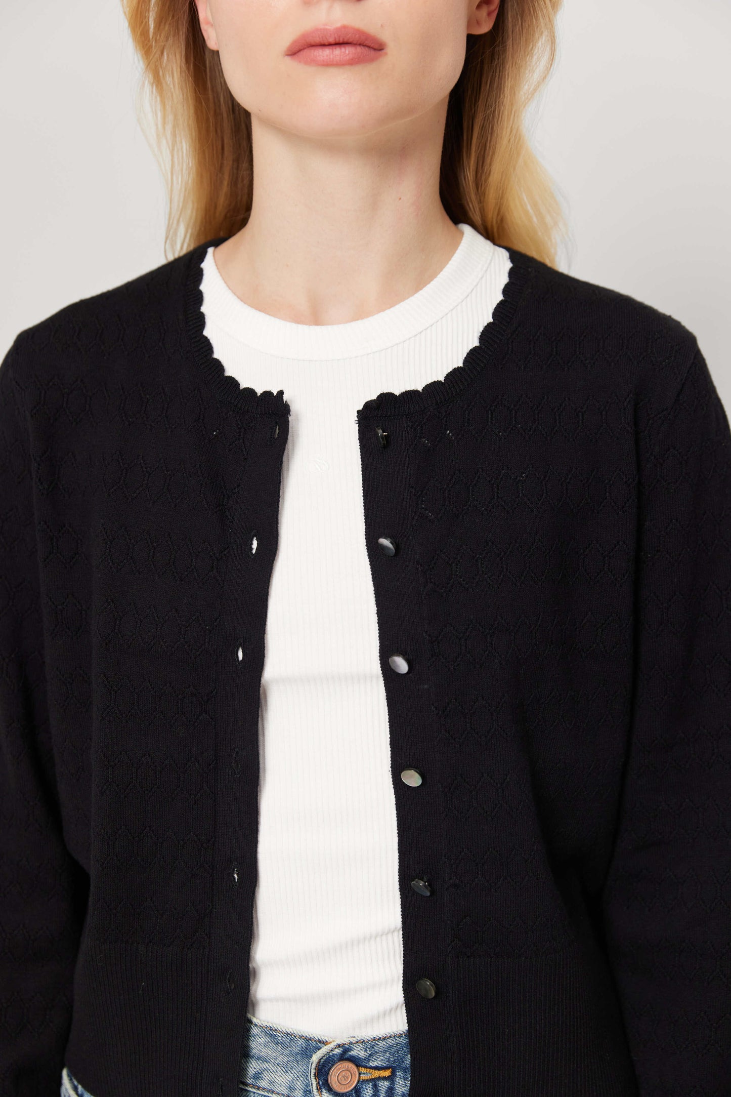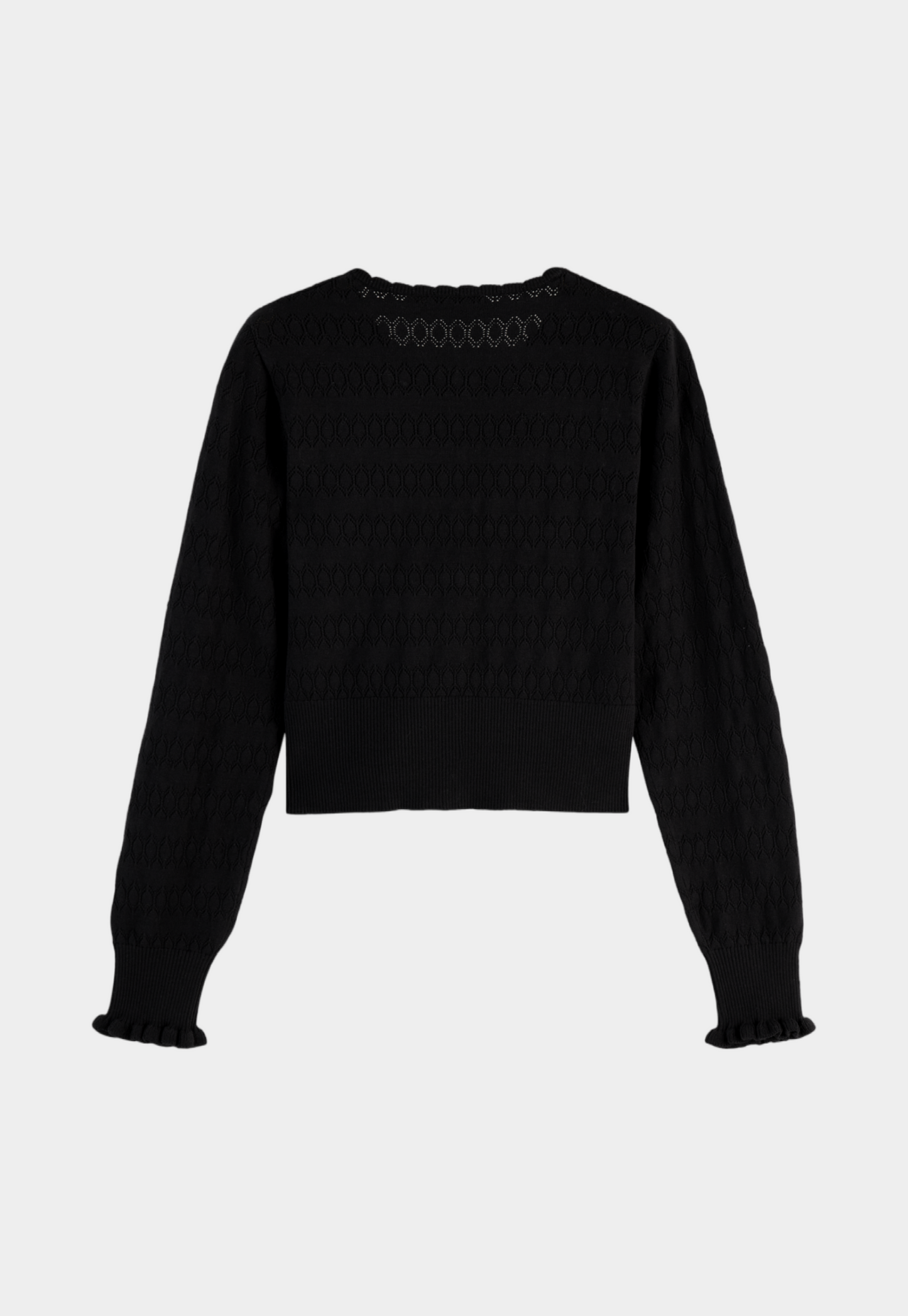 קרדיגן לנשים מבית המותג סקוצ' אנד סודה. בגזרה קלאסית, עם מפתח עגול , כפתורי סגירה ושרוולים ארוכים עם כיווצי גומי בסיומת. עשוי מבד רך ומחמם. עם דיטיילס של מעויינים.