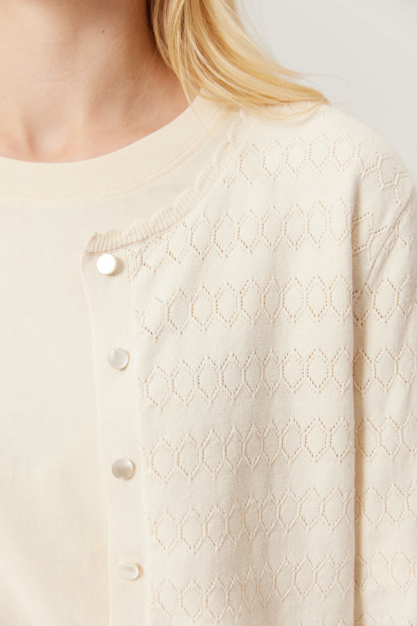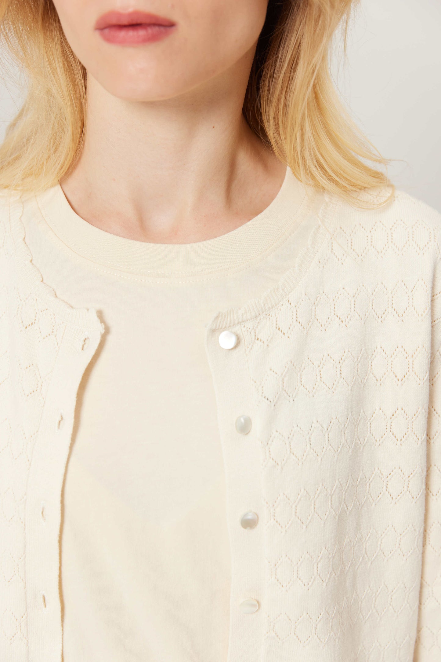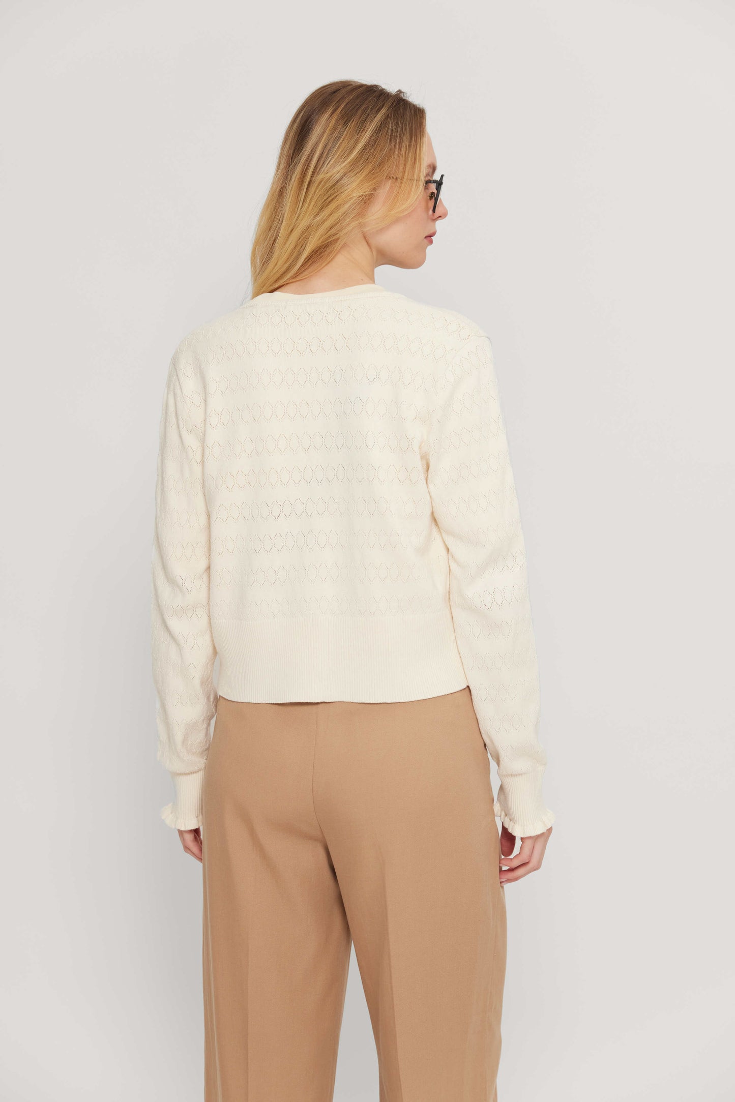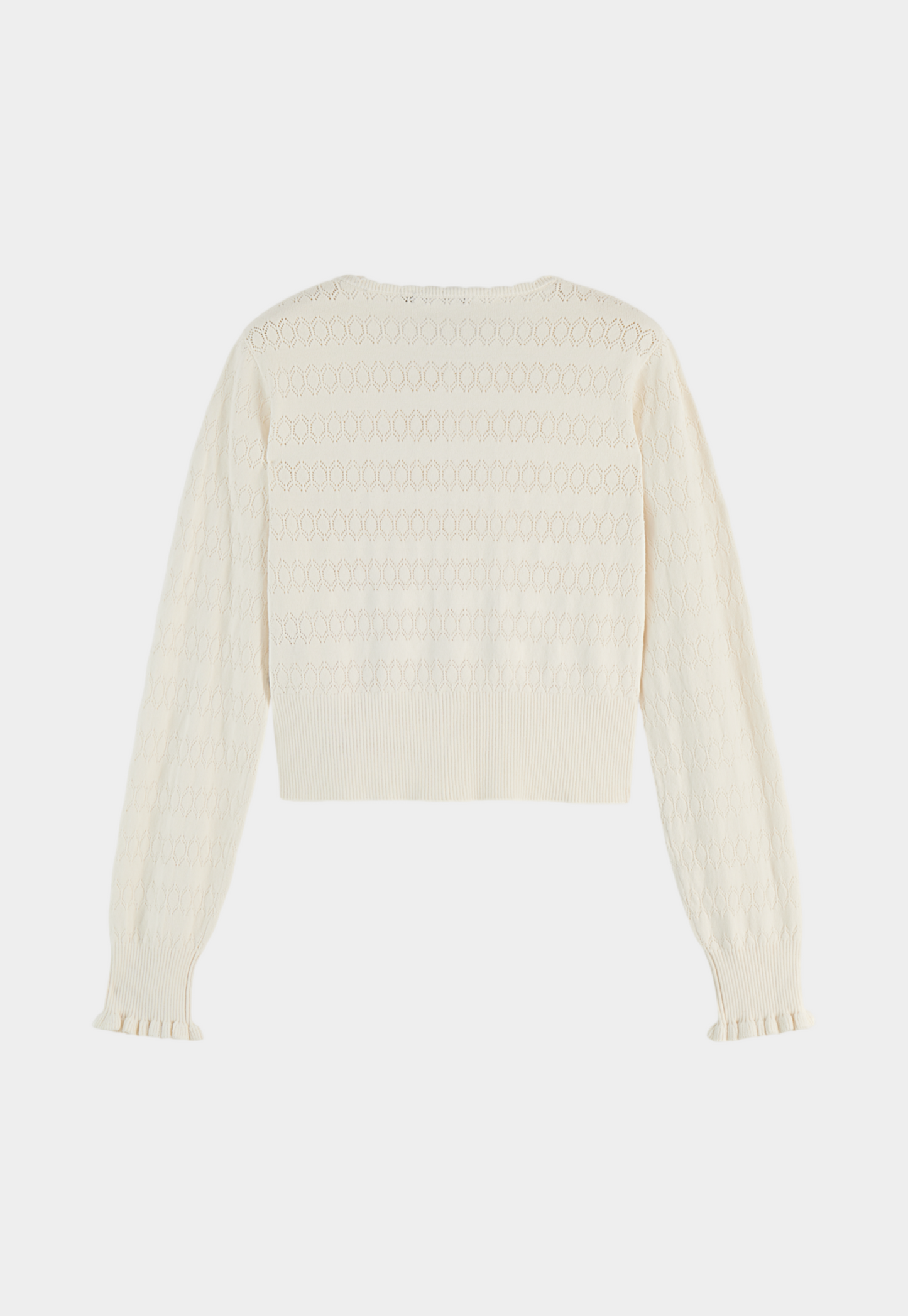 קרדיגן לנשים מבית המותג סקוצ' אנד סודה. בגזרה קלאסית, עם מפתח עגול , כפתורי סגירה ושרוולים ארוכים עם כיווצי גומי בסיומת. עשוי מבד רך ומחמם. עם דיטיילס של מעויינים.