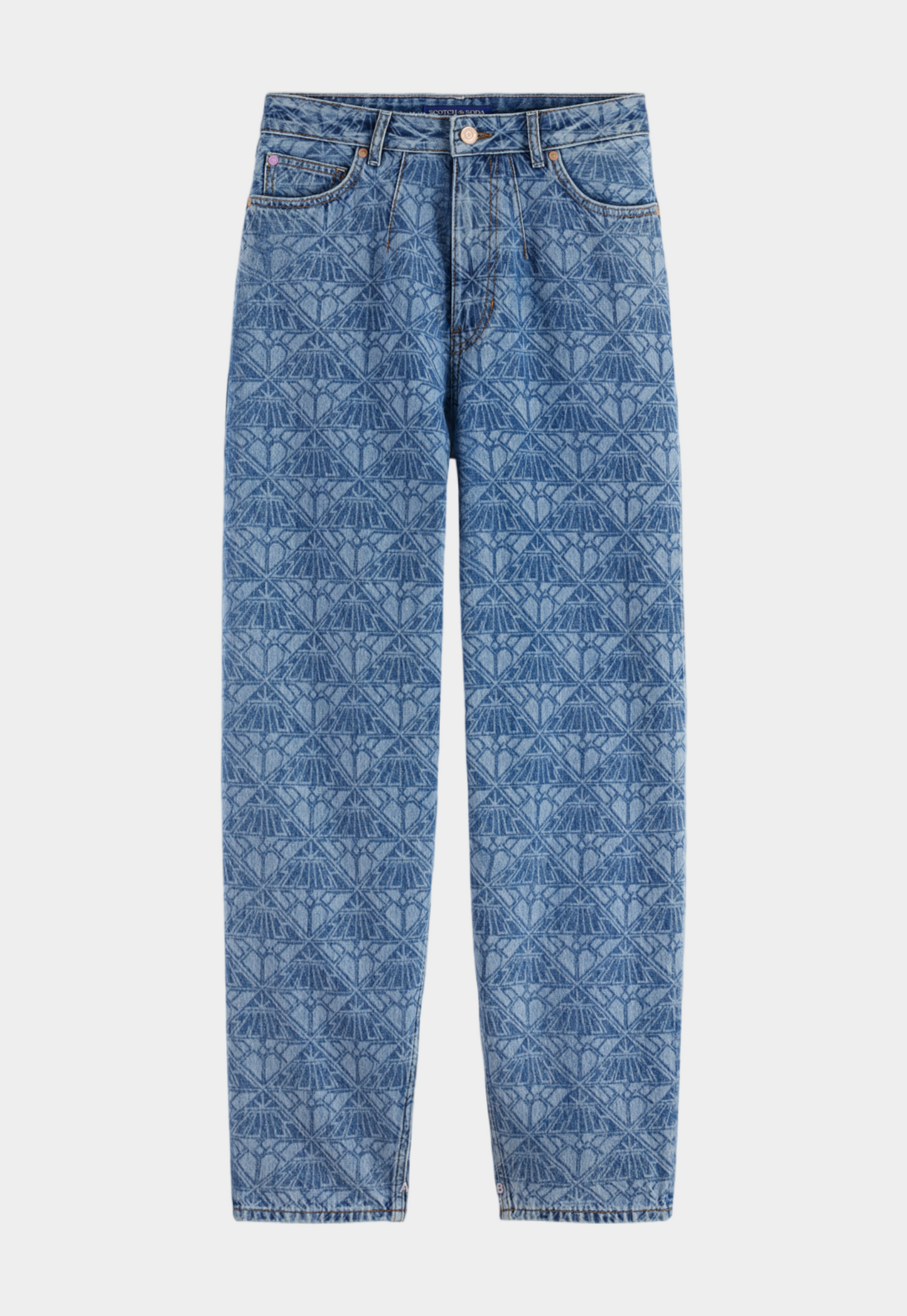 ג'ינס ארוך לנשים מבית המותג סקוצ' אנד סודה. בגזרת בלון, עם רוכסן סגירה וכפתור. עם שני כיסים קדמיים ואחוריים. לג'ינס הדפס אול אובר.