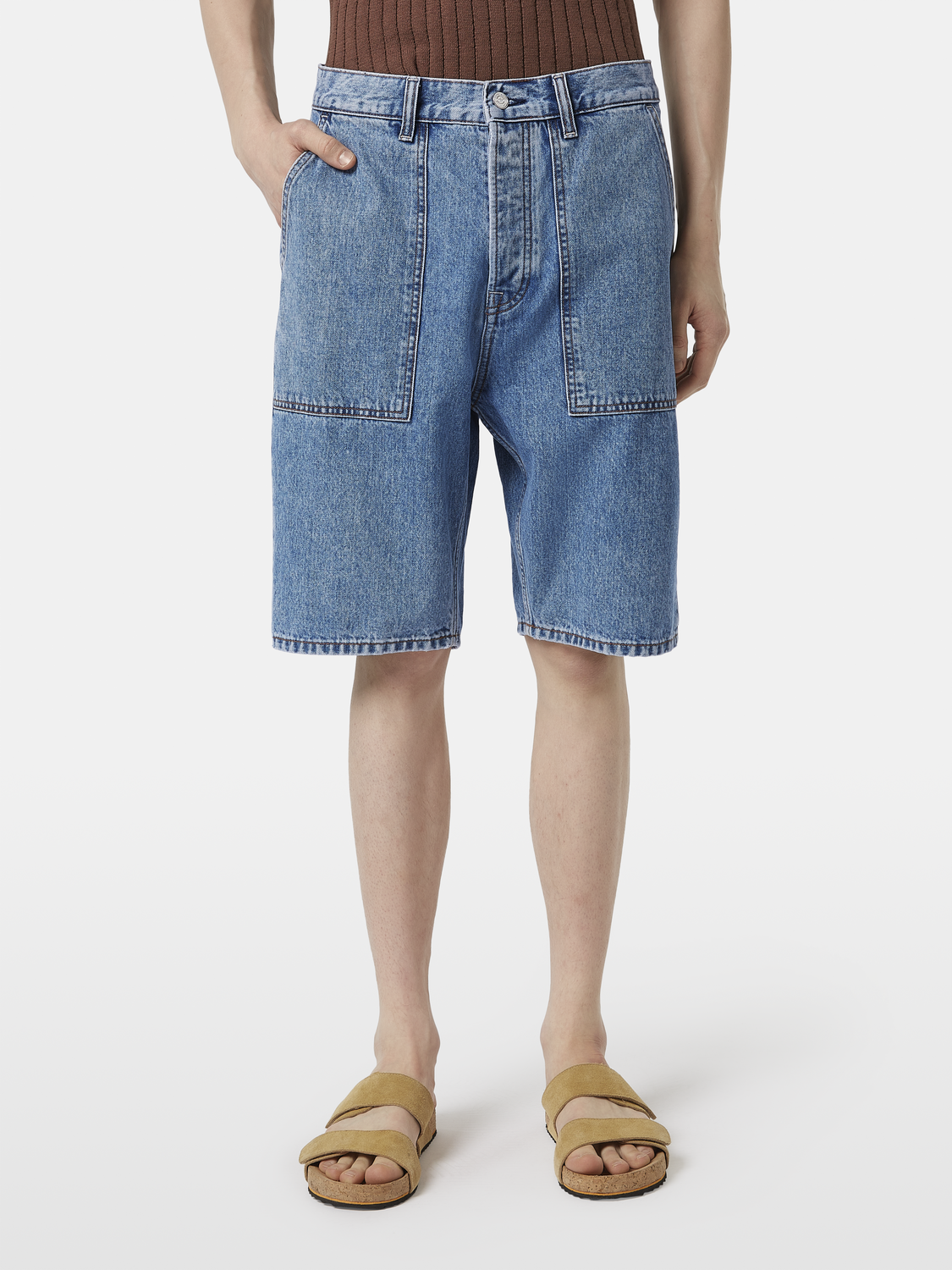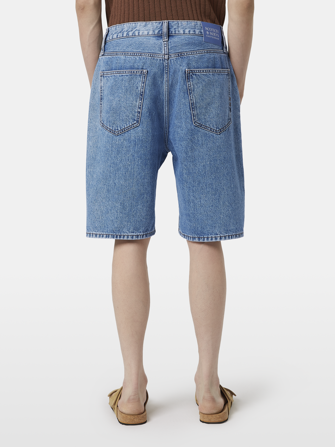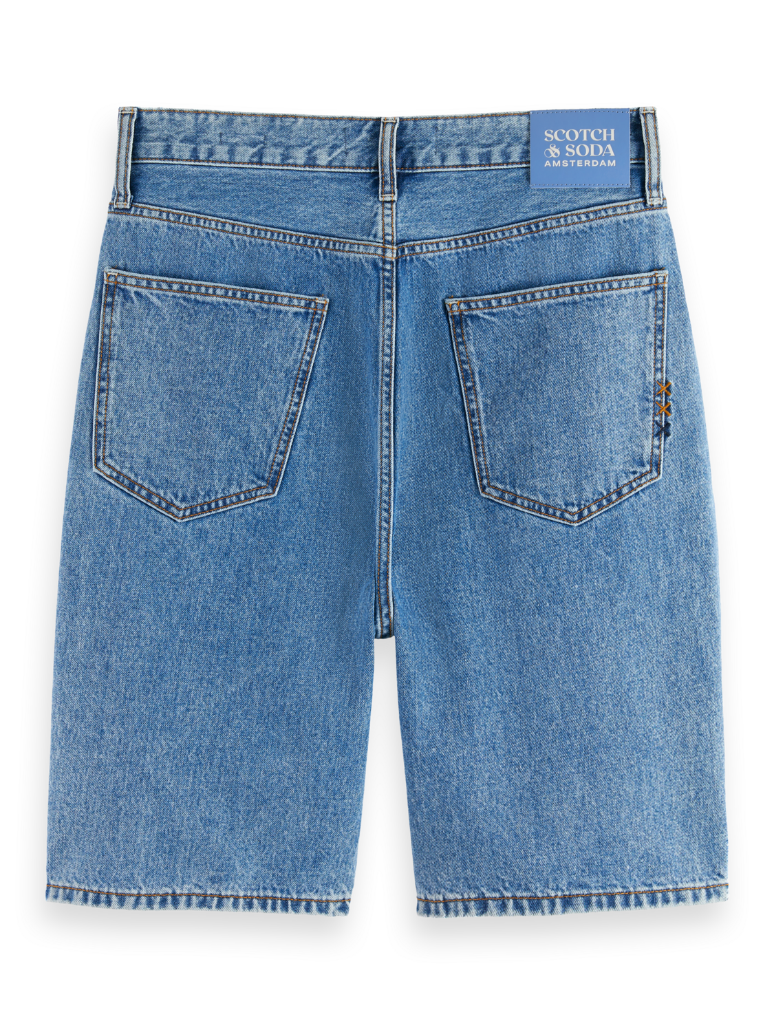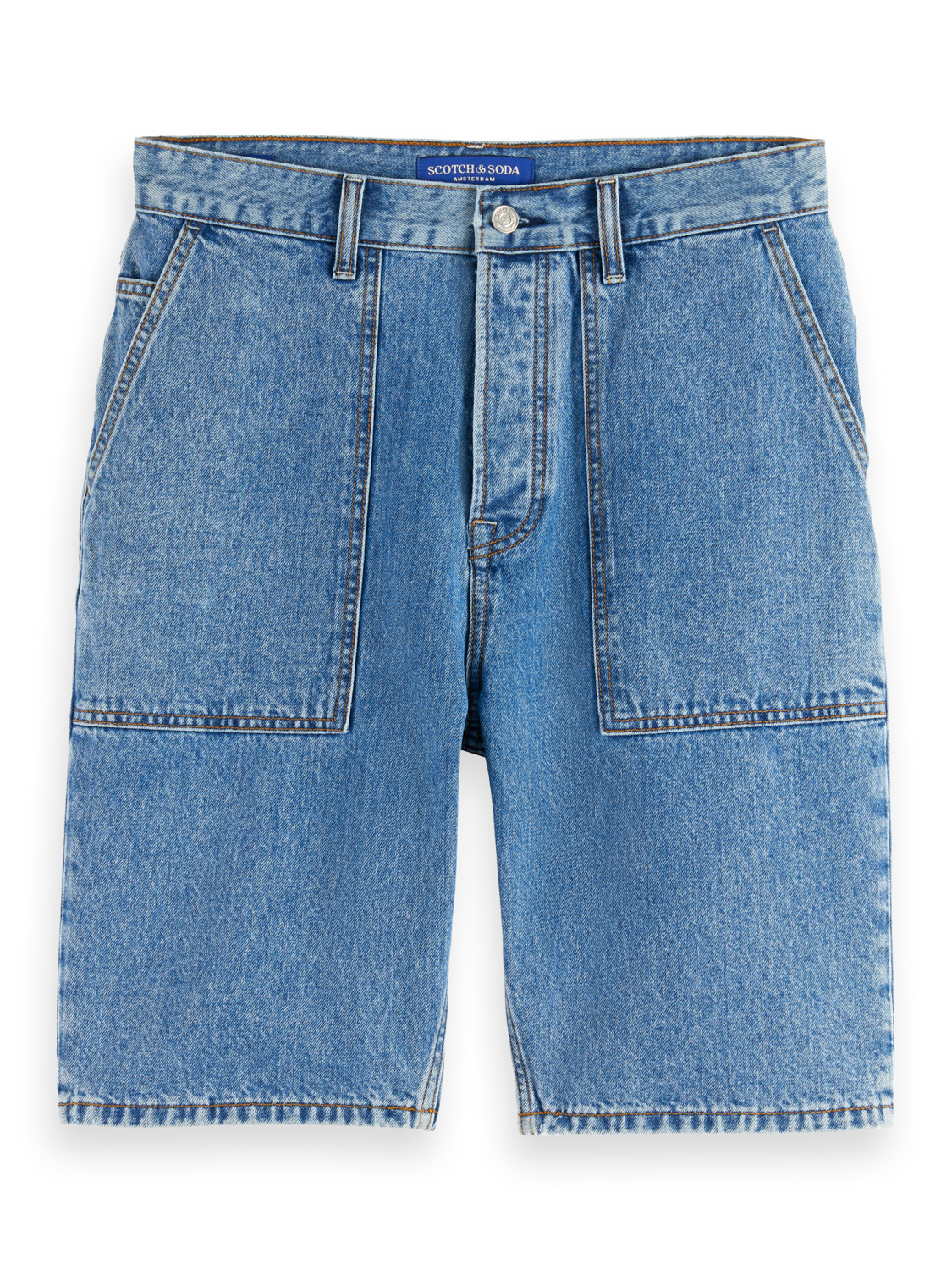 ג'ינס קצר לגברים מבית המותג סקוצ' אנד סודה. בגזרת ברמודה, עד הברך, עם סגירת רוכסן וכפתור, ושני כיסים קדמיים רחבים ושניים אחוריים.