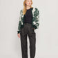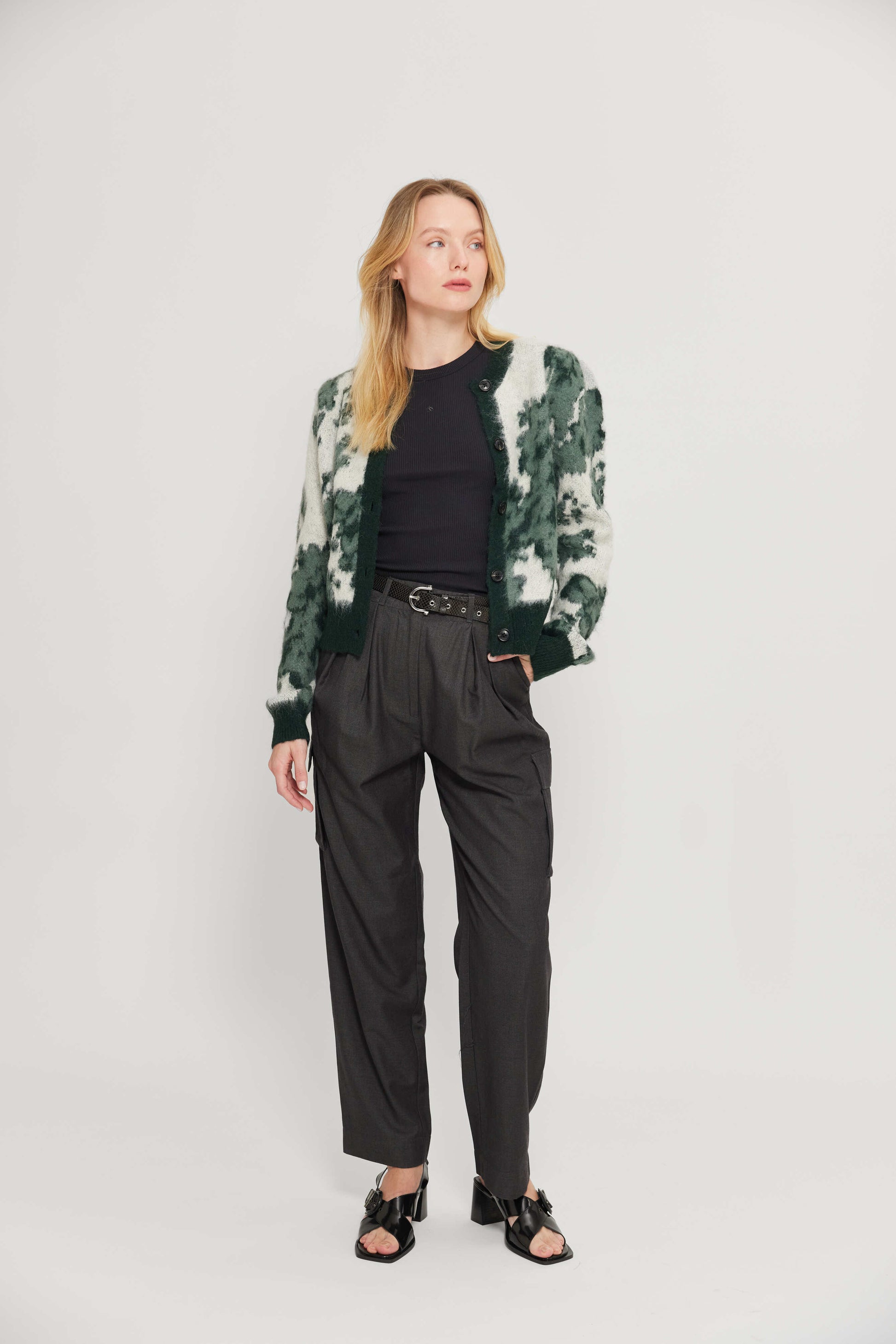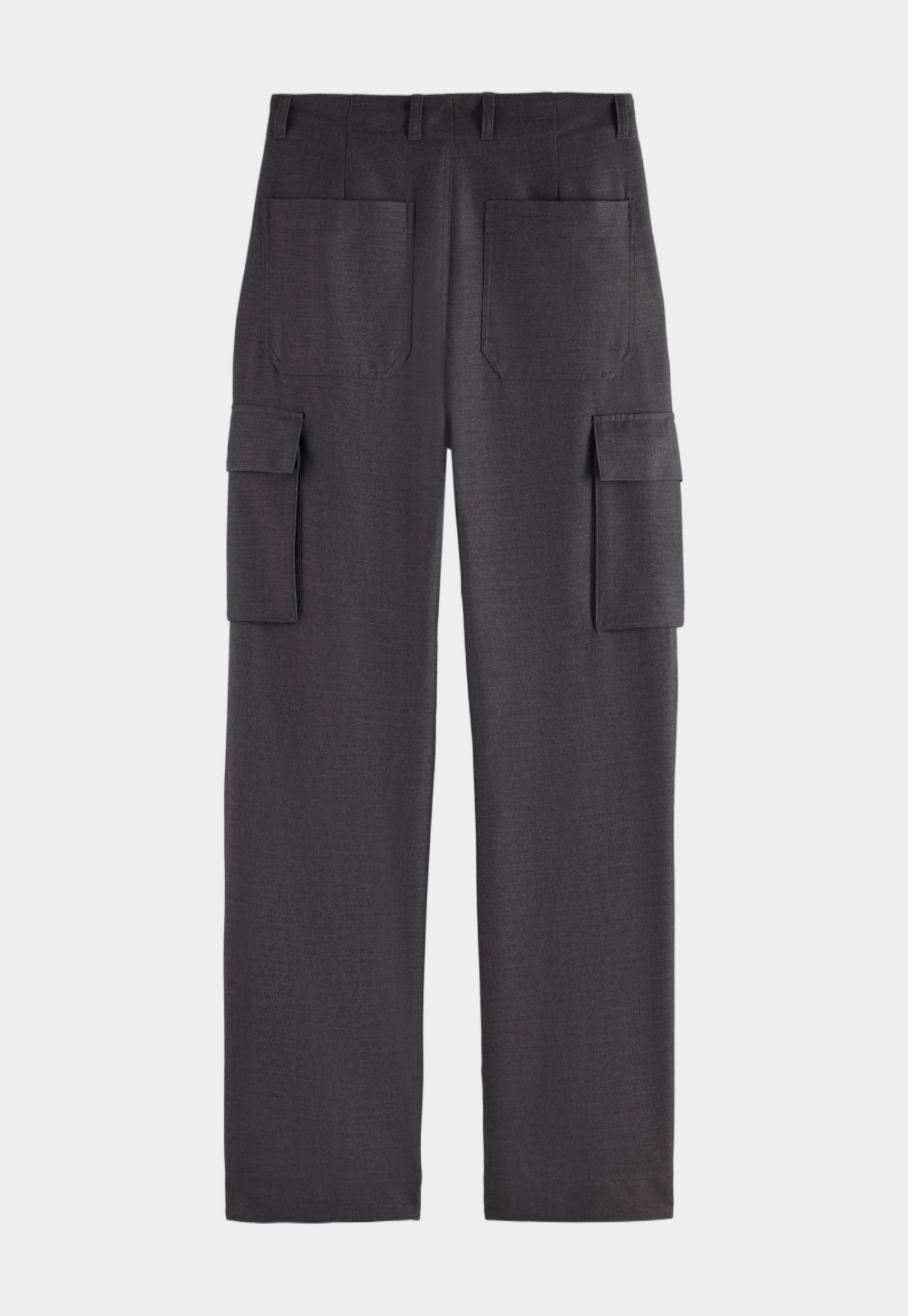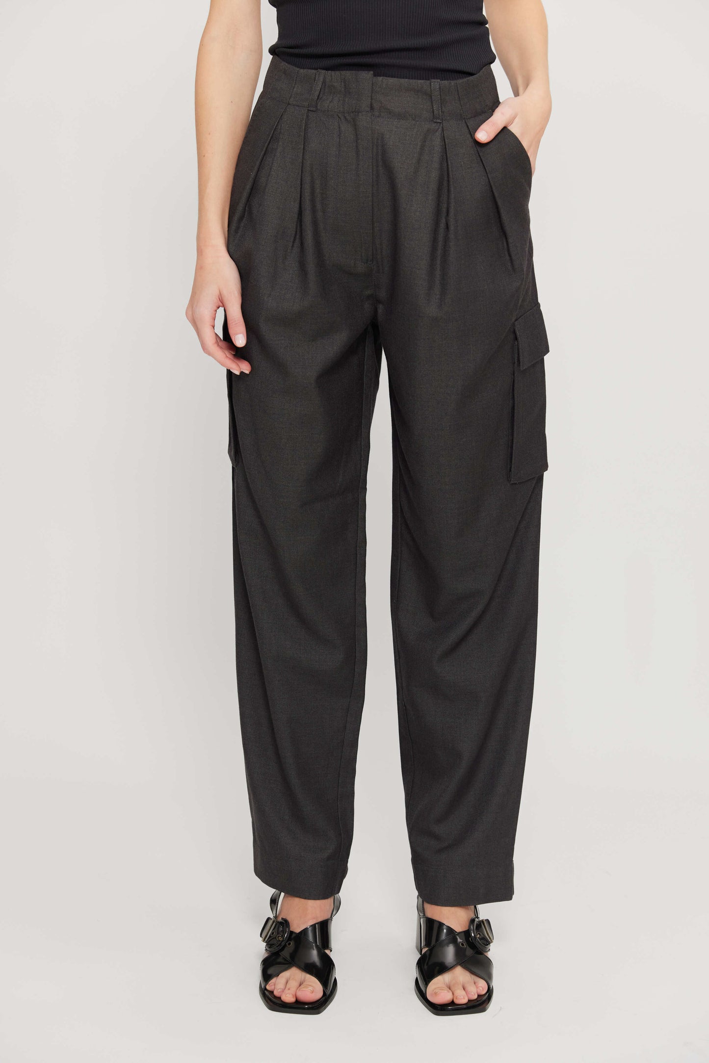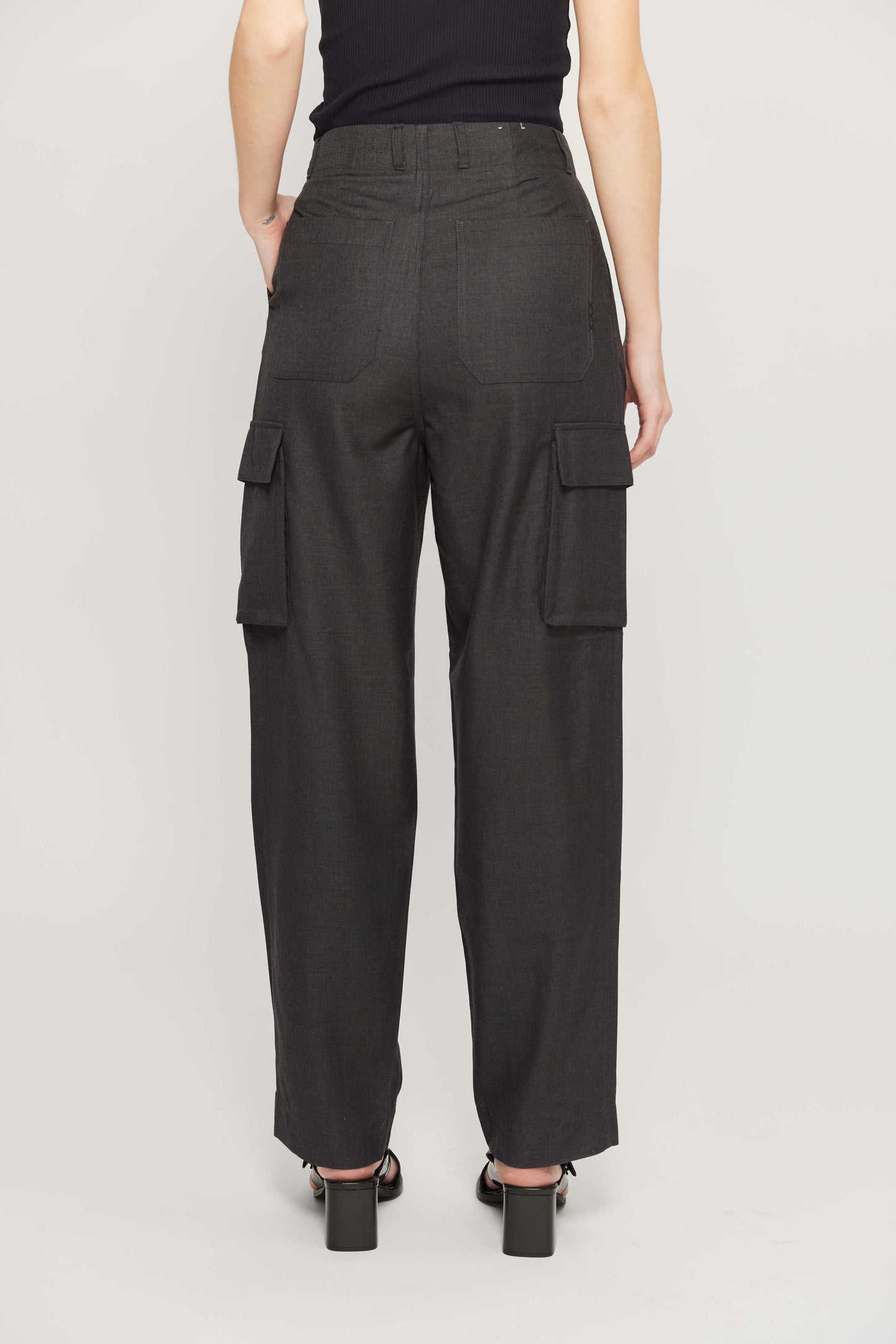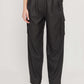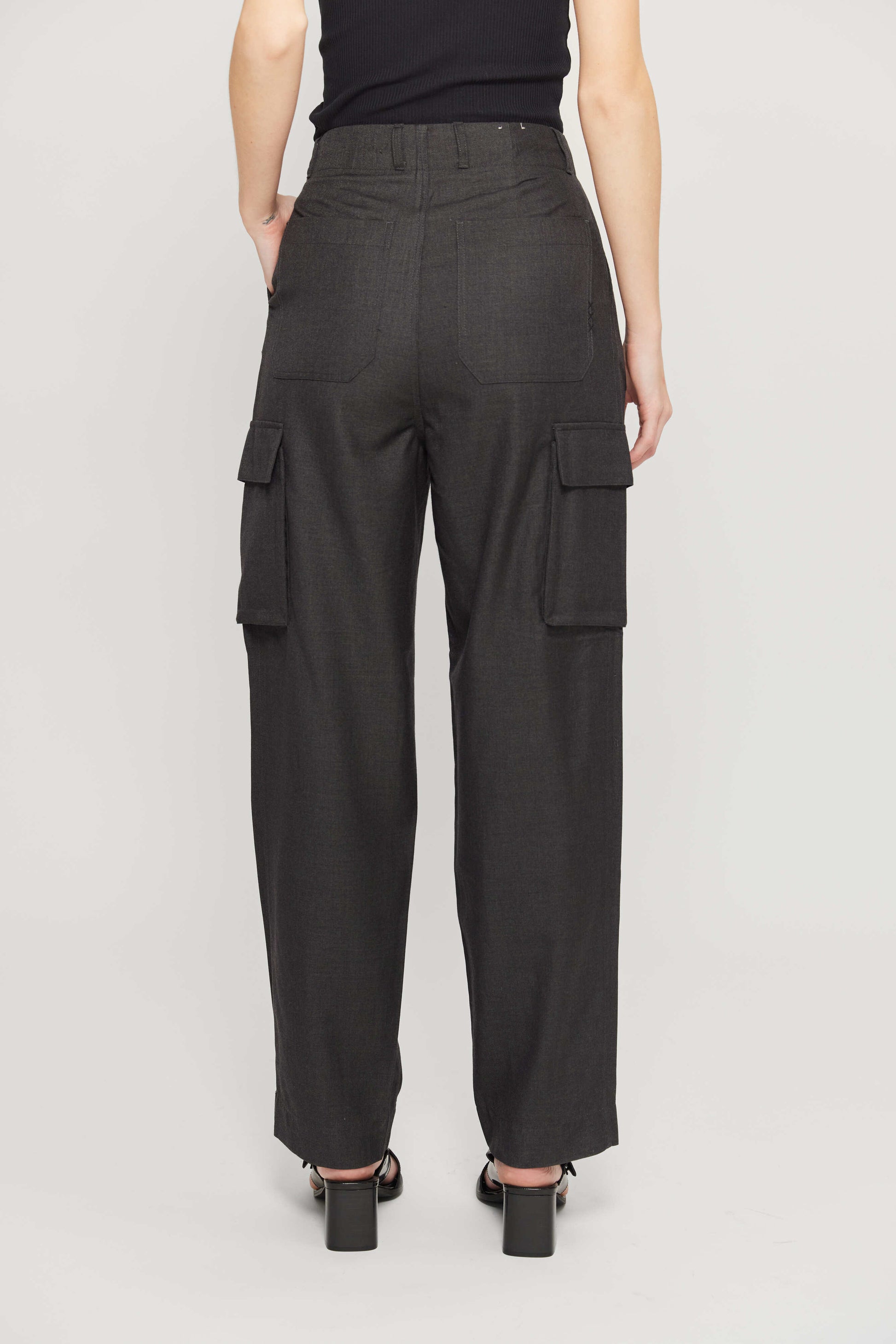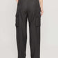 מכנסי קרגו ארוכים לנשים. בגזרה גבוהה, עם כיסים בצידי המכנסיים.