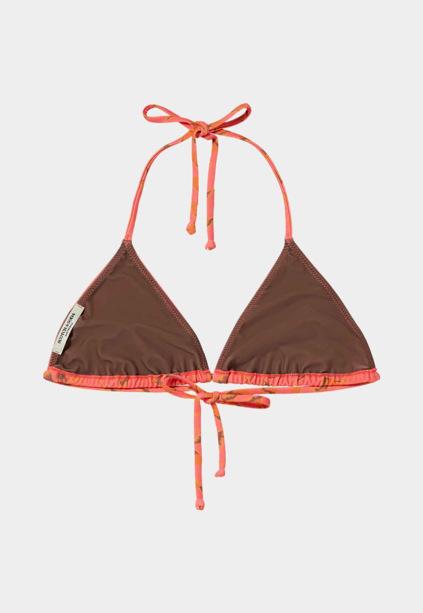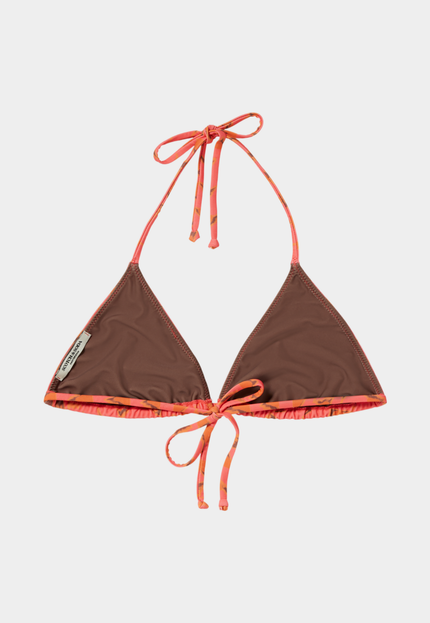 בגד ים ביקיני חלק עליון דו צדדי מבית המותג סקוצ' אנד סודה. בגזרת משולשים קלאסית, בד דו צדדי, צד אחד כתום מודפס. צד שני חלק בצבע חום.