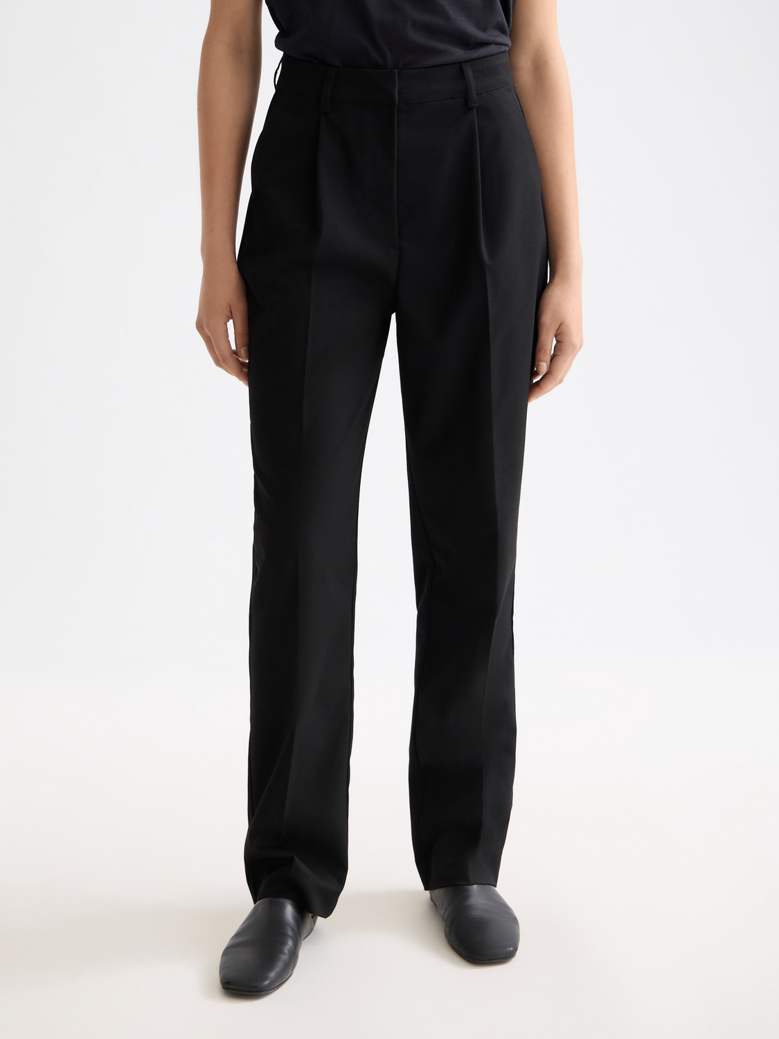 בגזרה גבוהה ונינוחה, עם רוכסן במותן, לולאות לחגורה ושני כיסים קדמיים.
