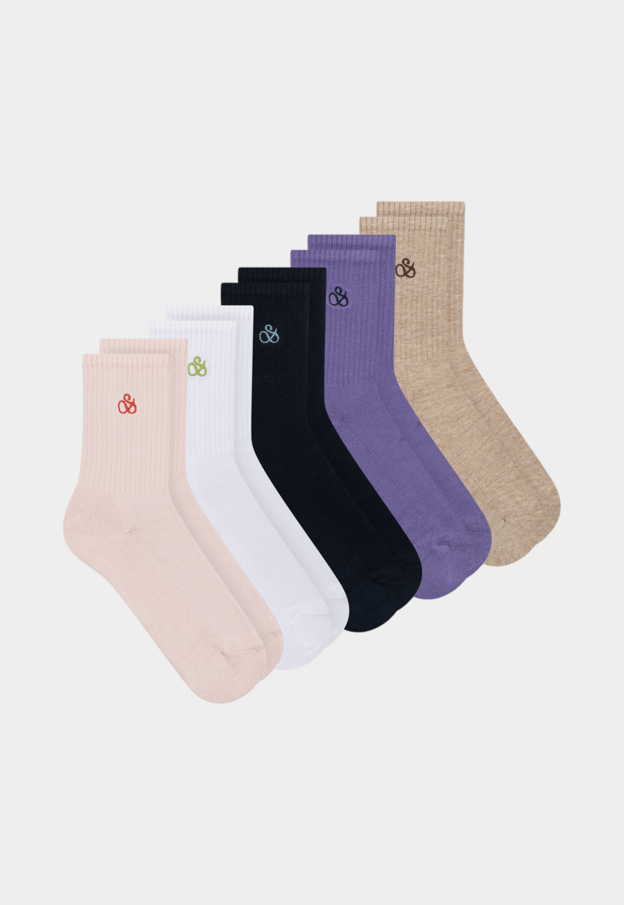 מארז 5 זוגות גרביים מבית המותג סקוצ' אנד סודה. באורך 1/2 בגווני לבן, שחור, סגול, בז' וורוד - בשילוב לוגו המותג בחזית.
