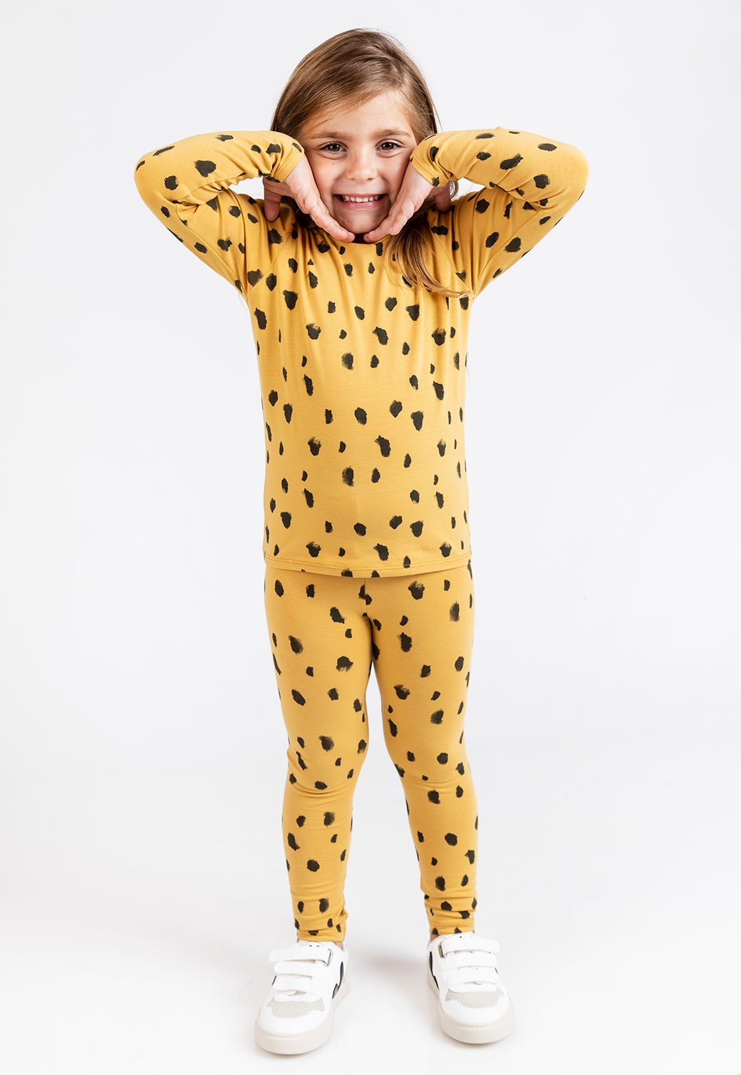 טייץ ארוך מהקולקציה המשותפת של סטורי X מיננה, גומי אלסטי במותן ופרינט משמח לכל האורך. 95% כותנה 5% אלסטין. הדוגמנית לובשת מידה: 4-5 Y.
