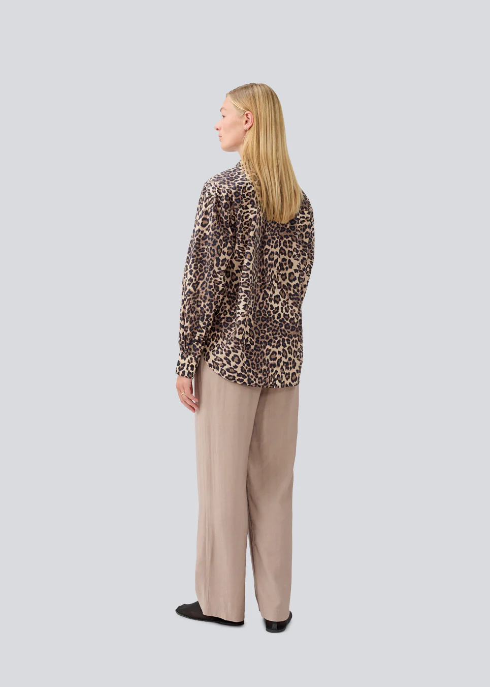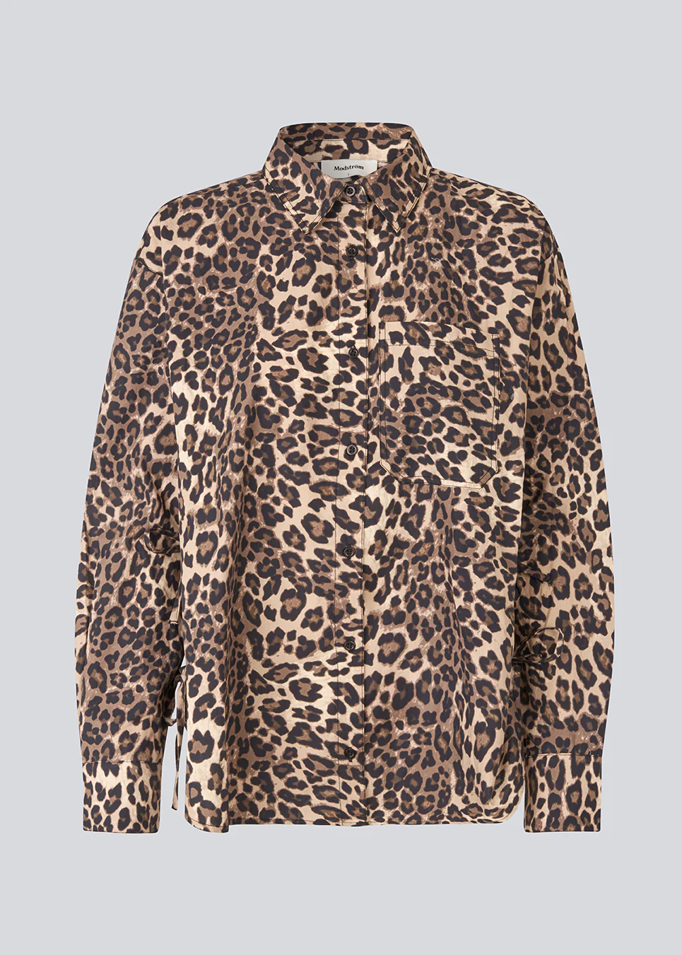 חולצה מכופתרת ארוכה לנשים מבית המותג מודסטרום. בגזרת אוברסייז, עם כפתורי סגירה לכל האורך, עם צווארון קלאסי וסיומת צמודה בשרוולים. בהדפס מנומר.