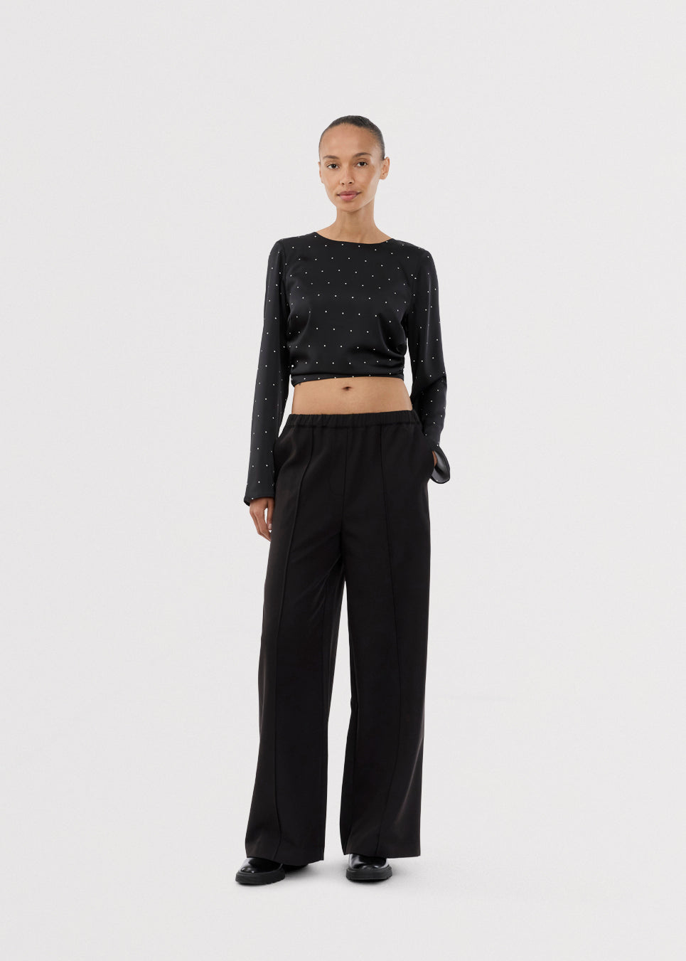 מכנסיים ארוכים לנשים מבית המותג מודסטרום, בעיצוב רחב ונקי בגוון שחור קלאסי.