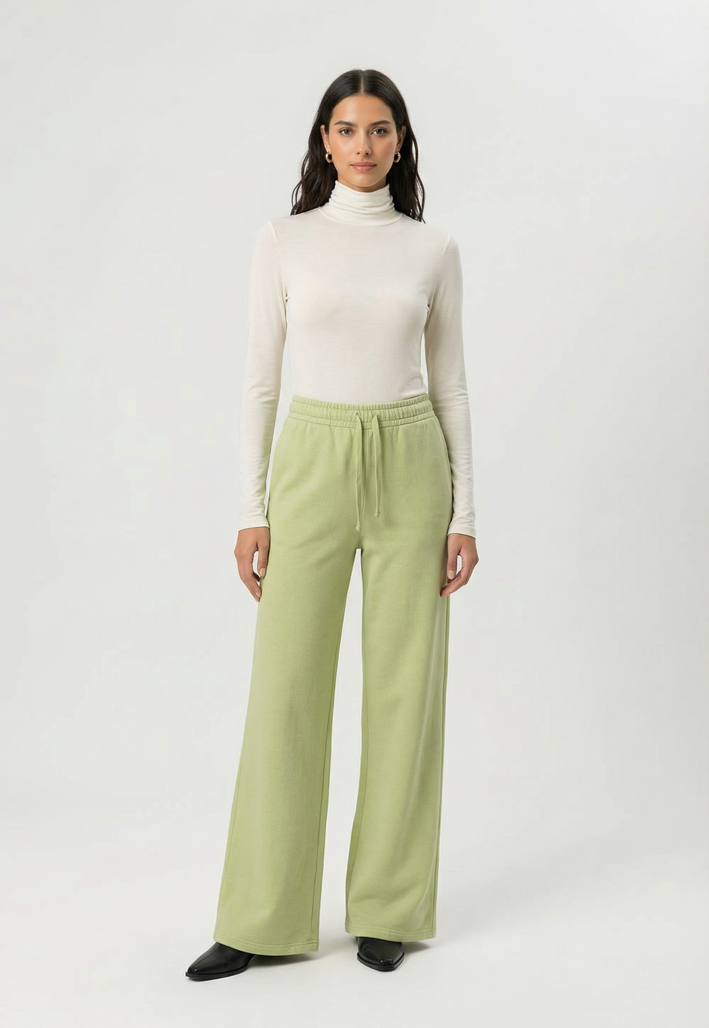 מכנסי סווטשירט לנשים מבית המותג מודסטרום, בגוון ירוק בהיר, עשויים כותנה אורגנית רכה ונעימה למגע.