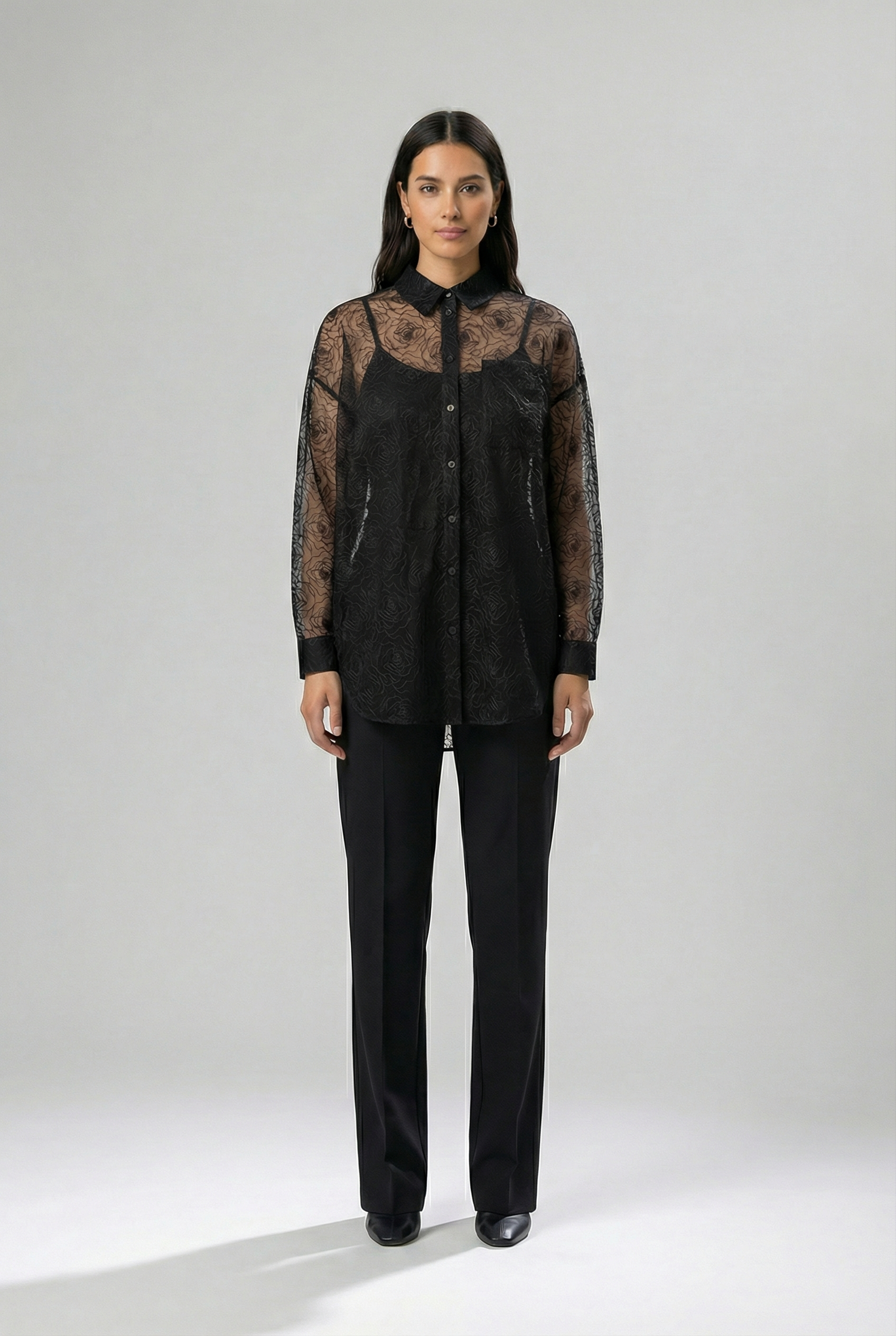 הדגם עשוי בד שקוף וקליל, כולל צווארון קלאסי וסגירת כפתורים, עם רקמת ורדים מדויקת שמוסיפה עניין מבלי להכביד. הגזרה הרחבה יוצרת מראה מודרני ונינוח.