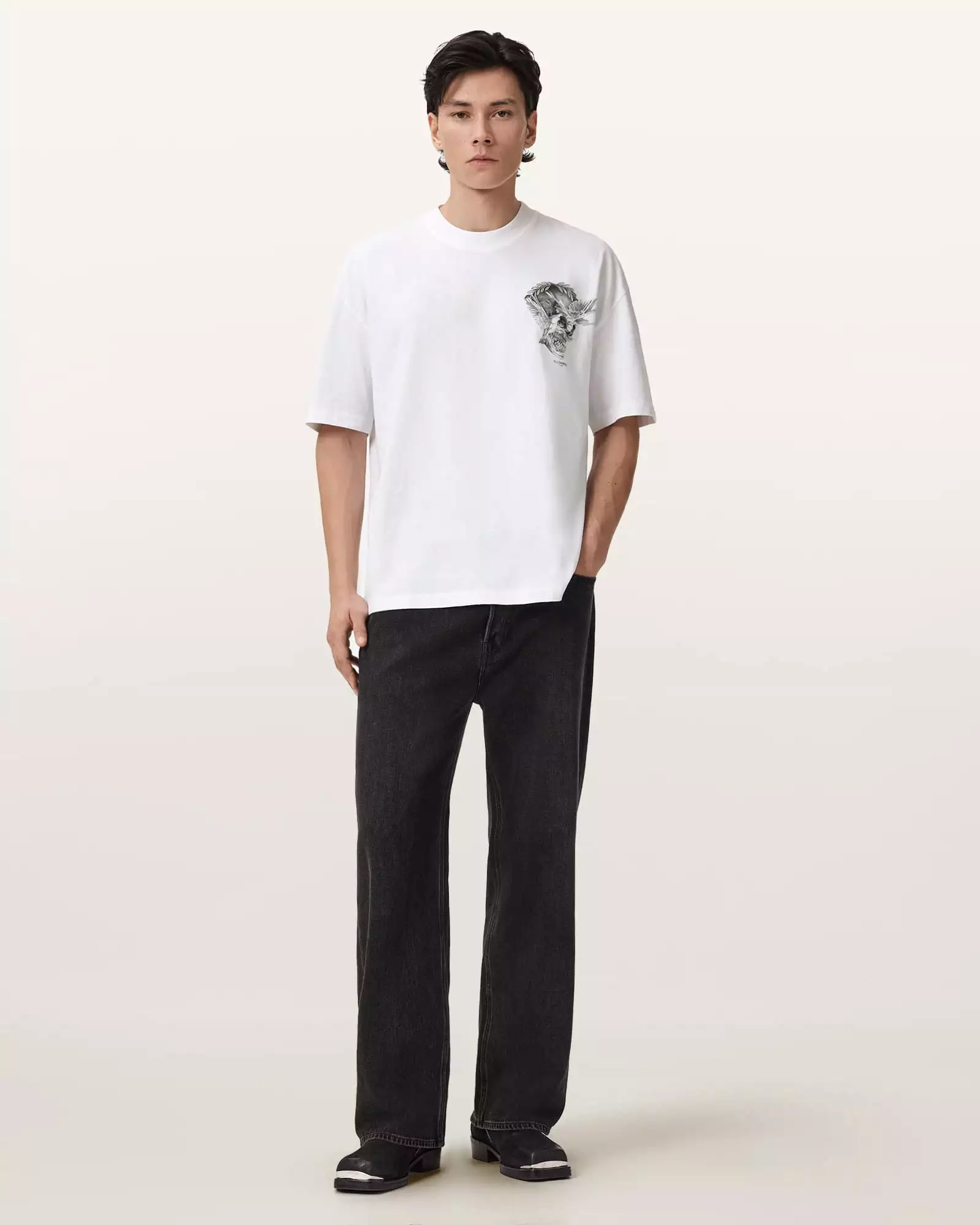 בגזרה משוחררת עם צווארון עגול, הדפס גרפי של המותג מלפנים ומאחור.