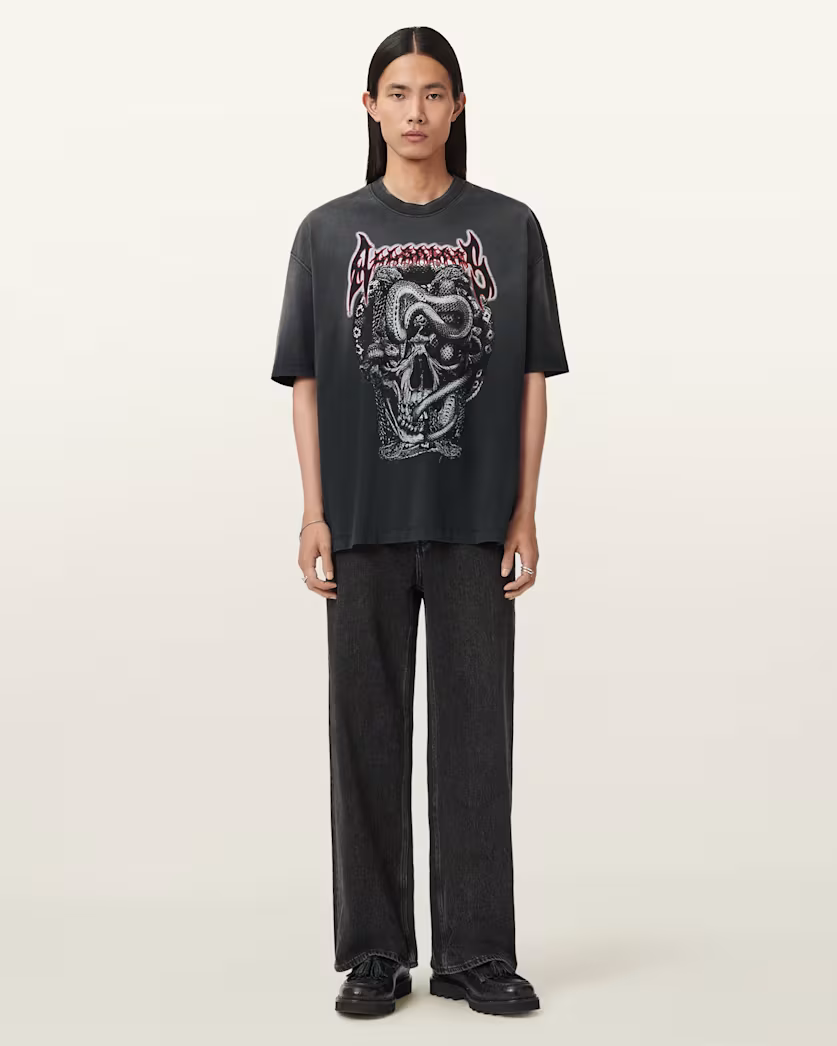 גזרת אוברסייז, עם מפתח עגול, שרוולים קצרים, בשילוב הדפס בהשראת מטאל.