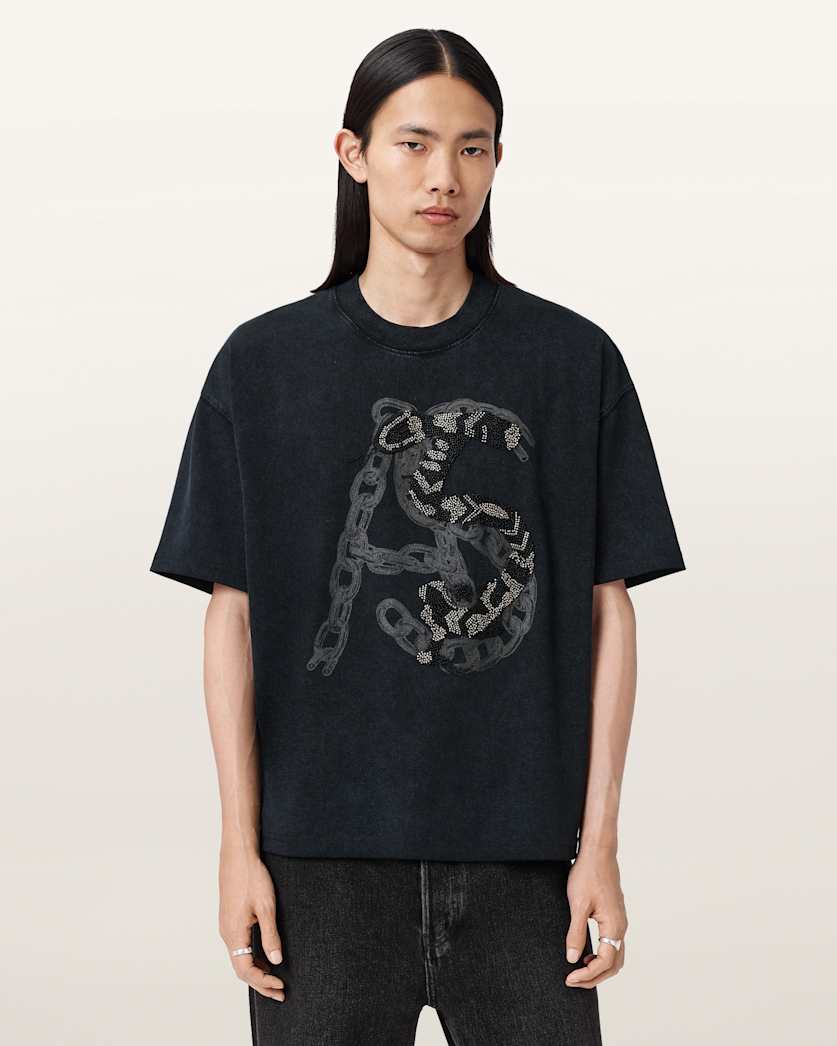 טי שירט מבית המותג AllSaints, דגם Scale בעיצוב גרפי עם נוכחות אורבנית מודגשת.