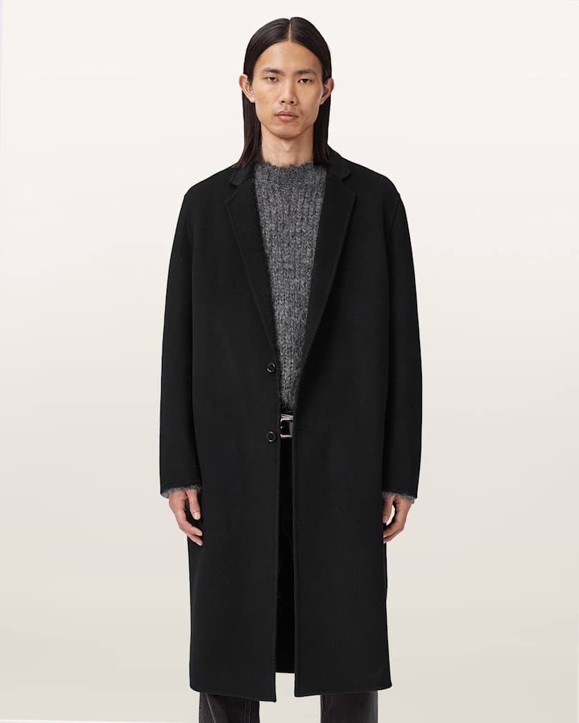 מעיל צמר בגזרה רפויה עם סגירת כפתורים וצווארון לפל קלאסי, כולל שני כיסים קדמיים ופרט עור עדין בגב.