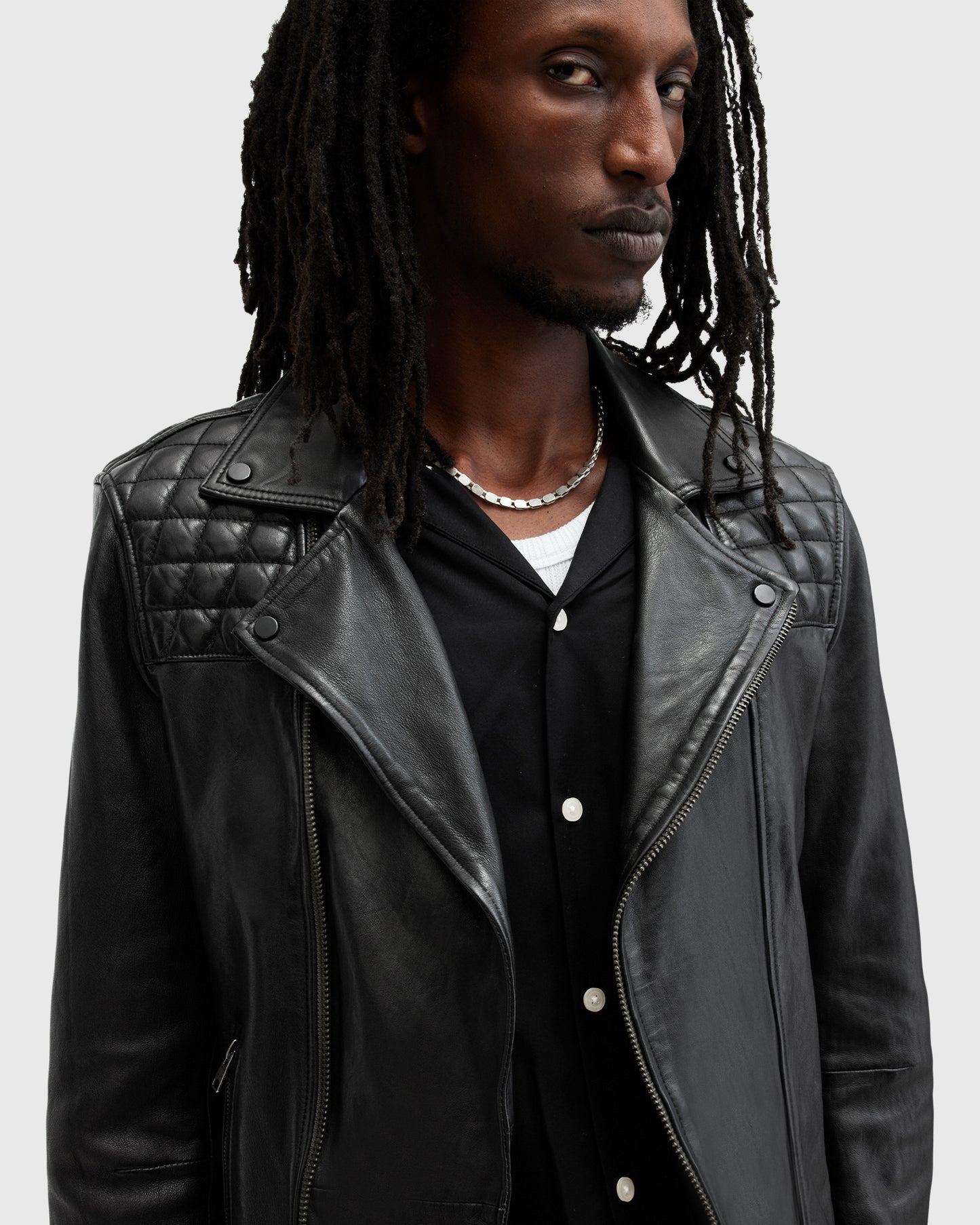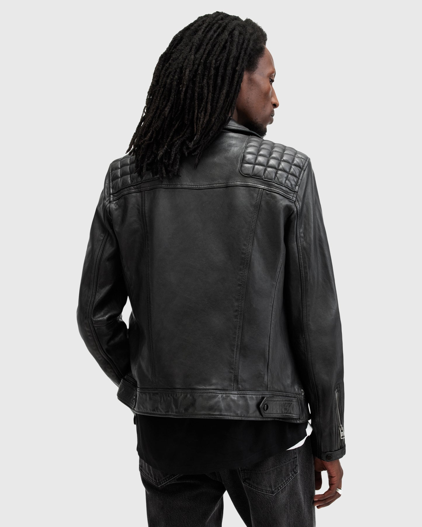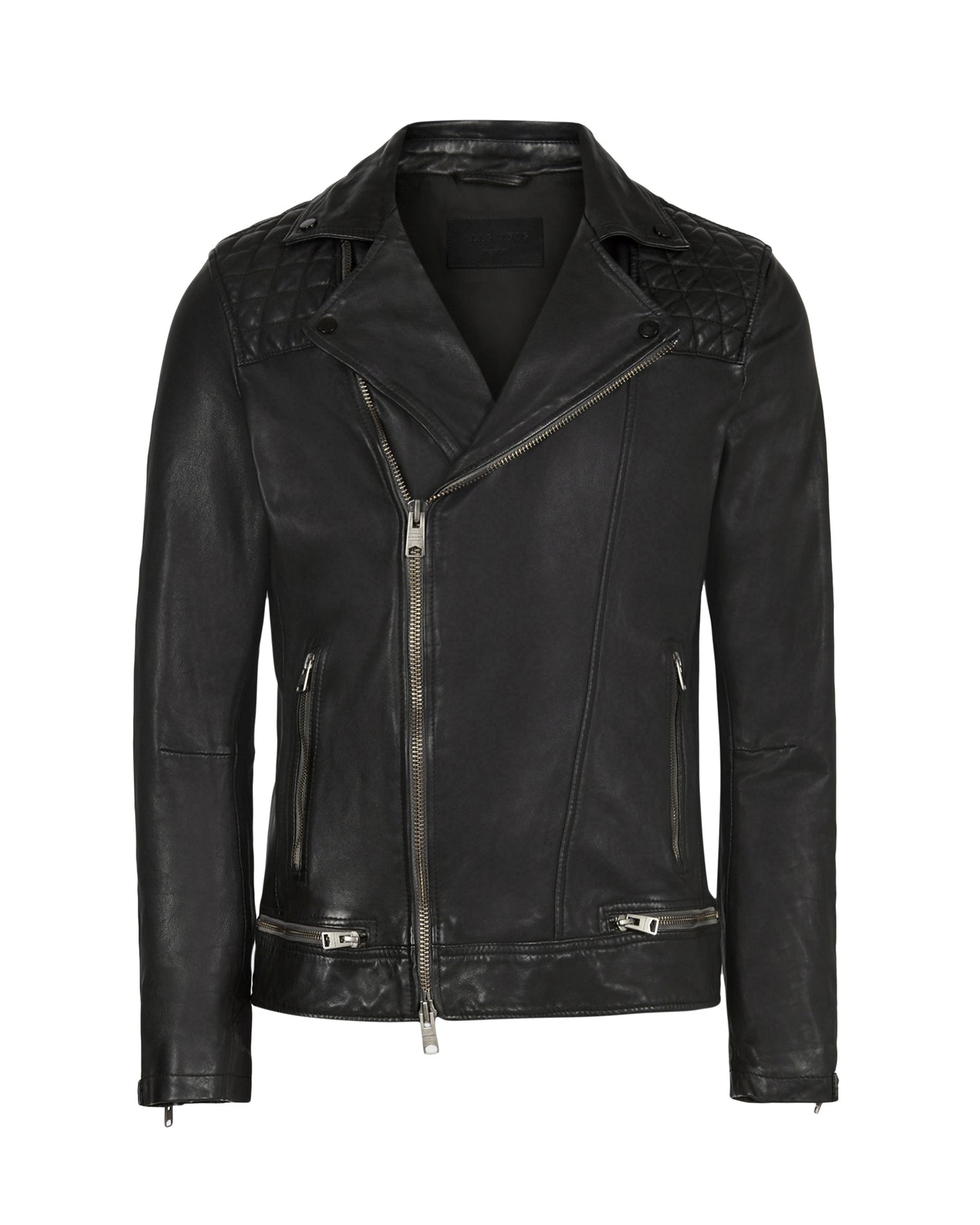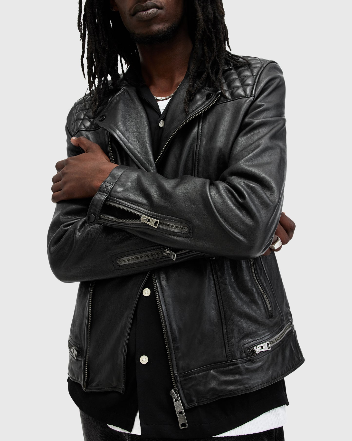 ג'קט עור לגברים מבית המותג אולסיינטס. צווארון קלאסי, סגירת רוכסן לכל האורך ושני כיסים קדמיים בסגירת רוכסן. סיומת השרוולים גם בשילוב רוכסנים, לנוחות והתאמה מרבית.